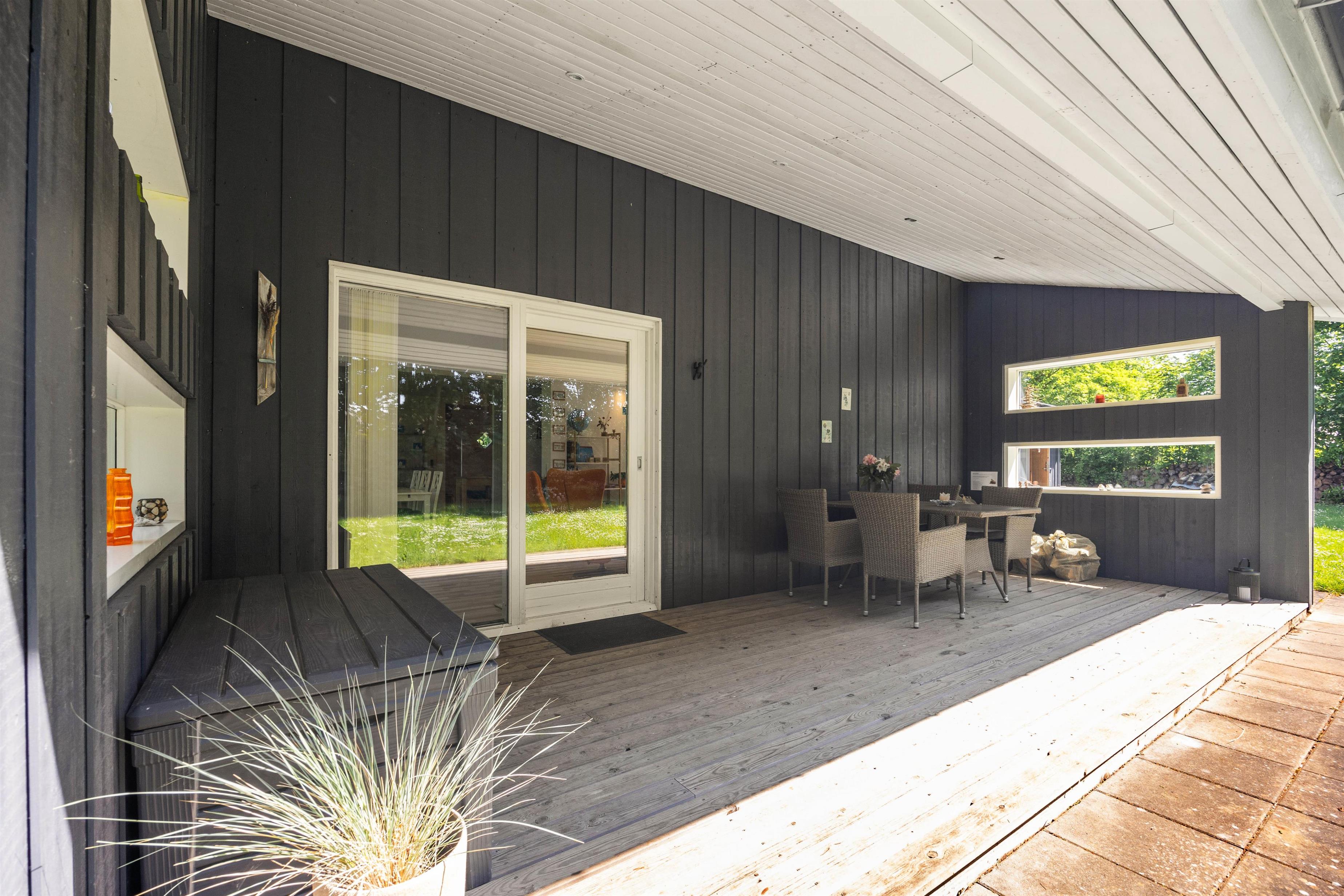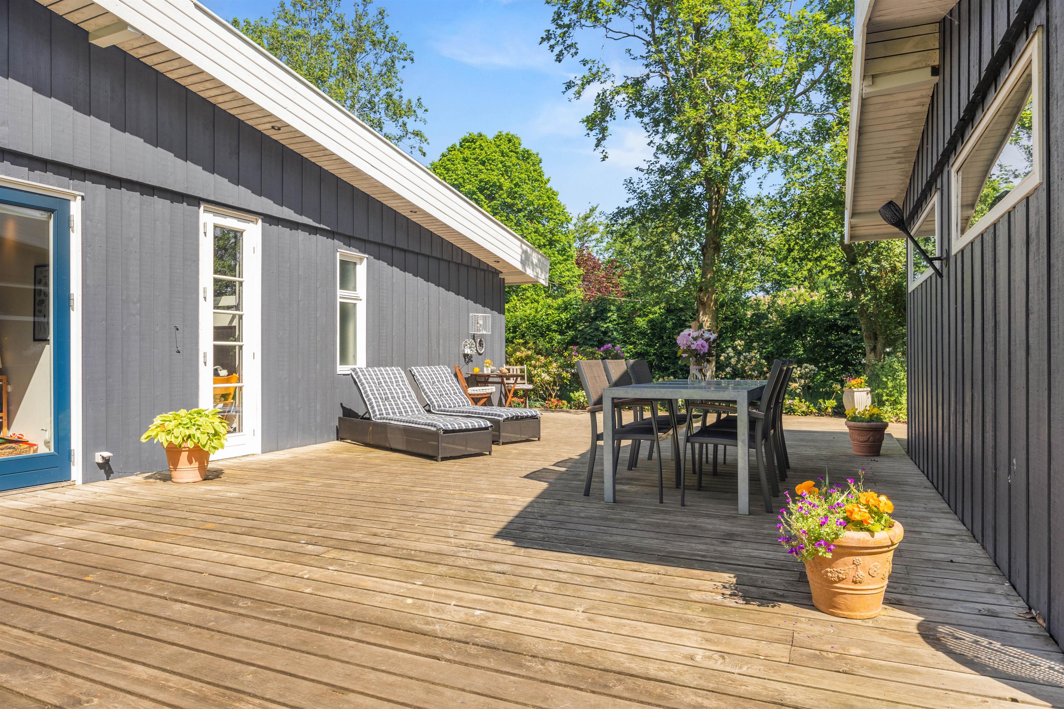 På den 1160 kvadratmeter store plænegrund er der masser af plads til leg og sjov – måske endda en kongespilsturnering? Omkring huset venter flere hyggelige siddepladser på flere terrasser, nogle tilgængelige fra stuen, andre fra spisestuen og endda fra forskellige udgange fra huset. På disse terrasser er der altid en solplet at finde, hvor I kan nyde morgenkaffen i ro og mag.