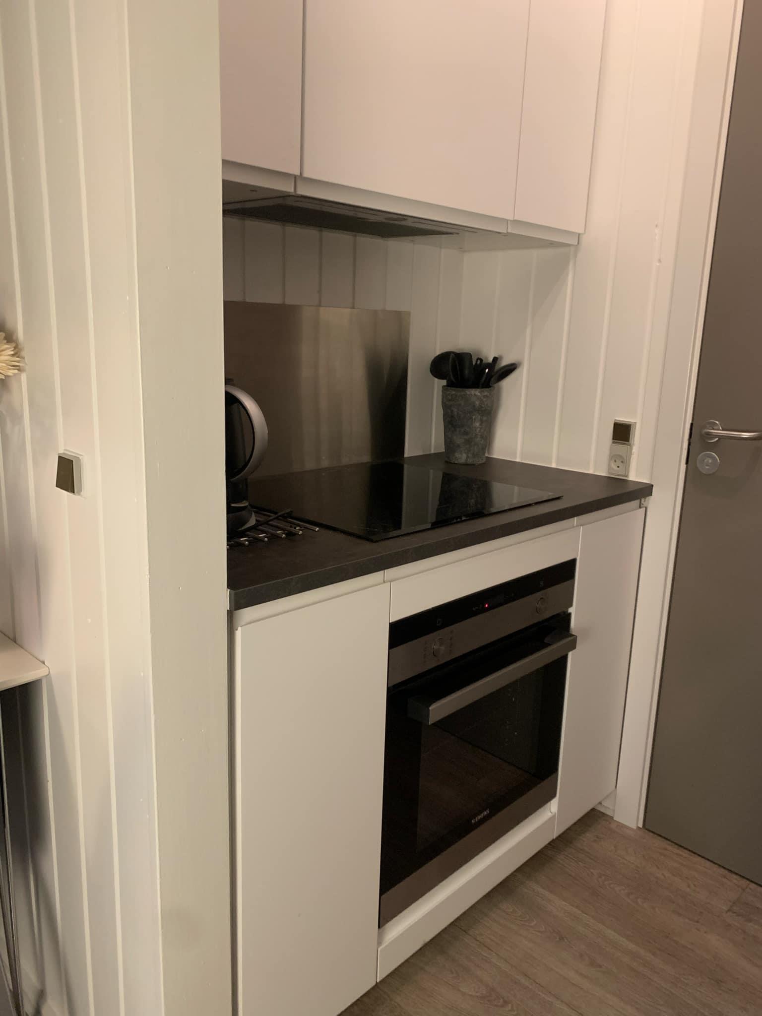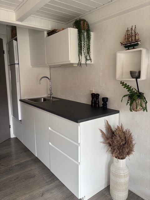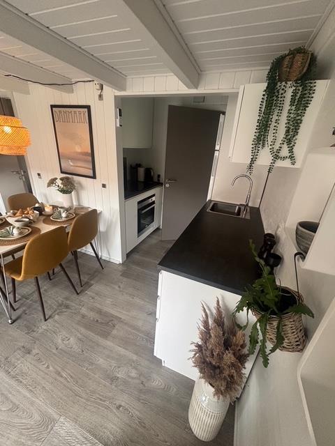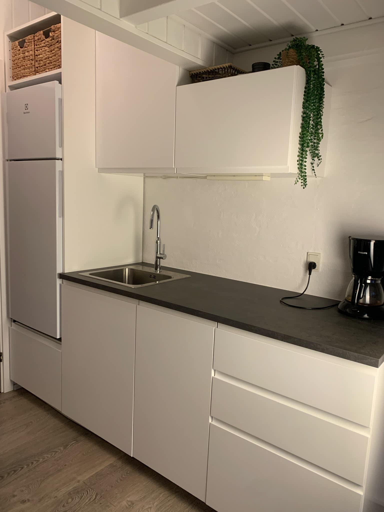 Et fuldt udstyret køkken med bl.a. køleskab og opvaskemaskine