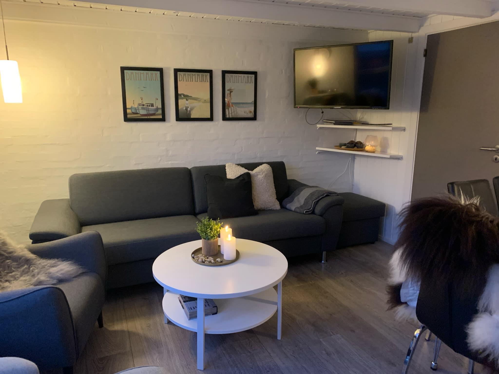 En opholdsstue med fladskærms-tv