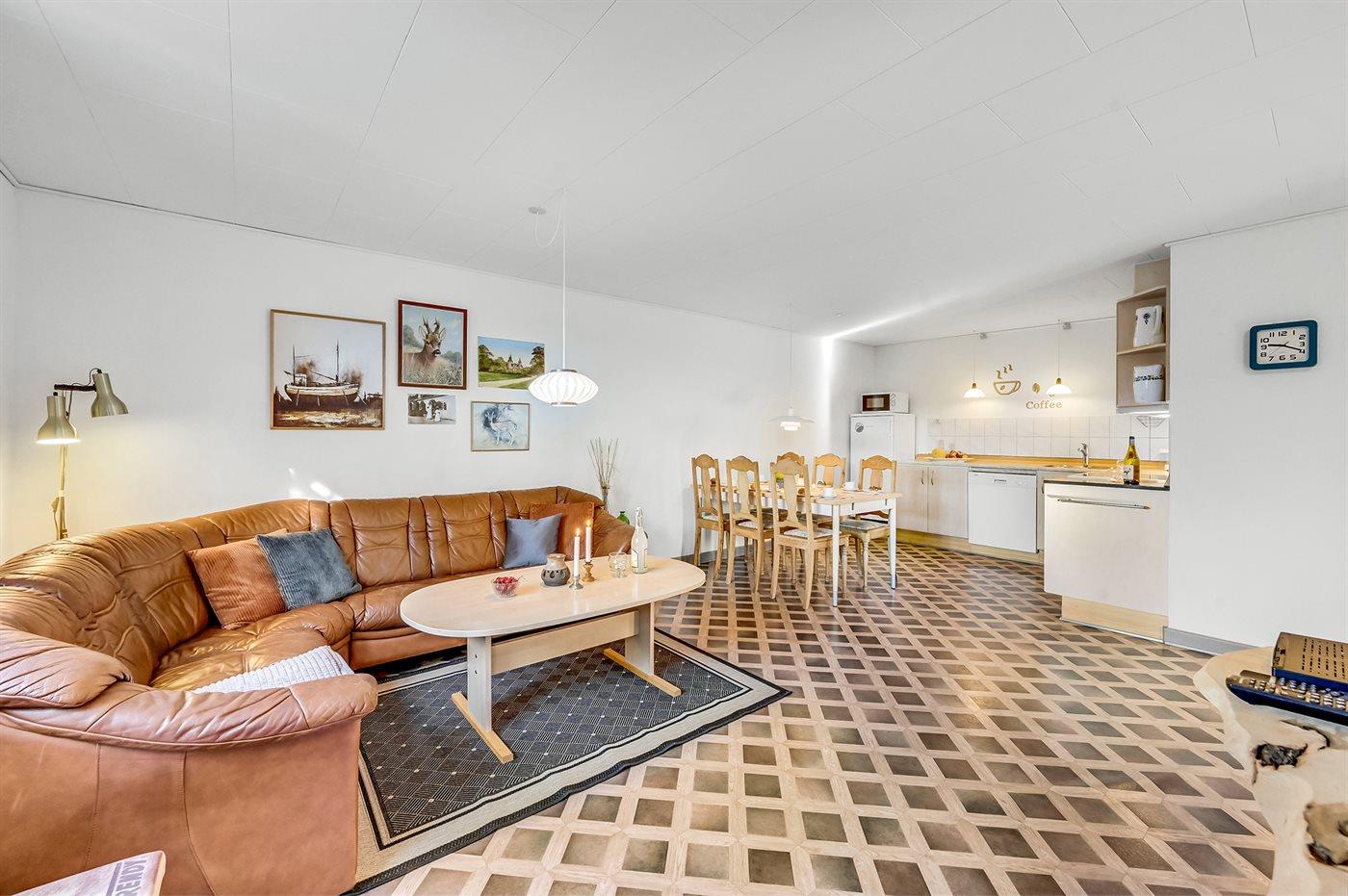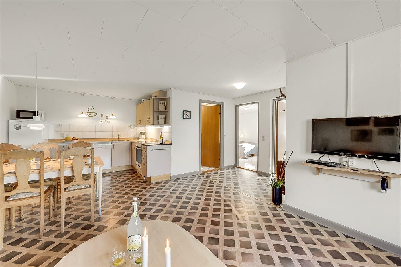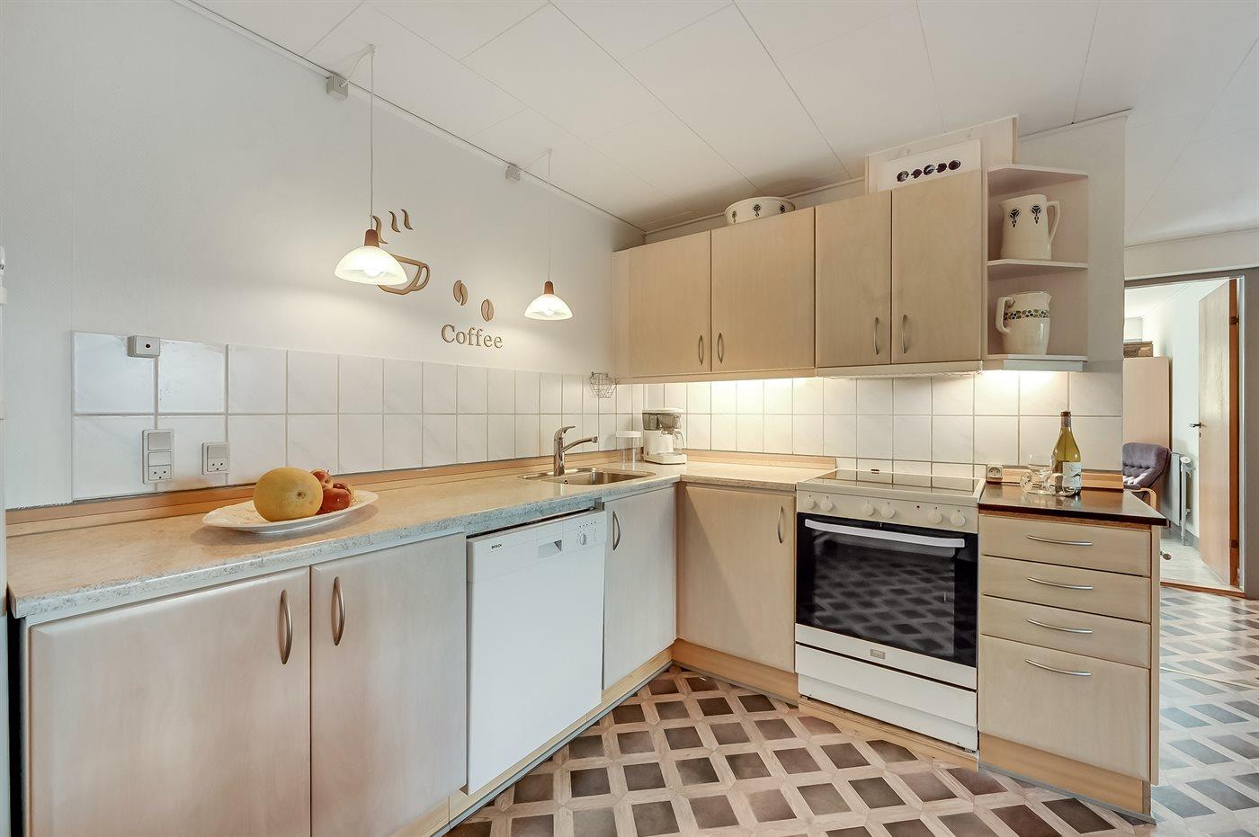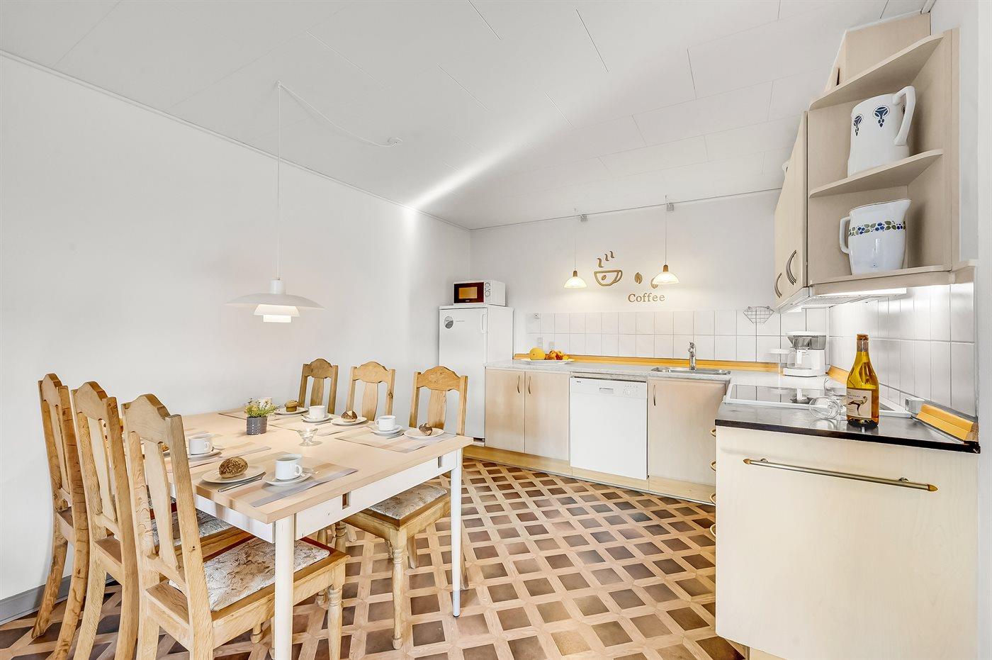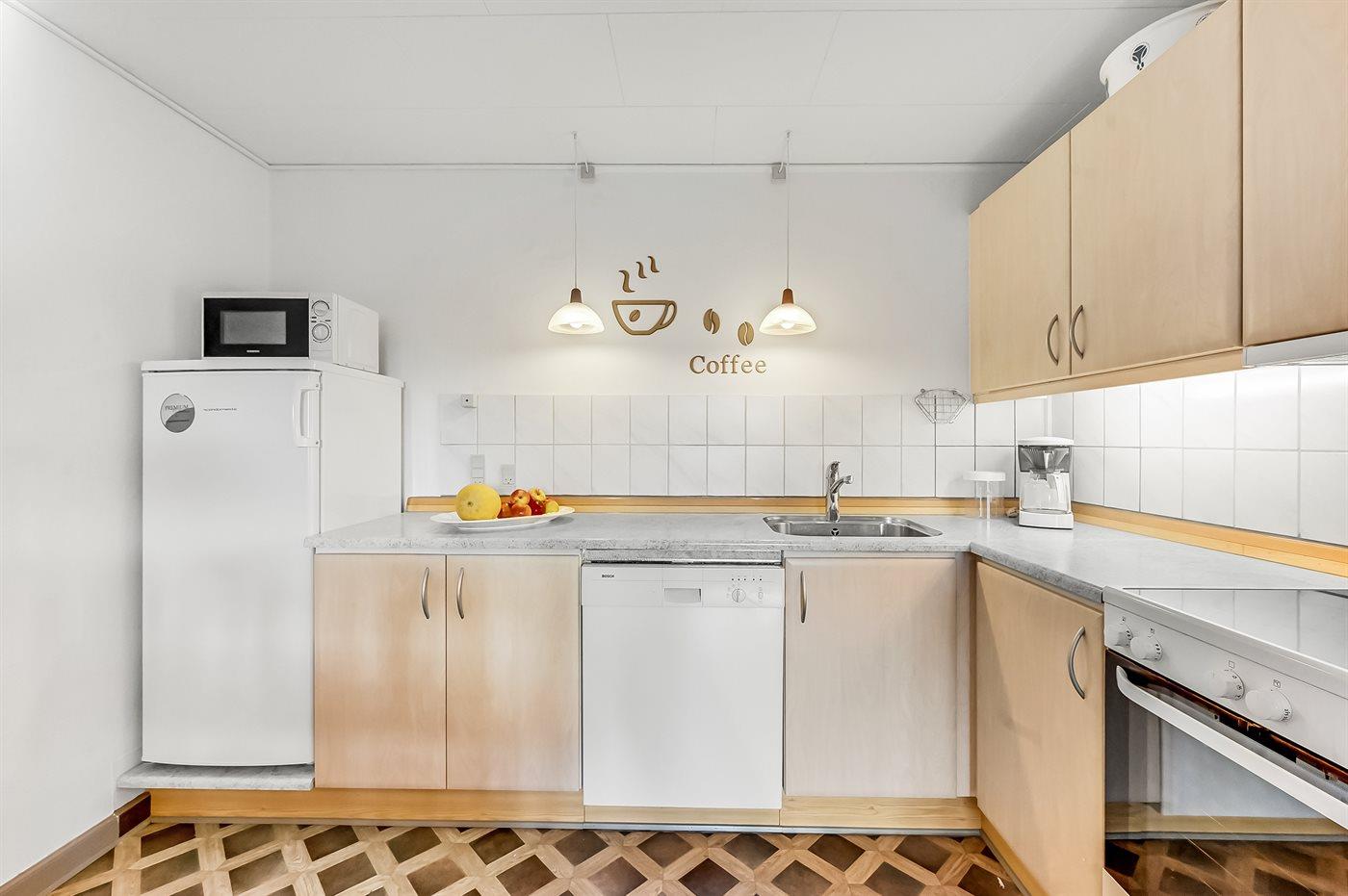 Køkkenet er udstyret med 1 køleskab. Der er 4 keramiske kogeplader, varmluftovn, mikrobølgeovn samt opvaskemaskine.