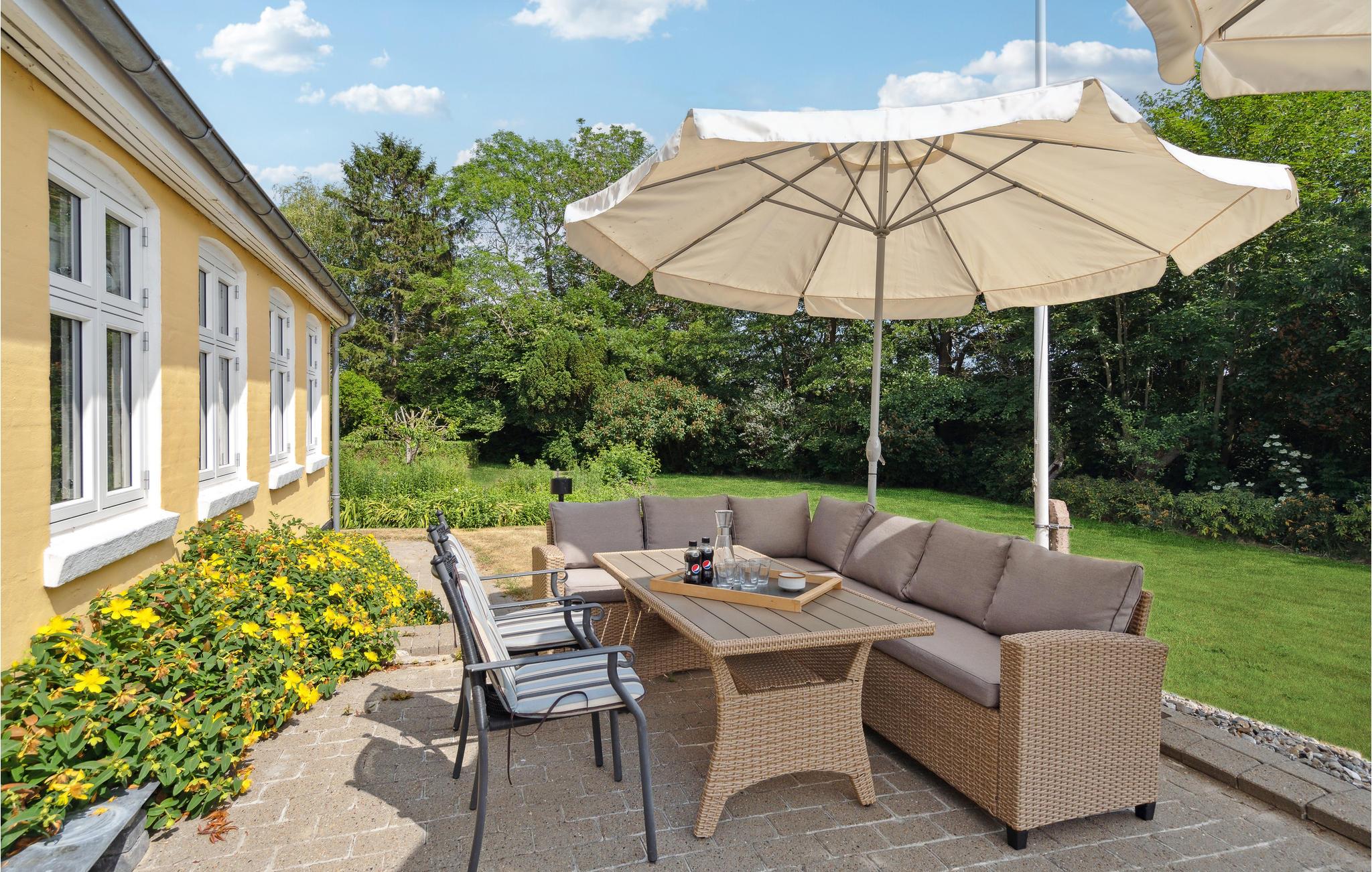 Tæt på den fynske østkyst byder dette smagfuldt indrettede gule feriehus jer velkommen i den lille landsby Kissendrup. Indenfor mærker I med det samme den stemningsfulde atmosfære med en dejlig blanding af varme og lyse farver. Både inde og ude finder I en række gode faciliteter. Lav mad sammen i køkkenet og tilbring en skøn aften med spil og snacks i den store sofakrog. Til huset hører også en gammel vindmølle, hvor der er indrettet et aktivitetsrum med bl.a. bordtennis og bordfodbold. Herfra kan I nyde udsigten over de omkringliggende marker. På solrige dage kan I nyde afslappende timer i den frodige have med flere terrasser og kroge. Ejerens kat går rundt på grunden og bliver fodret dagligt uden at forstyrre jer. Her er plads til familiens spændende fodboldkamp! Slut dagen af på terrassen med udsigt til solnedgangen.