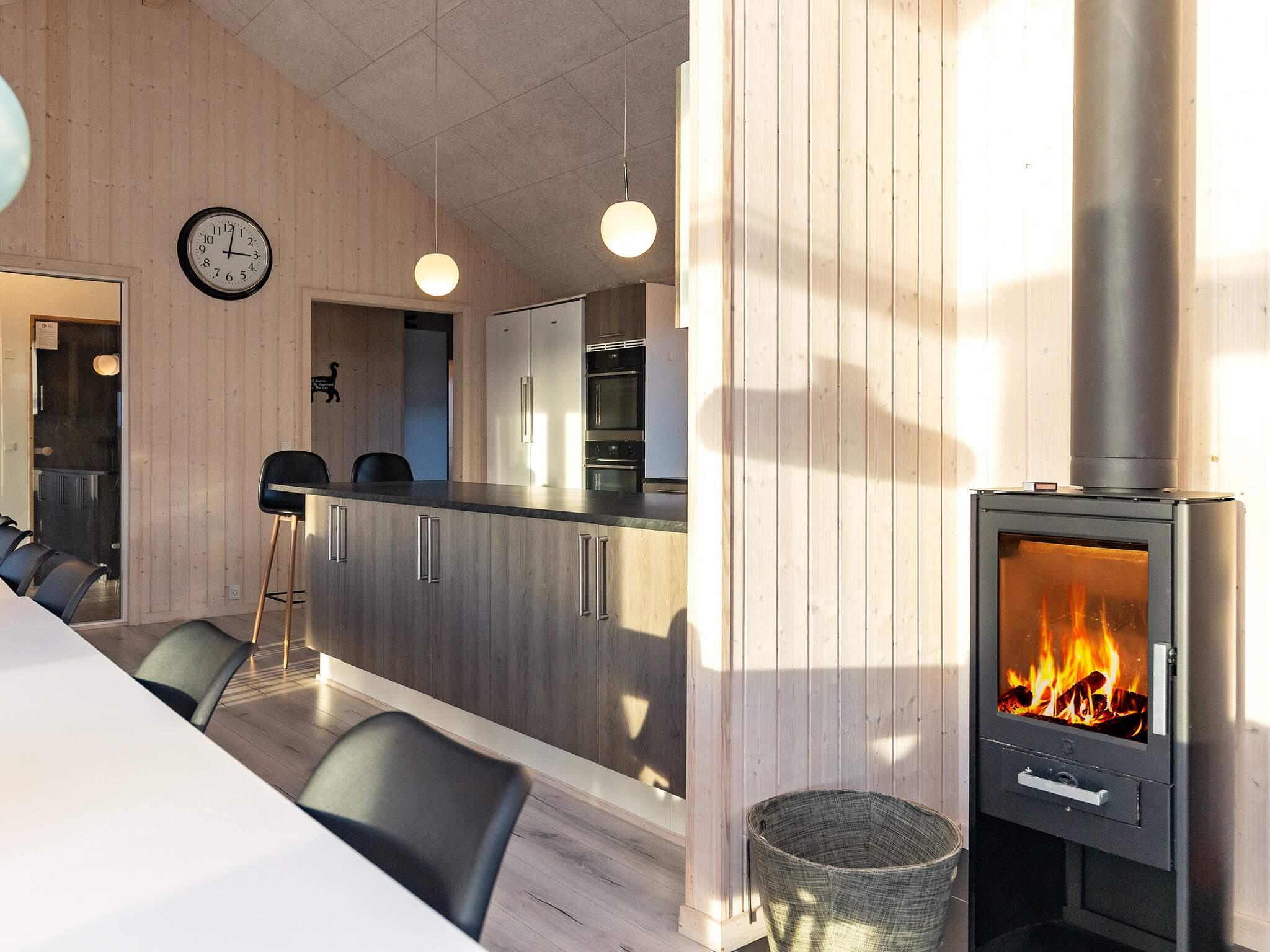 Spise/stuen er smagfuldt indrettet med to høje stole, sofagruppe og brændeovn. Det velindrettede køkken med brændeovn har køleskab og stor fryser samt to opvaskemaskiner og to komfurer, så der er rig mulighed for at lave mad.