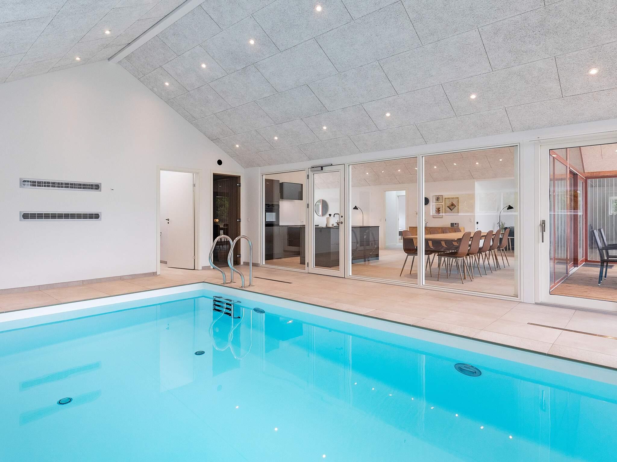 I det populære sommerhusområde Bratten Strand, halvvejs mellem Skagen og Frederikshavn, finder I dette velindrettede sommerhus med store, lyse værelser, stilfuld indretning og en hyggelig atmosfære. Der er lagt stor vægt på detaljerne, herunder en indendørs swimmingpool med glasvægge ud mod spisestuen, så man kan sidde afslappet ved bordet, mens børnene plasker rundt i poolen. Wellness-rummet har også sauna, højtalere, farverige lamper og badeværelse.