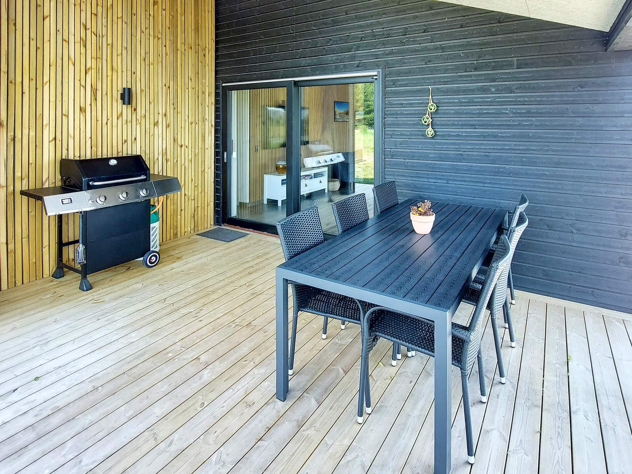 Udendørs indbyder sommerhusets store terrasser, som forbinder sig med huset, til solbadning, grill og hygge, og der er god plads til leg og boldspil på plænen. Der er også et legetårn med gynger, en rutsjebane og en sandkasse.