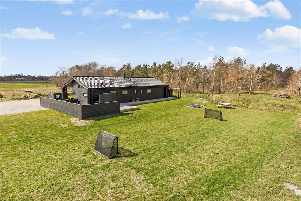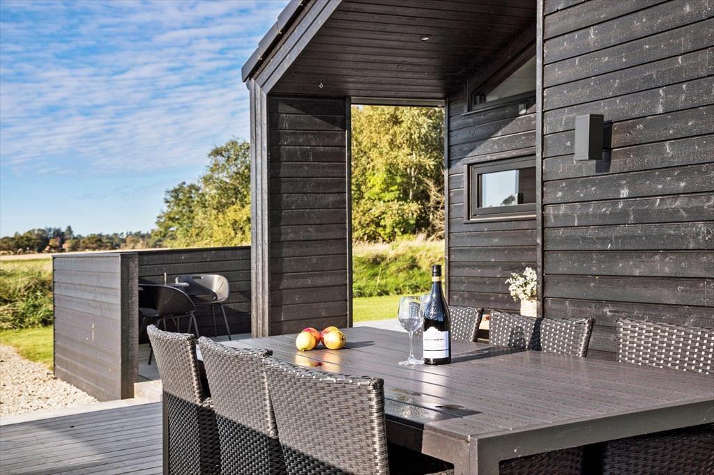 En stor træterrasse breder sig hele vejen rundt om sommerhuset, så det er nemt at finde en solstråle at sidde i – eller at vælge en skyggefuld opholdsplads på et af de overdækkede arealer. Her for enden af vejen har du fred og ro omkring dig, og det er skønt at kunne kigge lige ud på træer og åbne marker. Sådan en udsigt må altså gøre noget godt for både krop og sjæl! Et morgenbad under udebruseren kan sikkert også gøre underværker, hvis du vil føle dig i kontakt med naturen og friskes op på samme tid. Trampolinen vil børnene sikkert blive vilde med, mens målene på græsplænen indbyder til en hurtig kamp for hele familien.