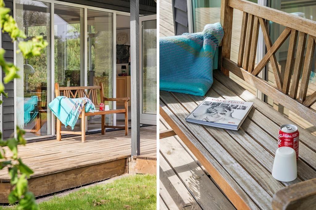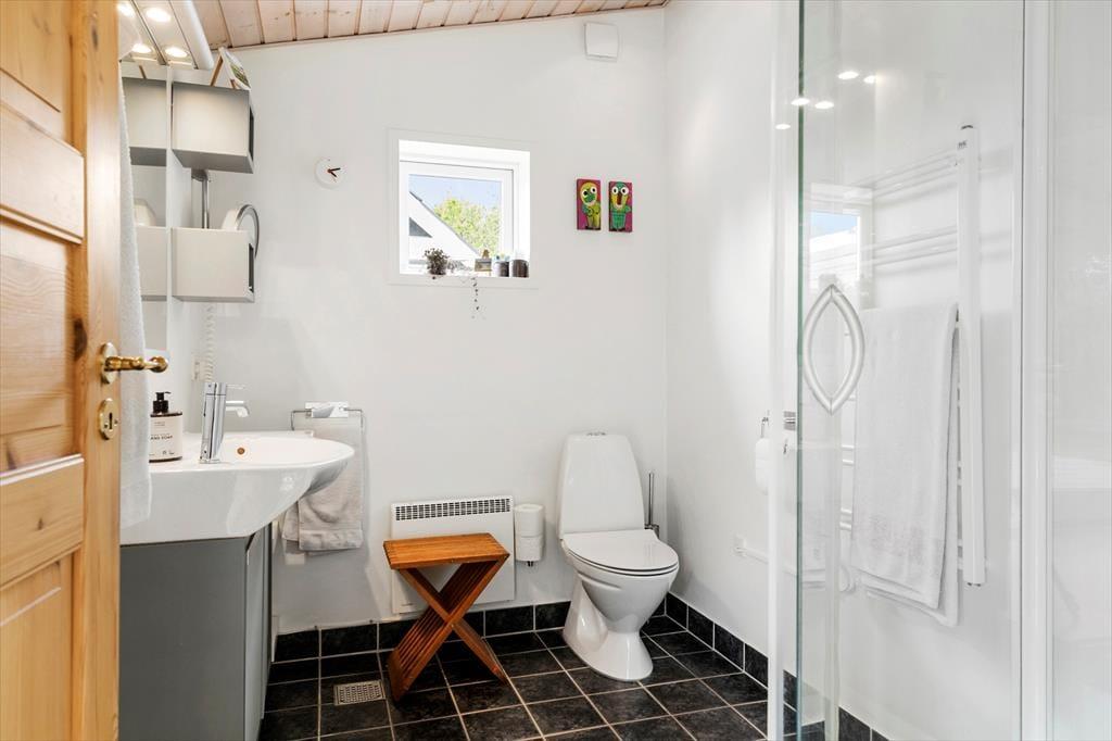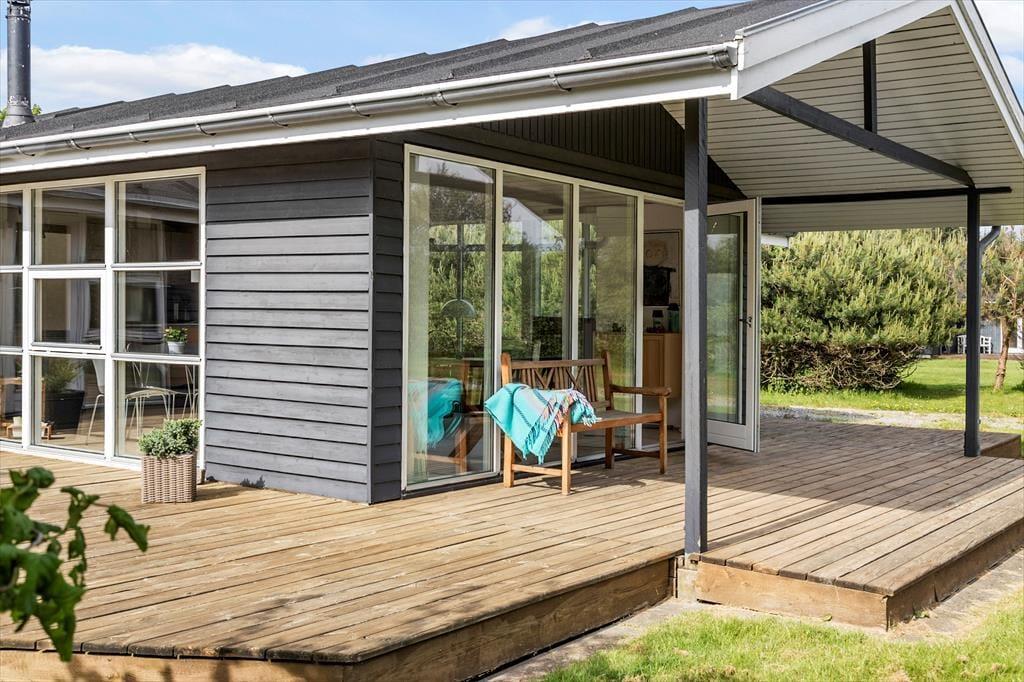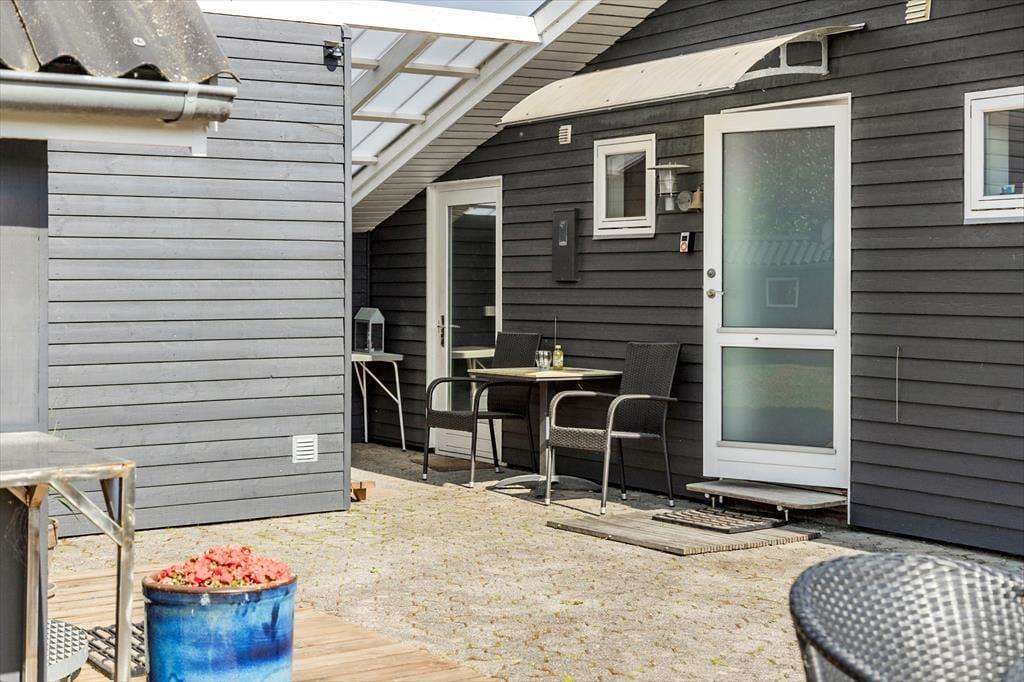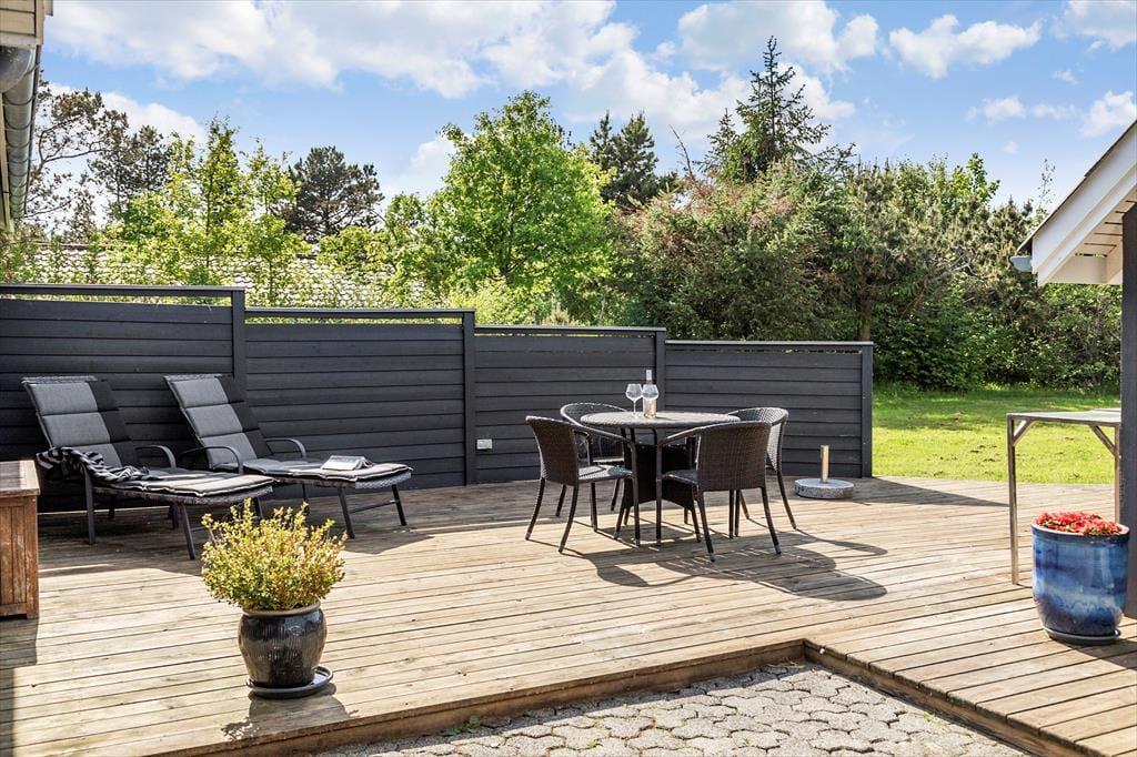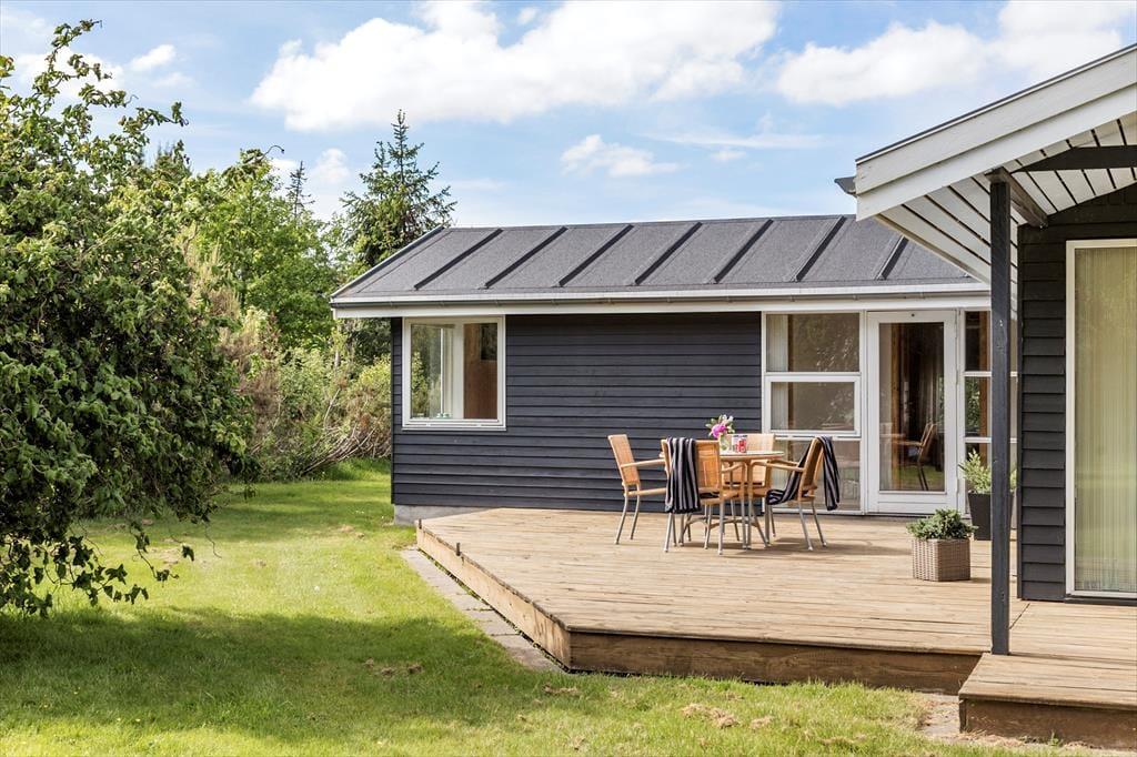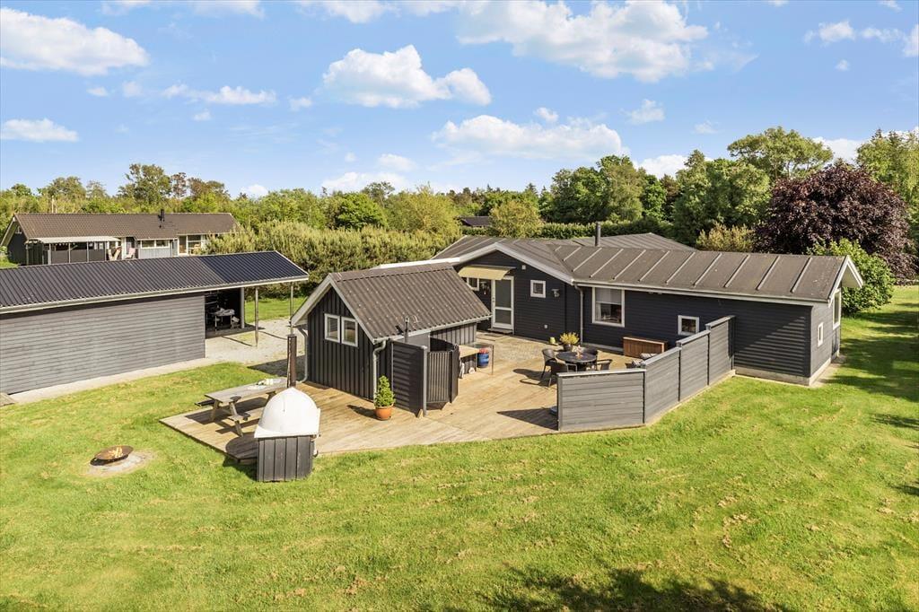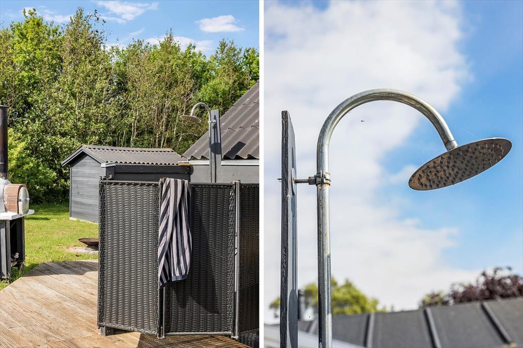 Ude i det fri er der hele 2500 m2 at brede sig på, hvoraf en stor del er dedikeret til en stor græsplæne – så med andre ord får børn og andre legesyge familiemedlemmer masser af plads til at spille bold, kaste med frisbee og slænge sig i det grønne. Rundt om sommerhuset er der flere gode terrasser at vælge imellem, og den delvist overdækkede sydterrasse er blandt andet et skønt sted at opholde sig. Det er dog sandsynligt, at det er baghavens godt afskærmede og helt ugenerede terrasse, der bliver familiens foretrukne opholdssted, for her er der udendørs bruser, grillpejs, bålfad og meget andet at hygge sig med.