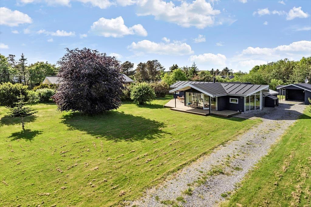 Dette dejlige sommerhus ligger roligt placeret på den lukkede vej Engblommen – bare en kort gåtur fra Bratten Strand og Vesterhavet. Naturgrunden er stor og grøn, og bag huset ligger en afskærmet terrasse, der minder om en uforstyrret solgård og i den grad er med til at forsøde ferielivet.