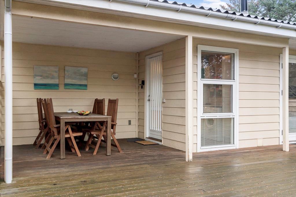 De smukke udearealer omkring sommerhuset er skabt til at blive brugt. Den grønne have indbyder til boldspil og leg, og terrassen er ideel til lange sommeraftener med grillmad og hygge. En privat sti leder direkte til havet, hvor du kan tage en dukkert, samle muslingeskaller eller blot nyde synet af bølgerne, der ruller ind. Med både solrige og skyggefulde hjørner er der altid et sted, hvor du kan finde ro og lade batterierne op. Her kan både børn og voksne nyde det frie liv, og naturens lyde skaber en helt særlig stemning.