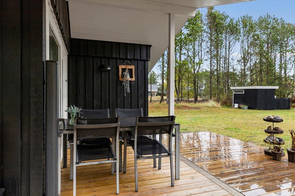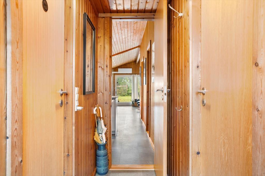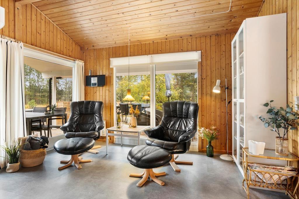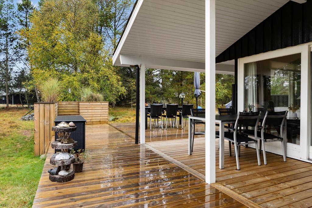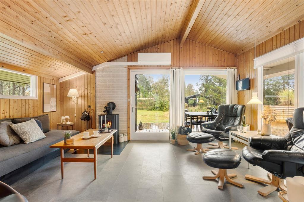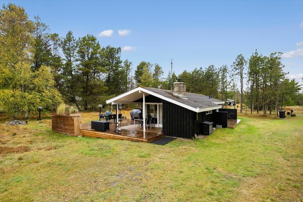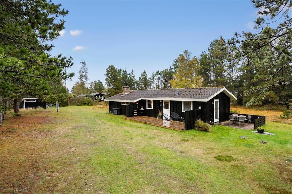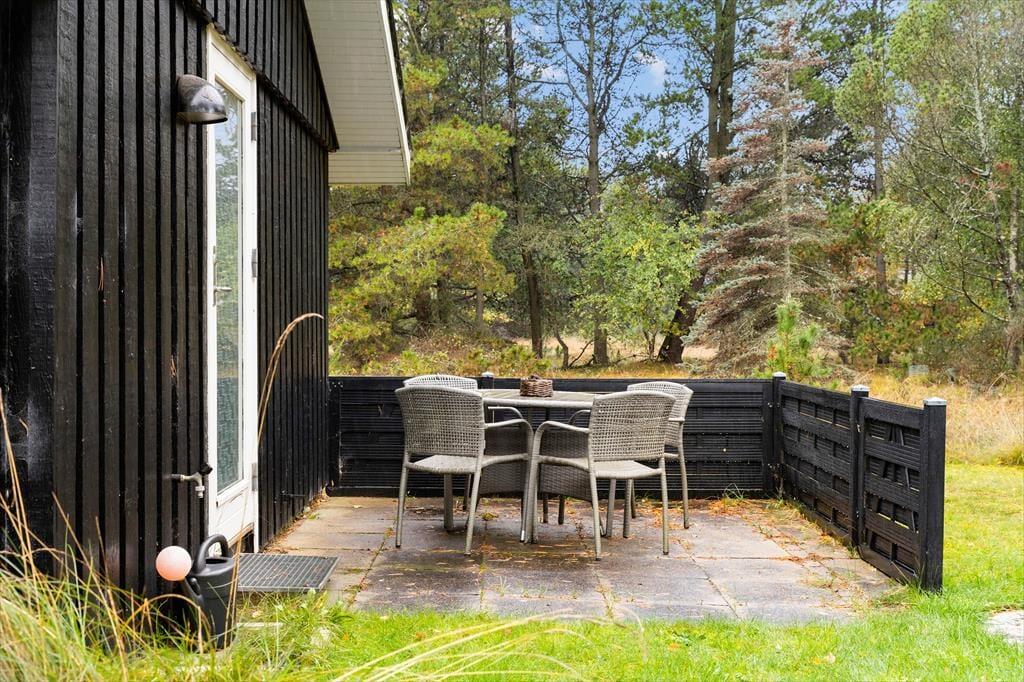 Sommerhusets store terrasser snor sig hele vejen rundt om huset, hvilket gør det muligt at finde en god krog med sol eller skygge uanset tidspunkt på dagen. Her kan du starte dagen med en kop kaffe i morgensolen, nyde frokosten i ly af parasollen og runde af med aftensmaden på grillen, mens solen går ned. Den store naturgrund på hele 2500 m2 giver masser af privatliv og frihed – hvad enten du vil solbade ugeneret, spille bold med børnene eller udfordre hinanden i dart. Naturen omkring huset sætter rammen for afslappende dage og hyggelige stunder, hvor feriestemningen for alvor kan folde sig ud.