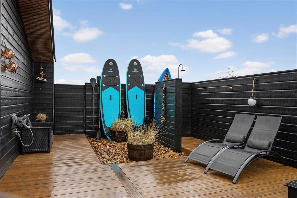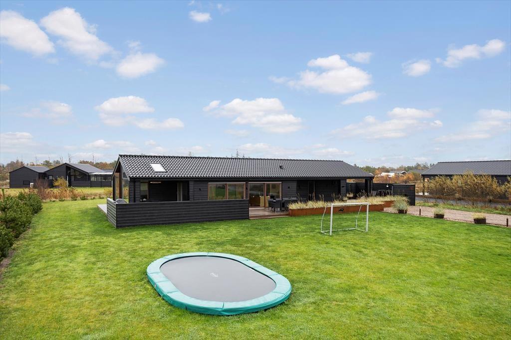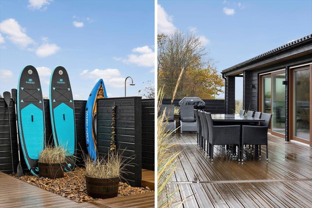 Udenfor venter en stor, solrig grund med masser af plads til både afslapning og leg. Her kan børnene hoppe på trampolinen eller spille bold på plænen, mens de voksne nyder en kop kaffe eller et glas vin på en af de dejlige terrasser. Terrasserne er anlagt, så du altid kan finde sol eller læ – og en del af udearealet er overdækket med terrassevarmer, så udelivet kan fortsætte langt ud på aftenen. Her finder du også det skønneste udespa og en udendørs bruser, som indbyder til ren velvære efter en dag på stranden eller en frisk gåtur i naturen. Gasgrillen står klar til brug (gas er inkluderet), og duften af grillmad kan hurtigt sprede sig i den lune sommeraften. For de aktive er der gode muligheder for underholdning både ude og inde – fra bordtennis og volleyball til spillekonsol og paddleboard. Her er kort sagt lagt op til både leg, samvær og ren afslapning midt i naturen.