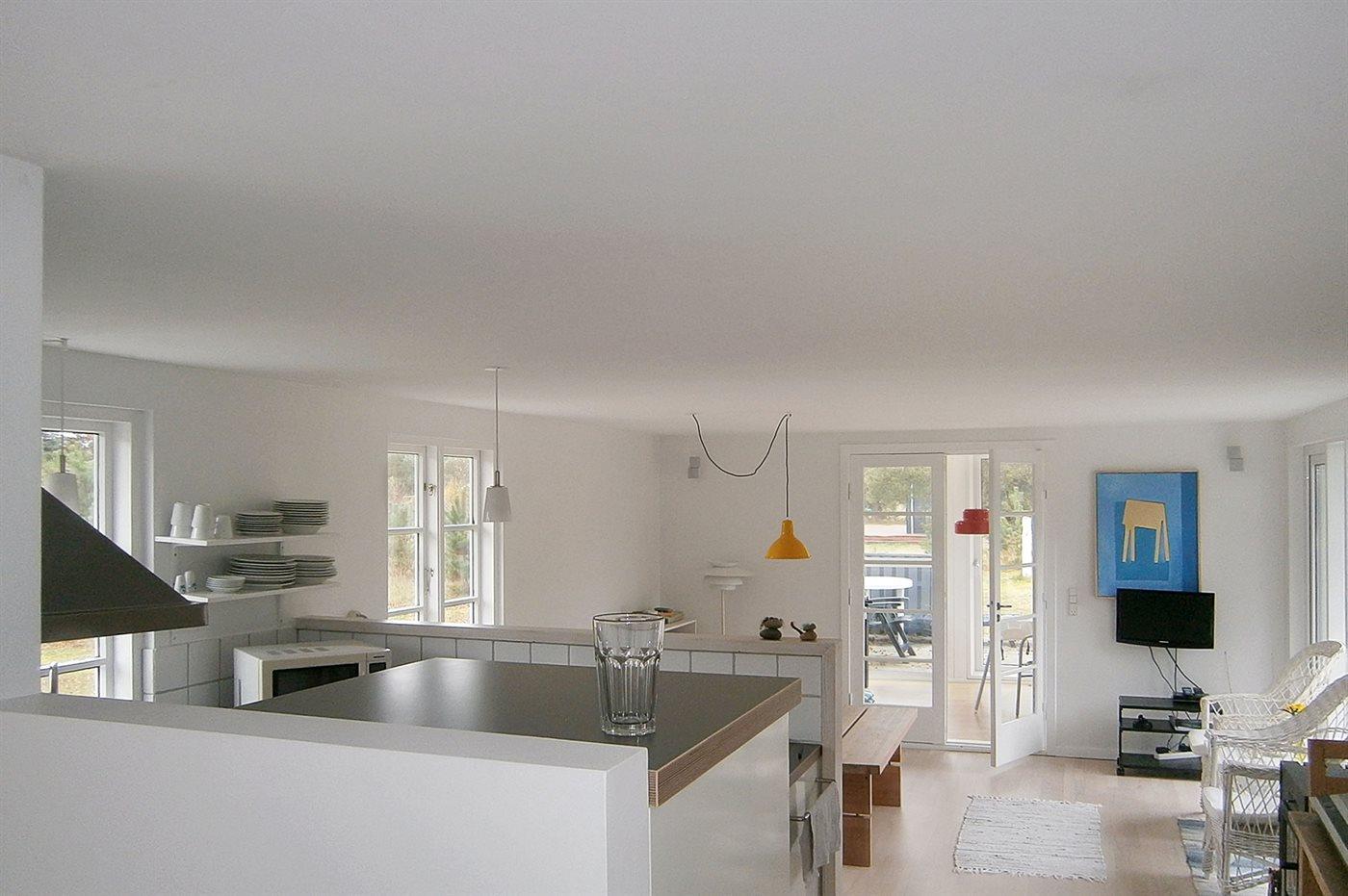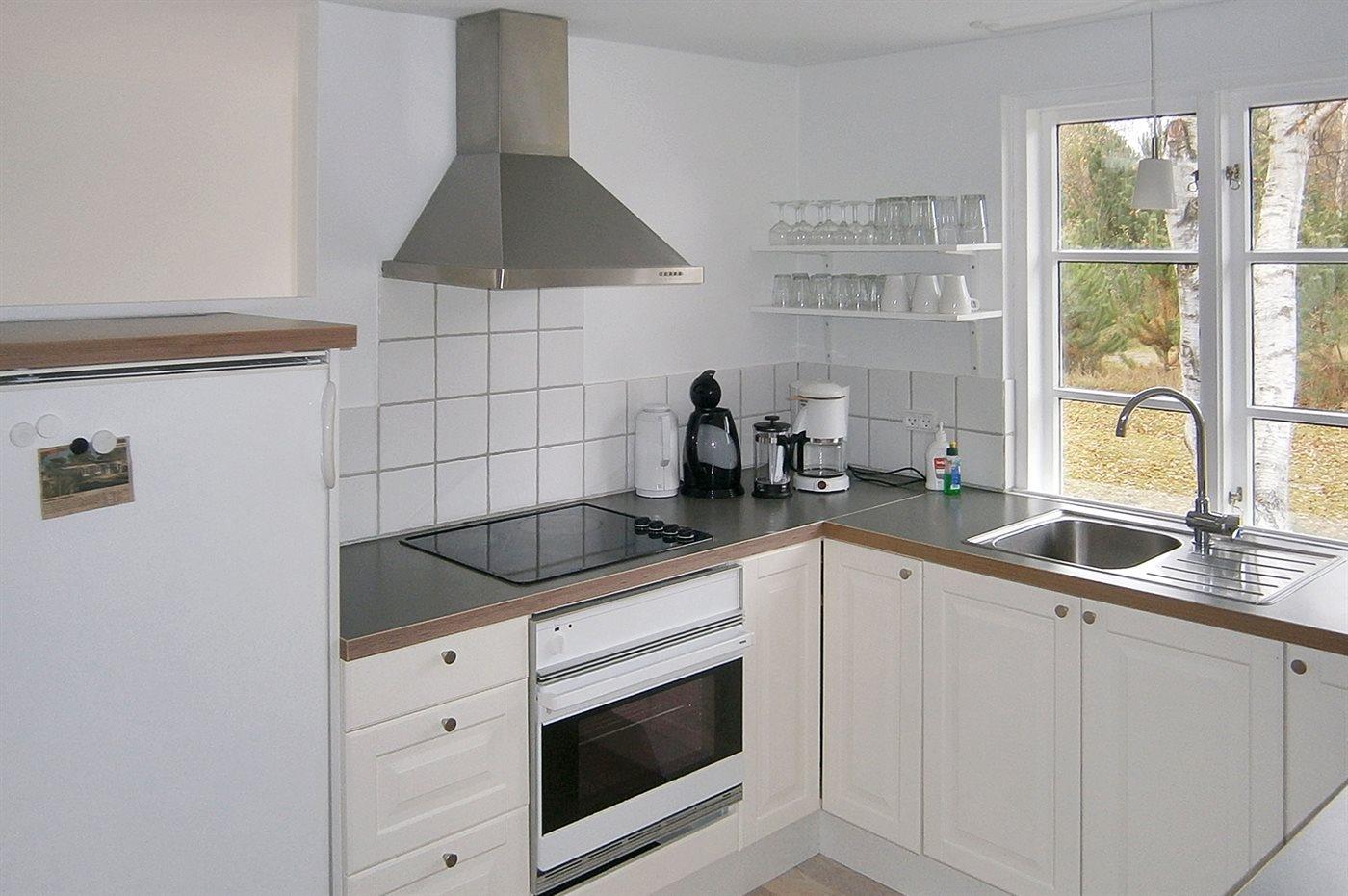 Køkkenet er udstyret med 1 køleskab. Der er 4 keramiske kogeplader, bageovn, mikrobølgeovn samt opvaskemaskine.
