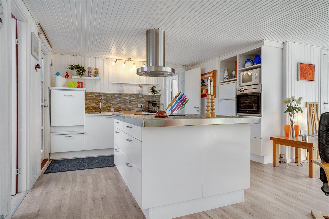 Køkkenet er udstyret med 1 køleskab. Der er 4 keramiske kogeplader, varmluftovn, mikrobølgeovn samt opvaskemaskine.