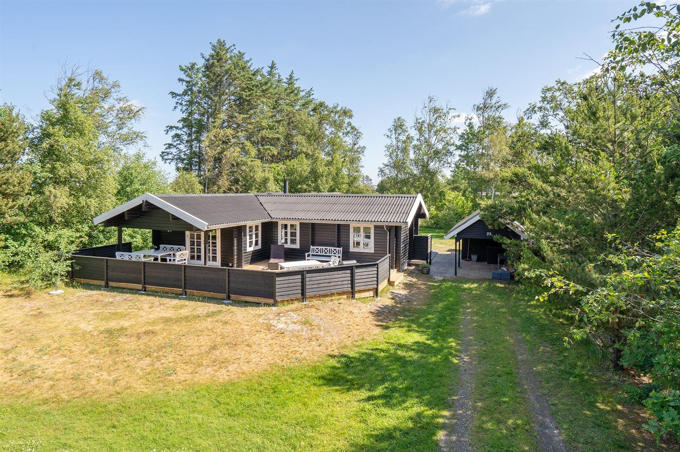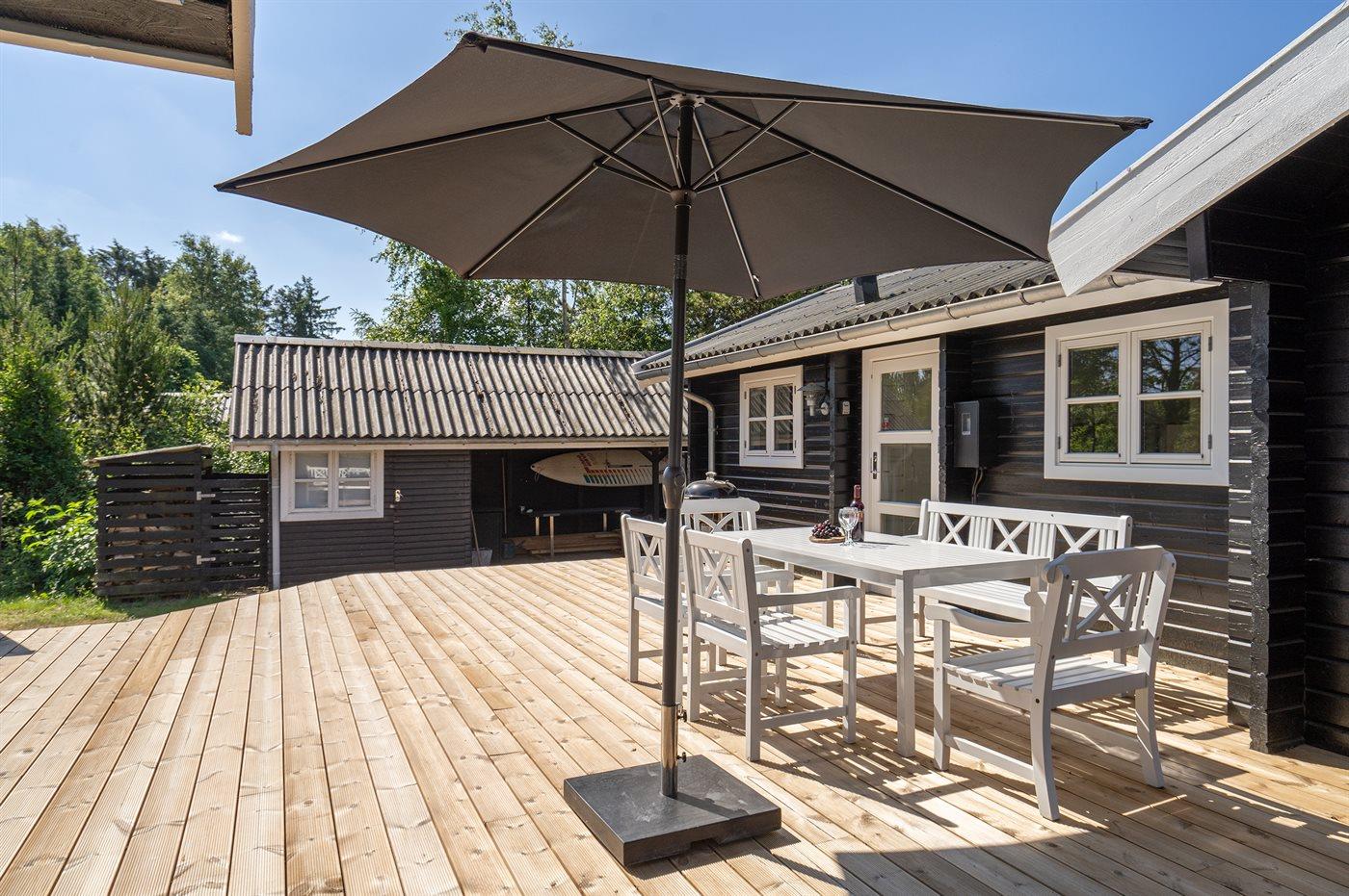 Hyggeligt bjælkesommerhus med stort anneks og terrasse nær børnevenlig strand i Jerup.
