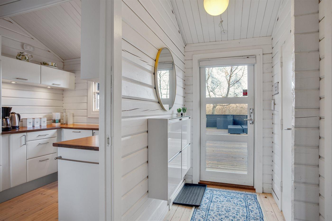 Køkkenet er udstyret med 1 køleskab. Der er 4 keramiske kogeplader, varmluftovn samt opvaskemaskine.