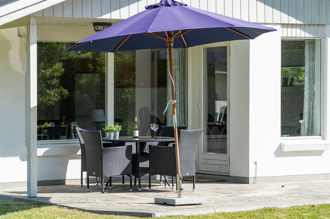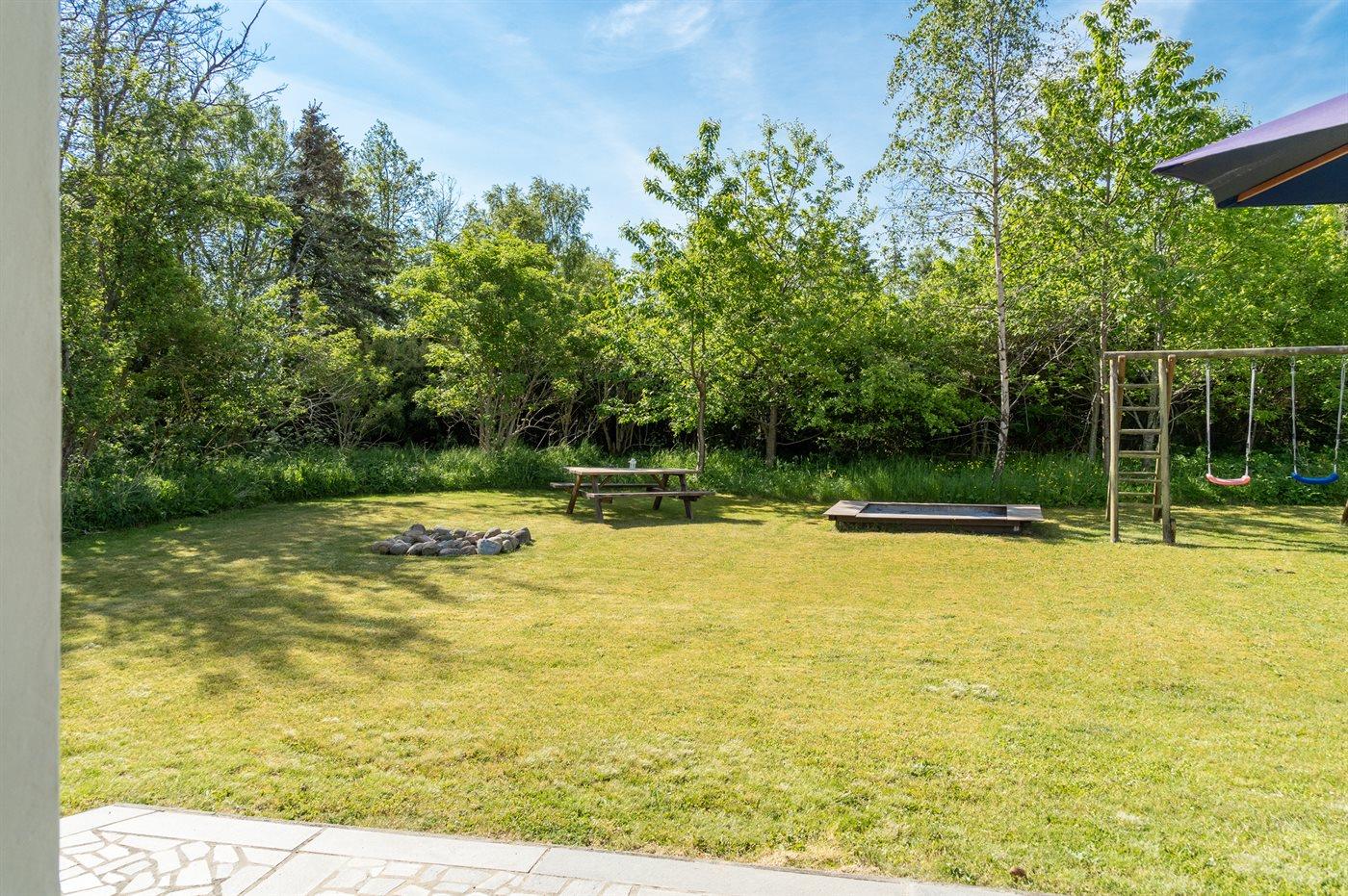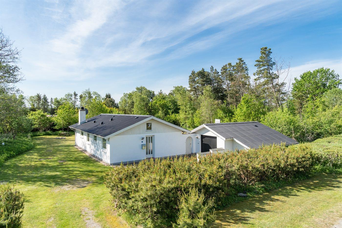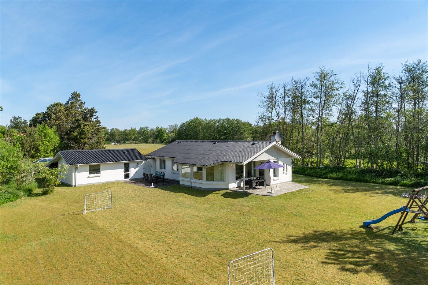 Ferieboligen er beliggende på en 2500 m² stor naturgrund. Der er 600 m til havet. Nærmeste forretning er beliggende i en afstand af 500 m. Til ferieboligen hører 2 terrasser på i alt 50 m² – heraf er de 7 m² overdækket. Der er redskabsrum. Gynge. Sandkasse. Rutchebane. Fodboldmål. Bålsted. Grill til rådighed. Der er garage til rådighed. Der er installeret stik til opladning af elbil. Med 11 kW ladeeffekt. Parkering ved ferieboligen.
