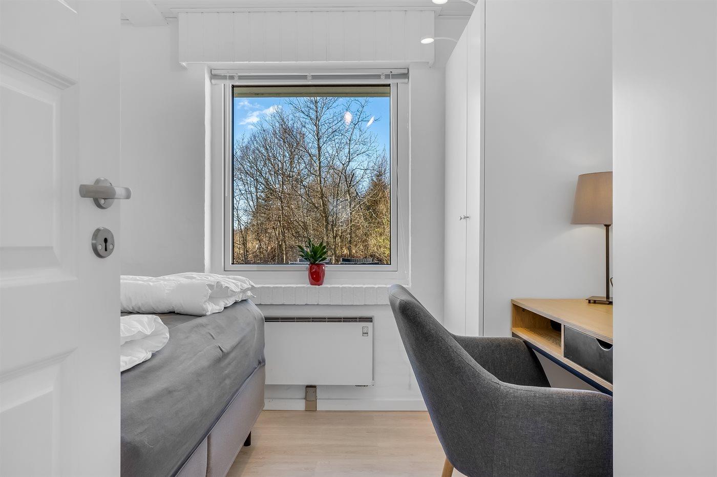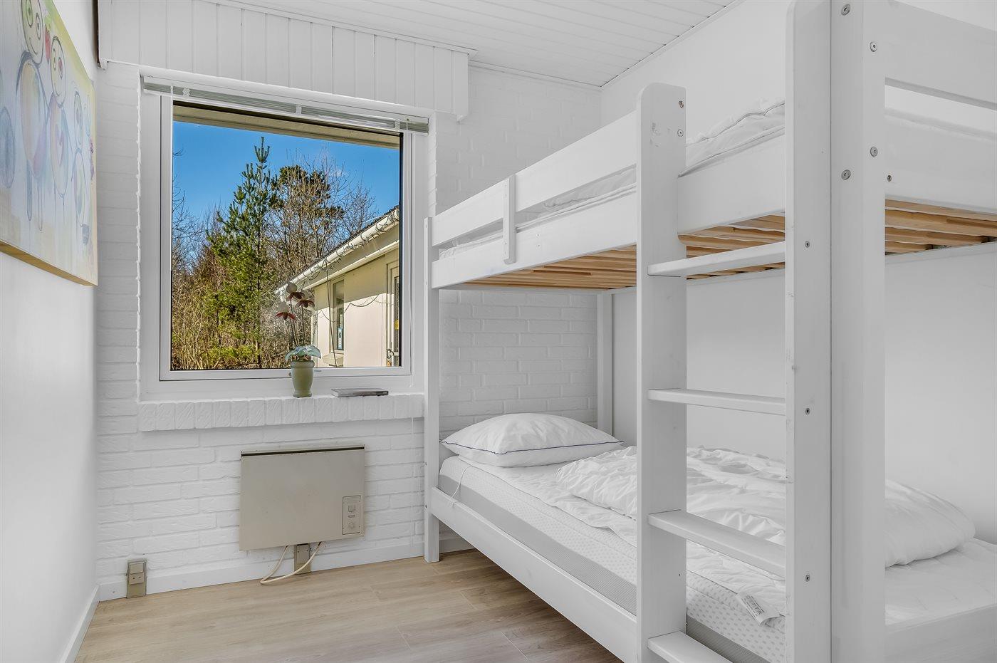 Der er i alt 3 soveværelser. Sovepladserne fordeler sig på: 4 sovepladser i dobbeltsenge. 2 sovepladser i køjeseng. Derudover er der 1 stk. barneseng.