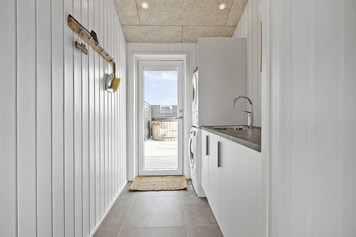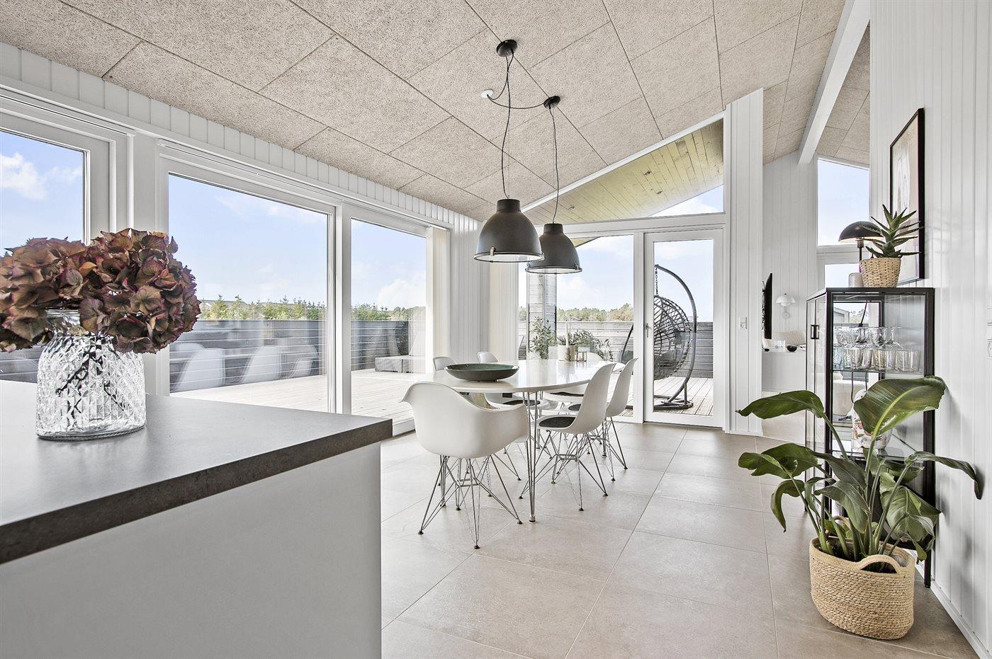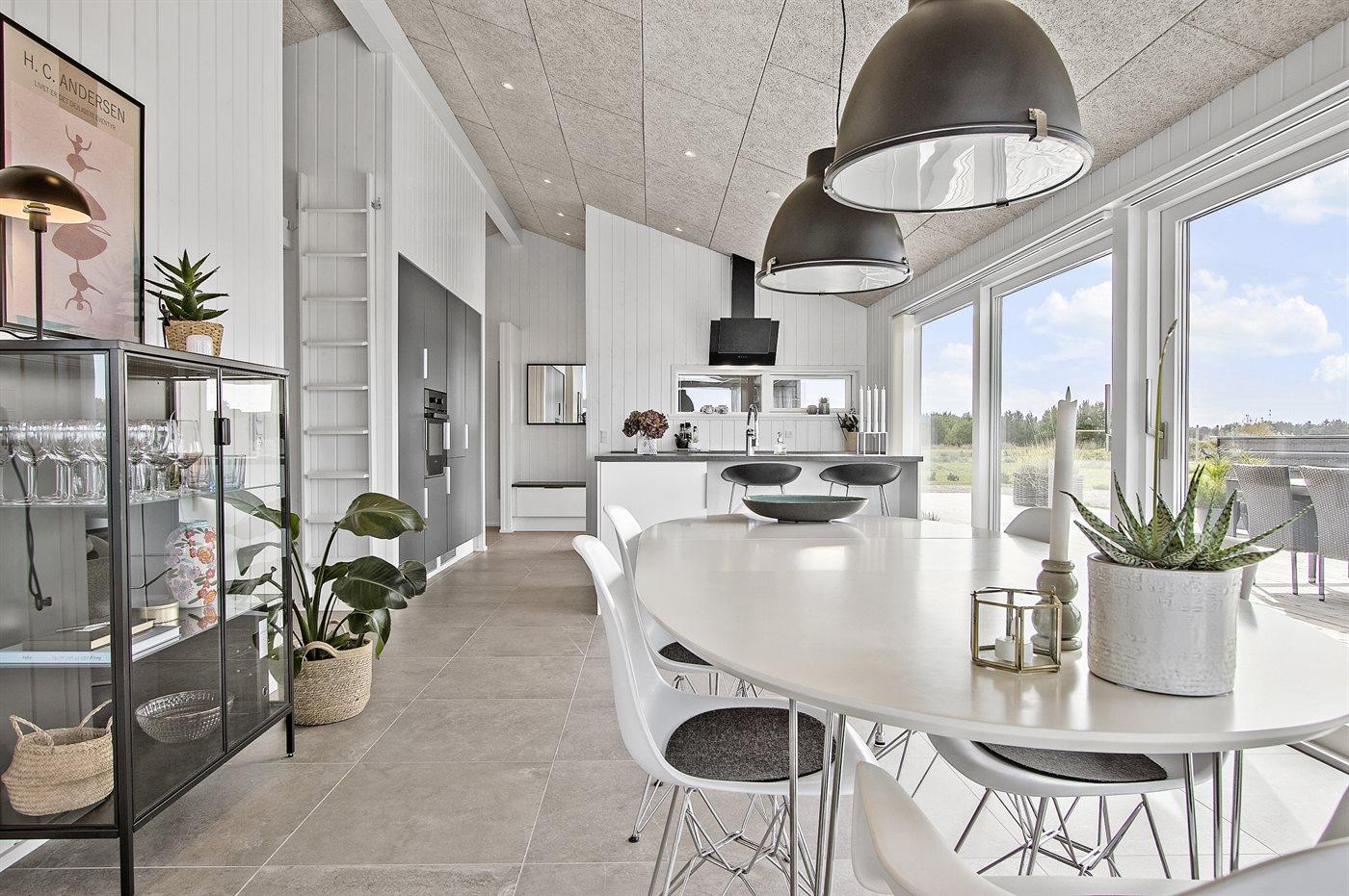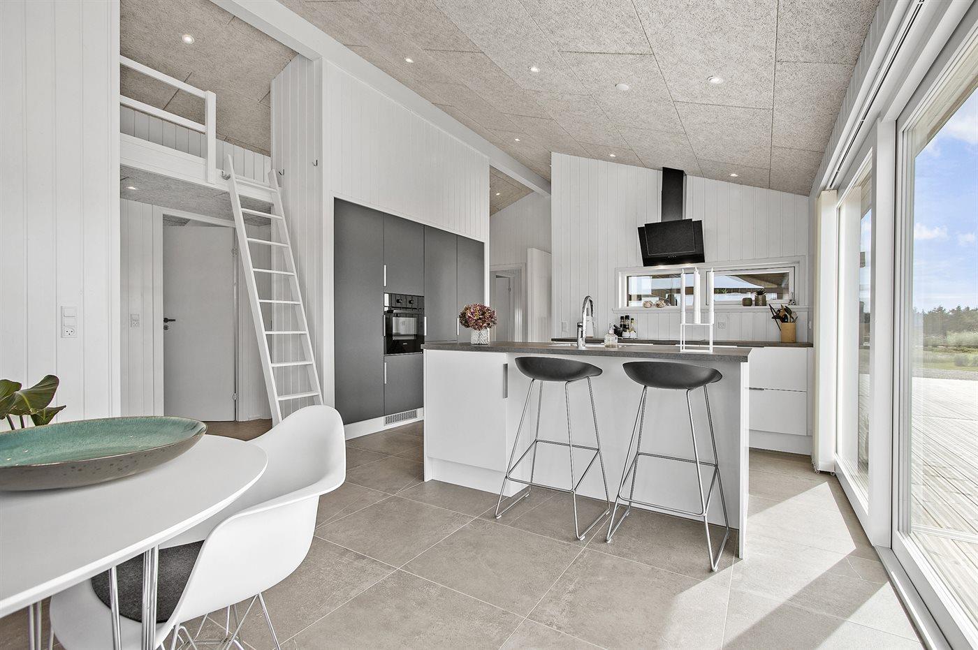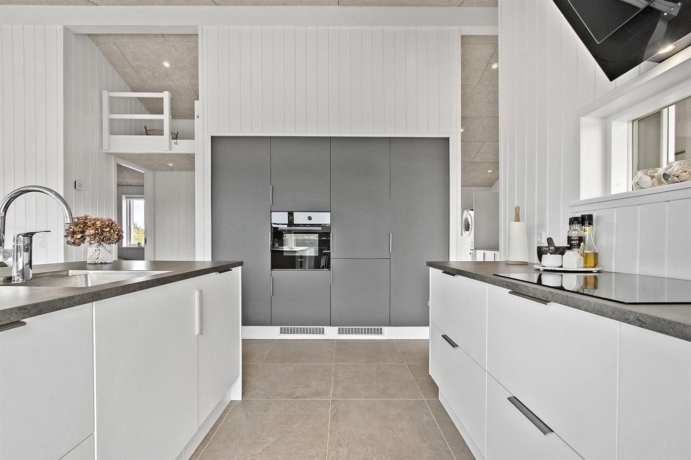 Køkkenet er veludstyret og har 1 køleskab. Der er 4 induktionskogeplader, varmluftovn, mikrobølgeovn samt opvaskemaskine.