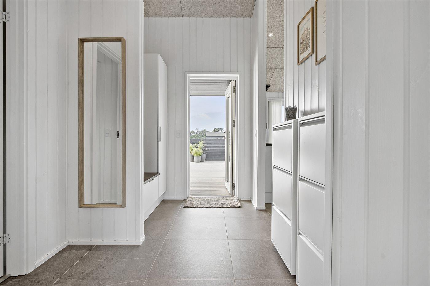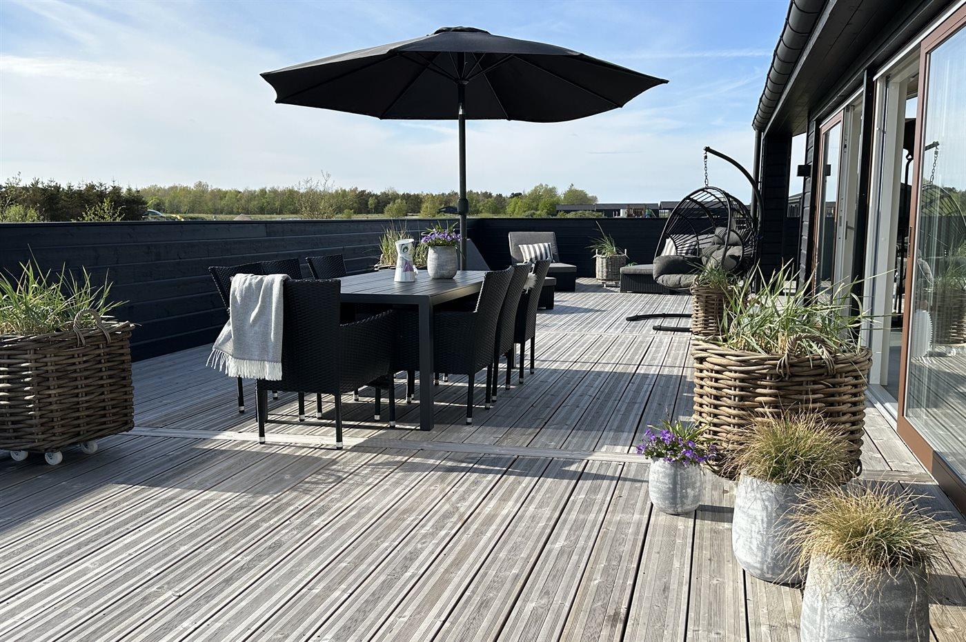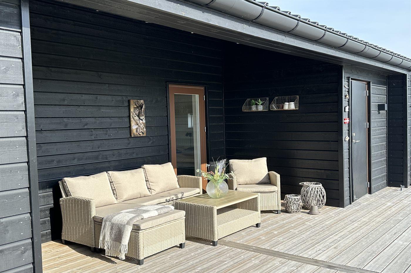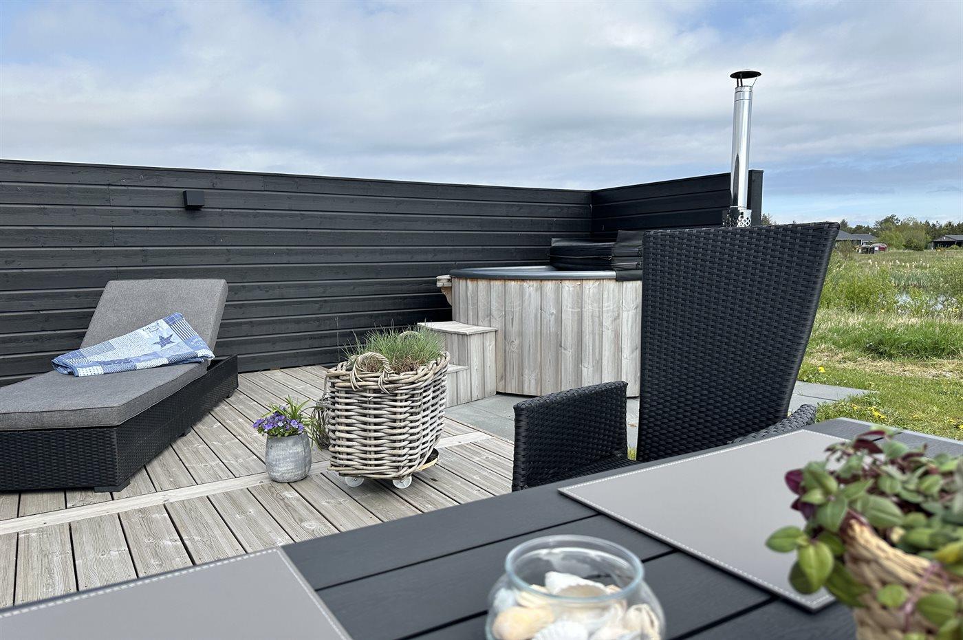 Ferieboligen er beliggende på en 2594 m² stor naturgrund. Der er 900 m til havet. Nærmeste forretning er beliggende i en afstand af 4000 m. Til ferieboligen hører åbent terrasseareal. Desuden er der overdækket terrasse. Der er redskabsrum. Gynge. Trampolin. Fodboldmål. Udendørs bruser. Grill til rådighed. Der er installeret stik til opladning af elbil. Med 11 kW ladeeffekt. Parkering ved ferieboligen.