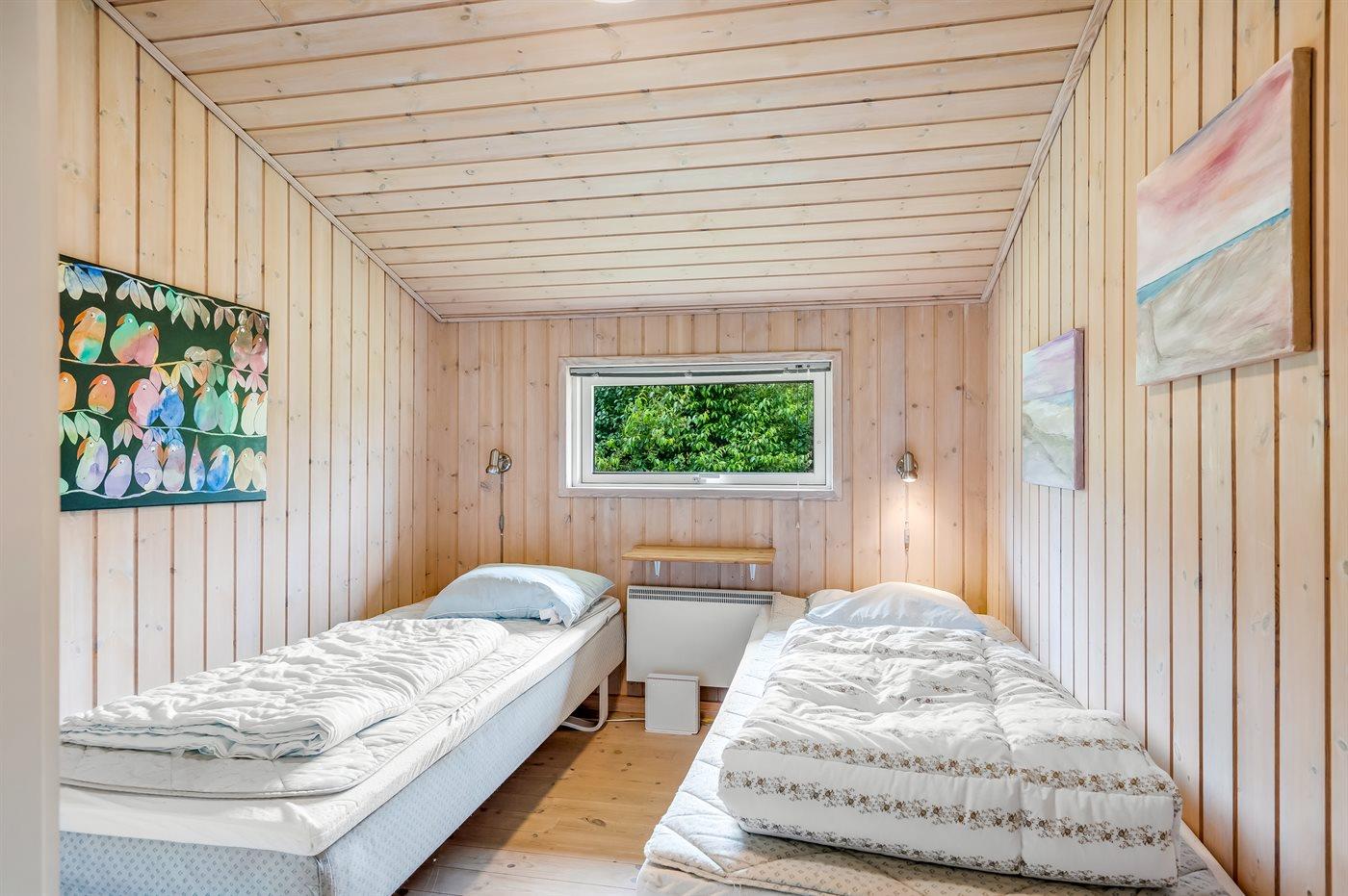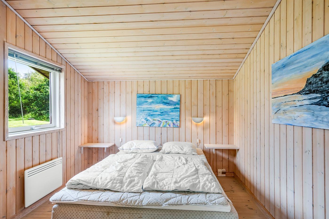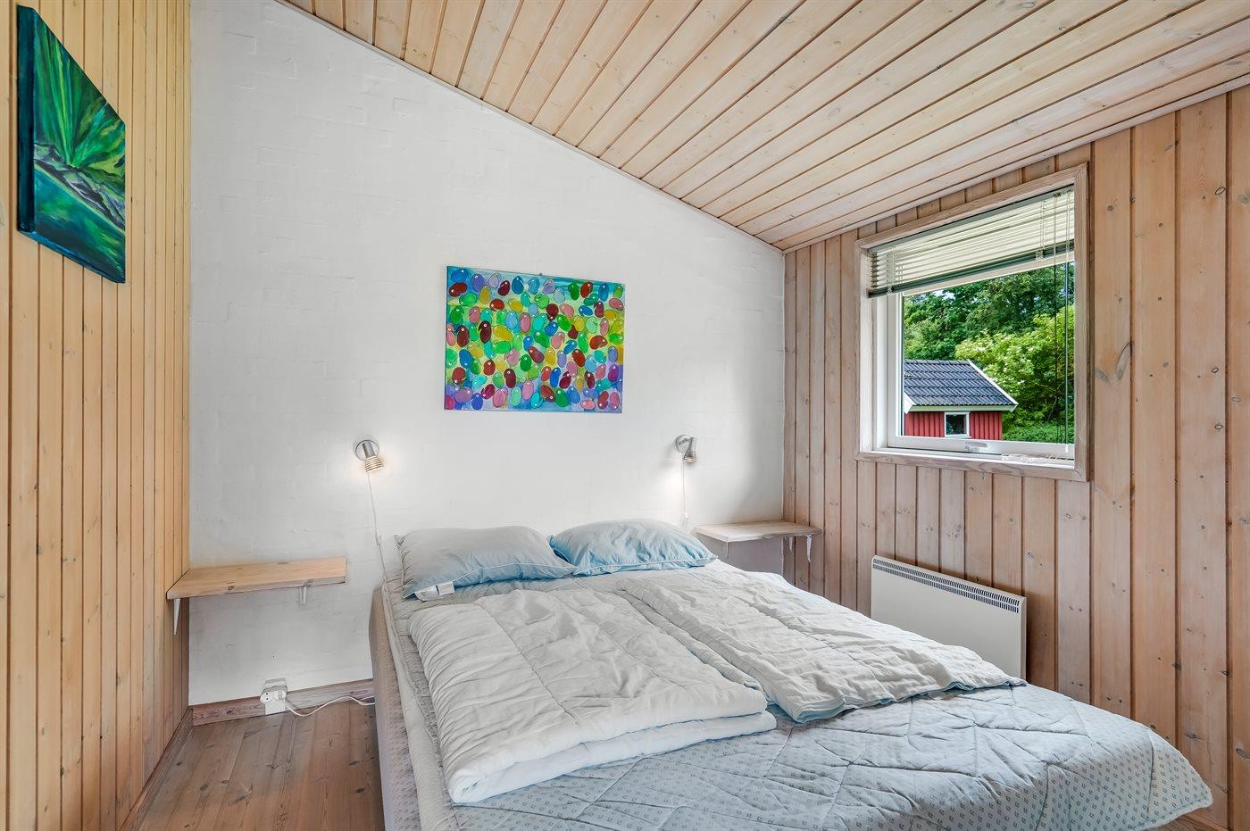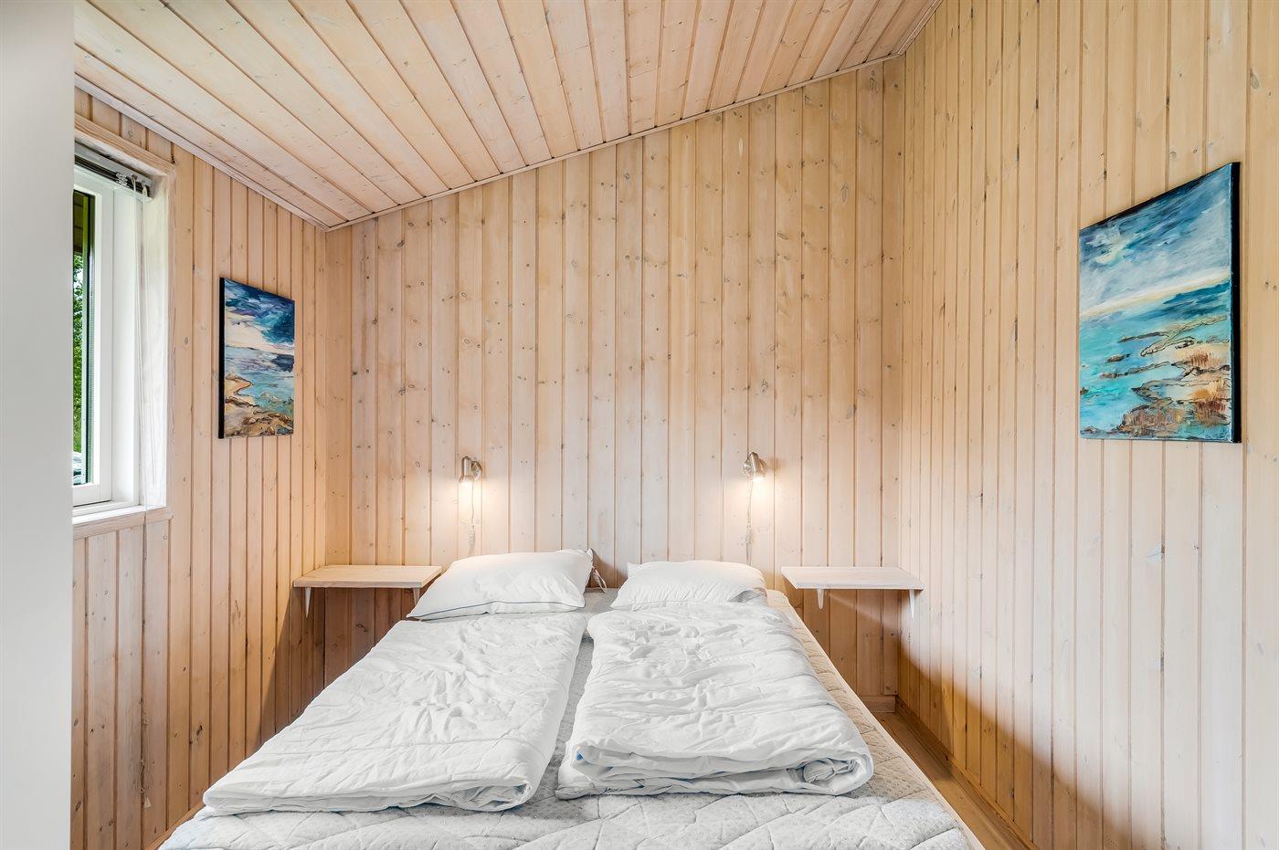 Der er i alt 4 soveværelser. Sovepladserne fordeler sig på: 6 sovepladser i dobbeltsenge. 2 sovepladser i enkeltsenge. 2 sovepladser på madrasser. 2 af disse sovepladser befinder sig på husets hems. Derudover er der 1 stk. barneseng.