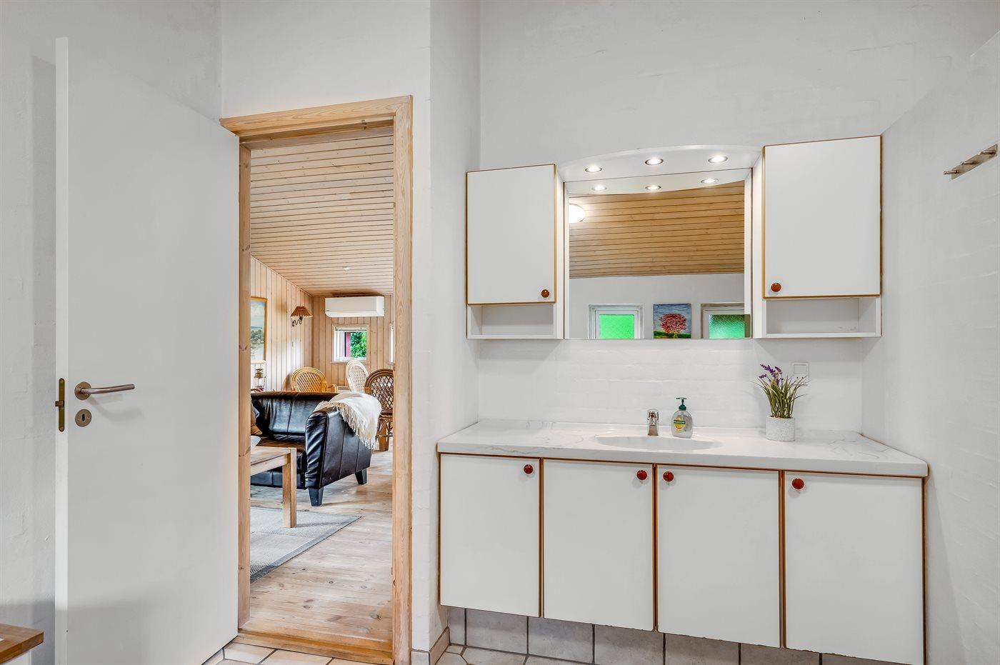 Der er 2 badeværelser med bruseniche og 2 toiletter. Der er gulvvarme på 2 badeværelser. I saunaen er der mulighed for afslapning.