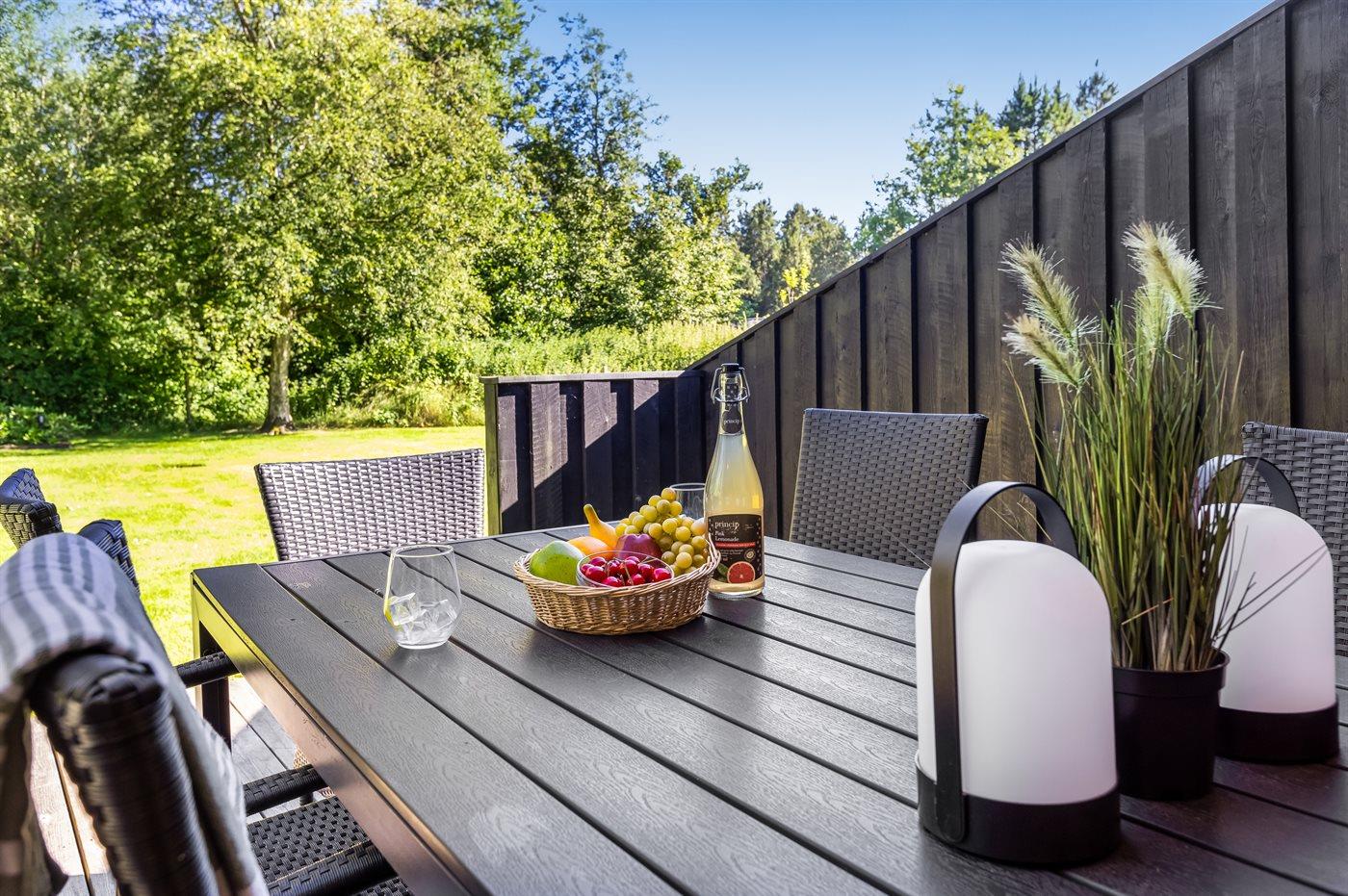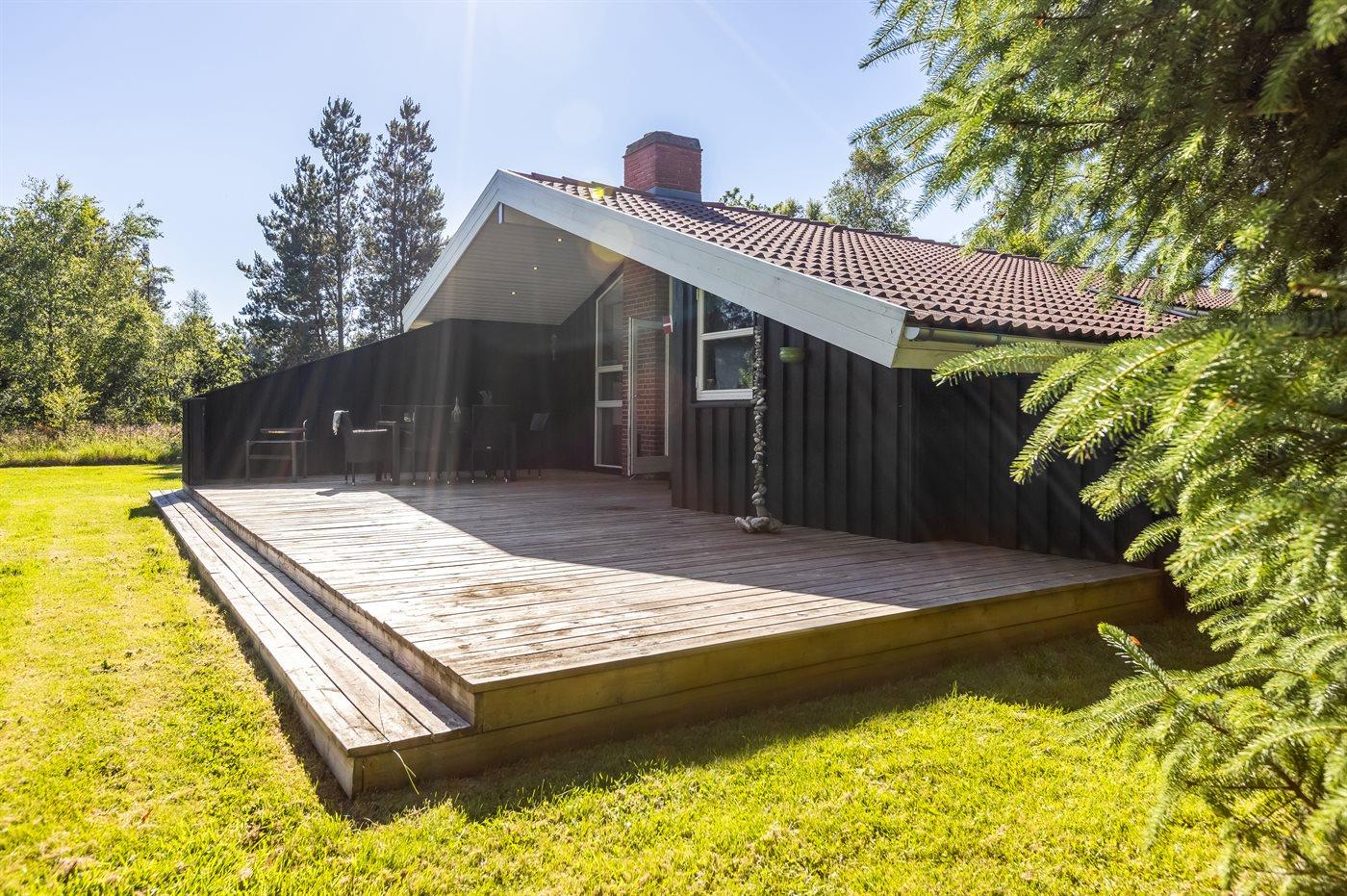 Ferieboligen er beliggende på en 2500 m² stor naturgrund. Der er 600 m til havet. Nærmeste forretning er beliggende i en afstand af 4000 m. Til ferieboligen hører åbent terrasseareal. Desuden er der overdækket terrasse. Der er redskabsrum. Gynge. Rutchebane. Bålsted. Grill til rådighed. Der er installeret stik til opladning af elbil. Med 11 kW ladeeffekt. Parkering ved ferieboligen.