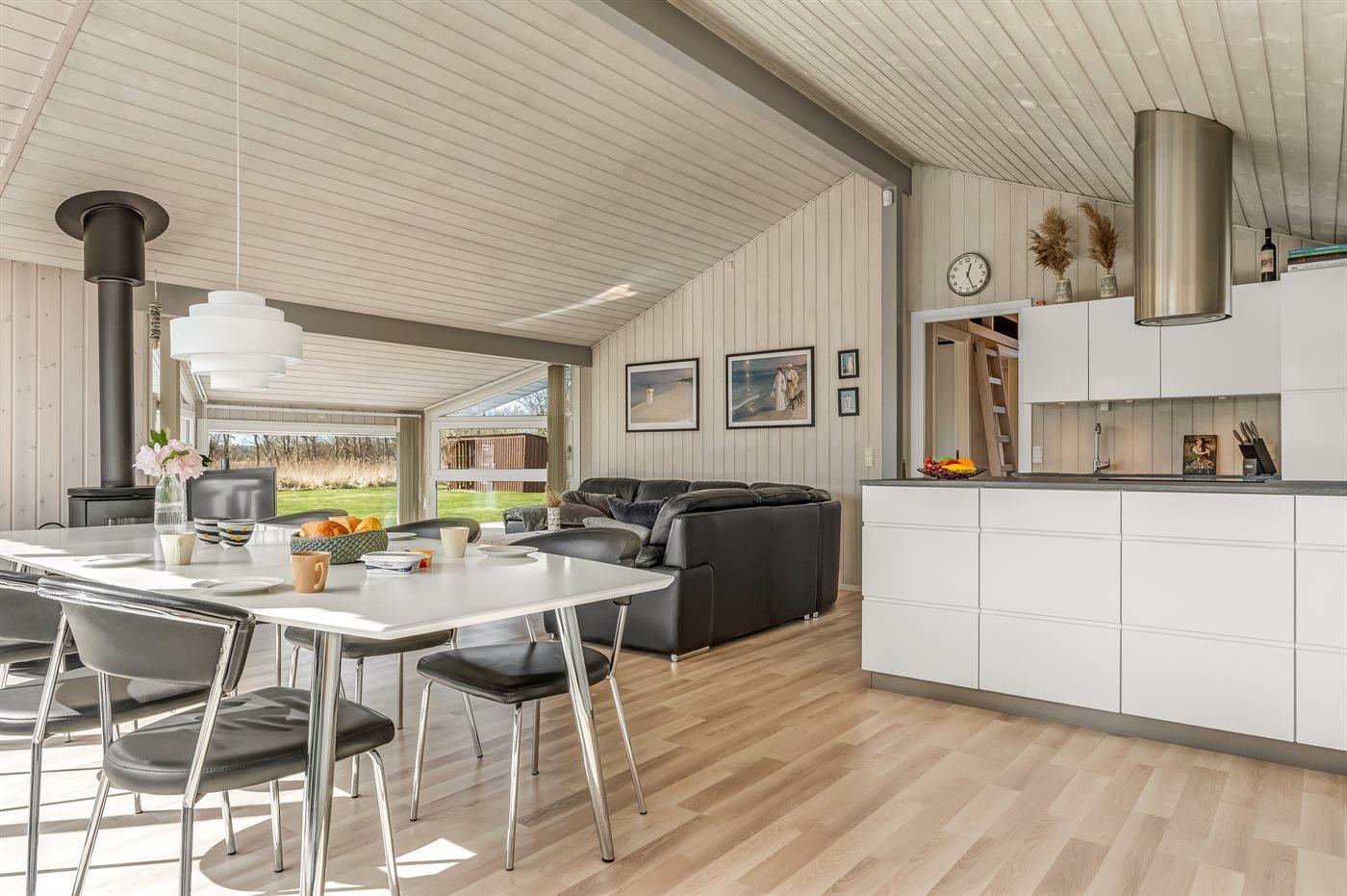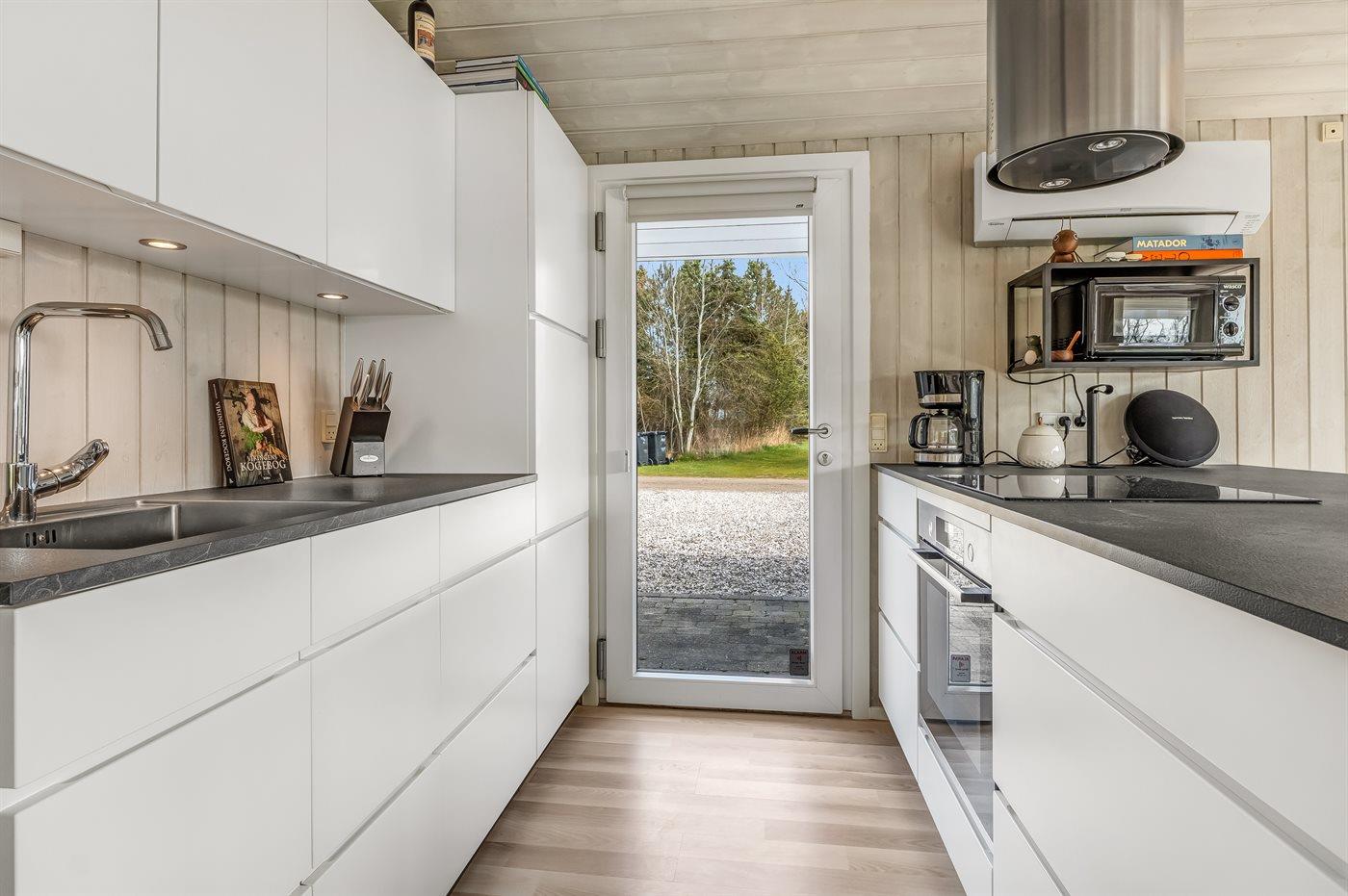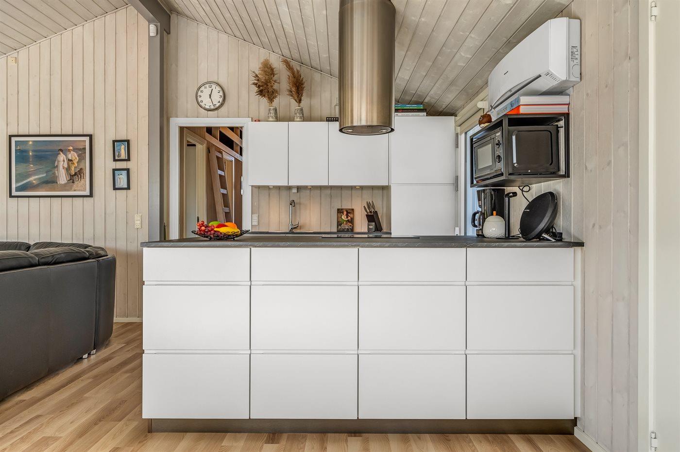 Køkkenet er udstyret med 1 køleskab. Der er 4 induktionskogeplader, varmluftovn, mikrobølgeovn samt opvaskemaskine.