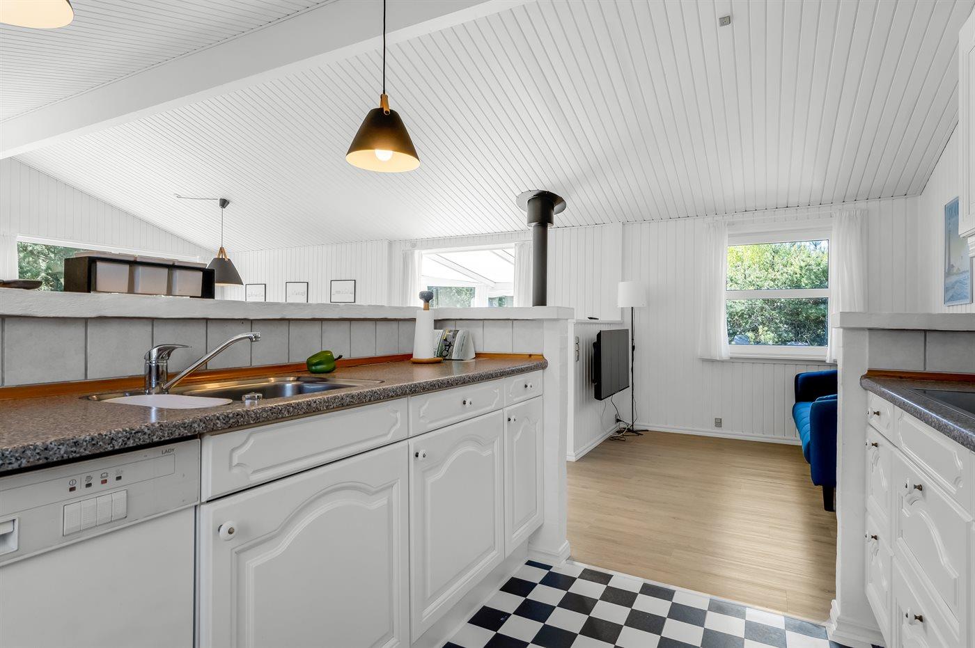 Køkkenet er udstyret med 1 køleskab. Der er 4 keramiske kogeplader, varmluftovn, mikrobølgeovn samt opvaskemaskine.