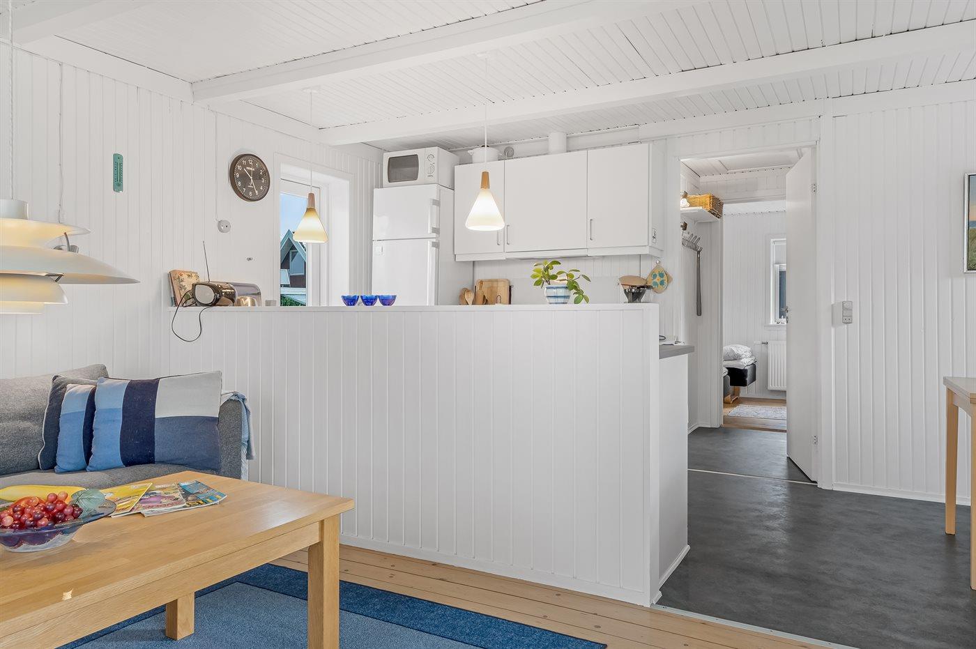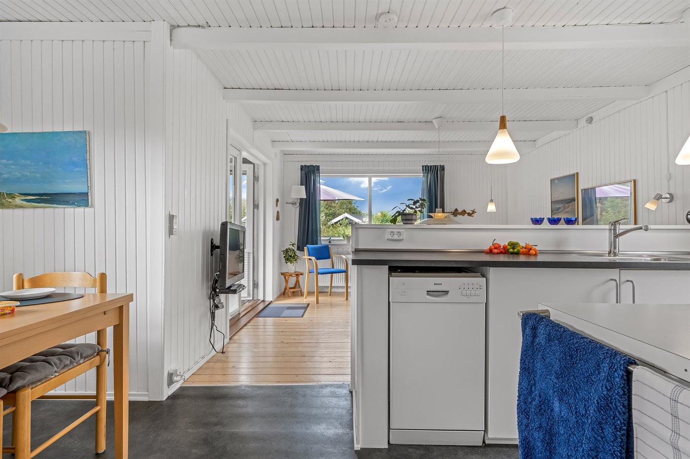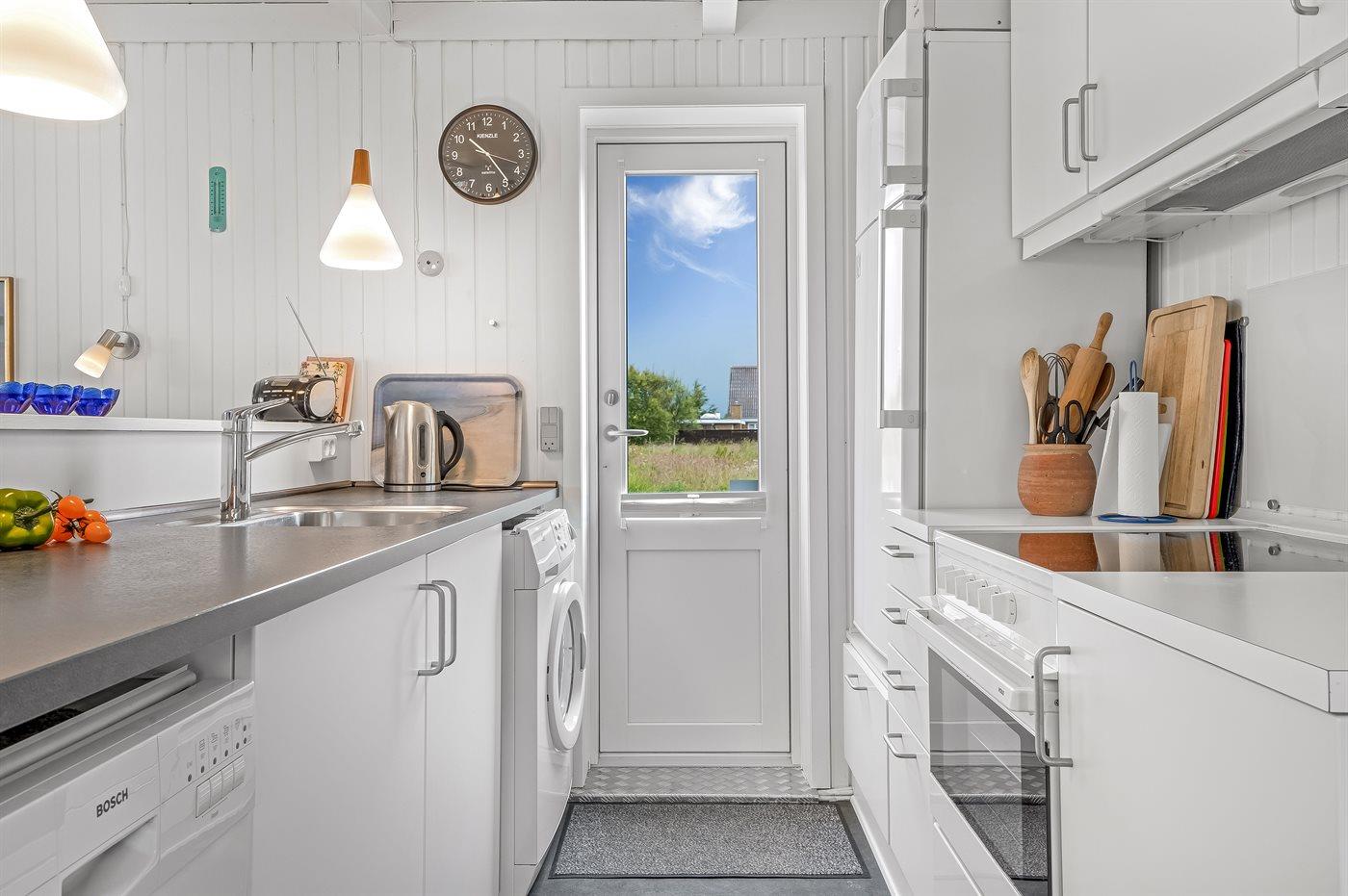 Køkkenet er udstyret med 1 køleskab. Der er 4 keramiske kogeplader, varmluftovn, mikrobølgeovn samt opvaskemaskine.