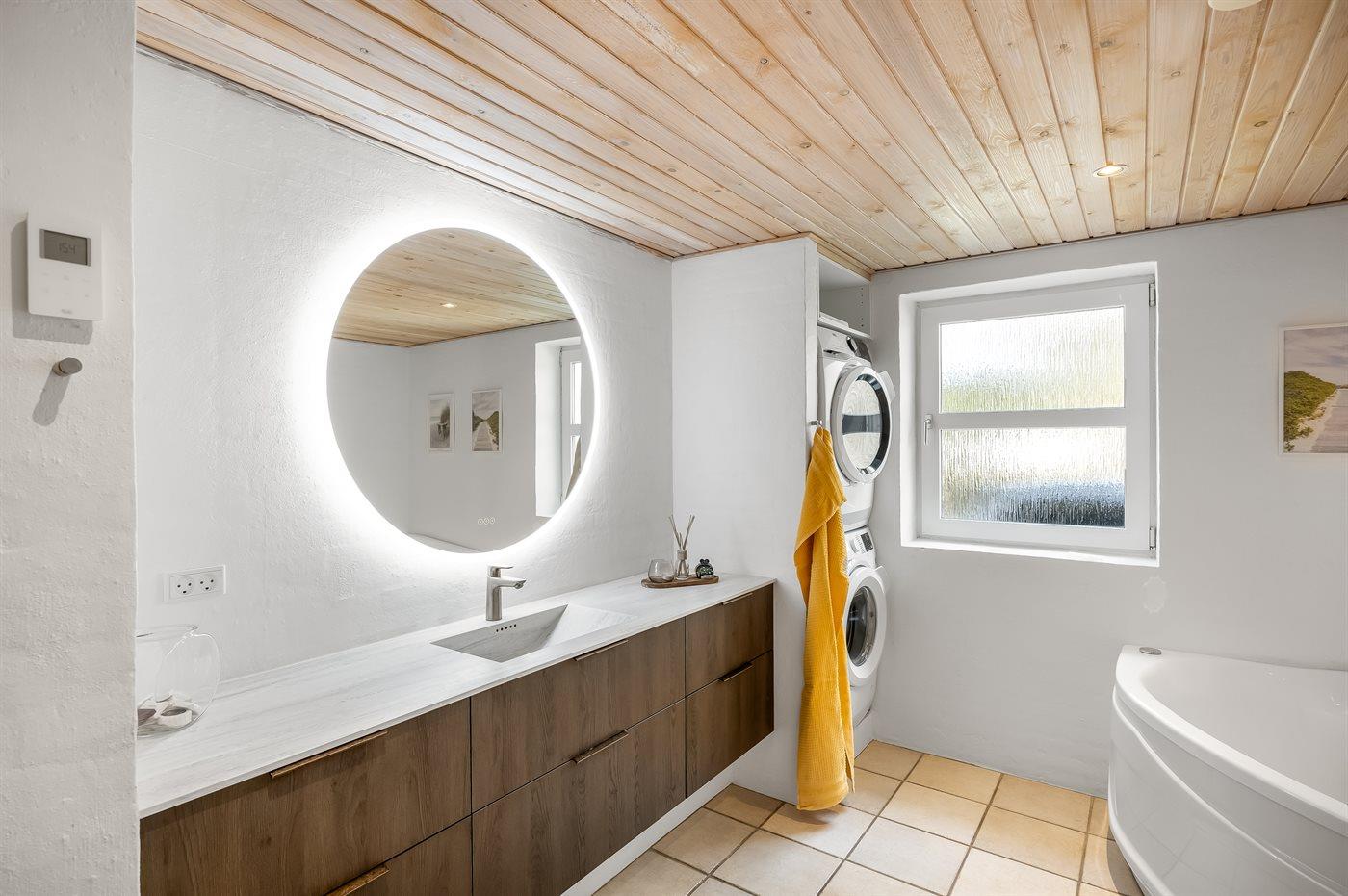 Der er 2 badeværelser med bruseniche og 2 toiletter. Der er gulvvarme på 2 badeværelser. I saunaen er der mulighed for afslapning.