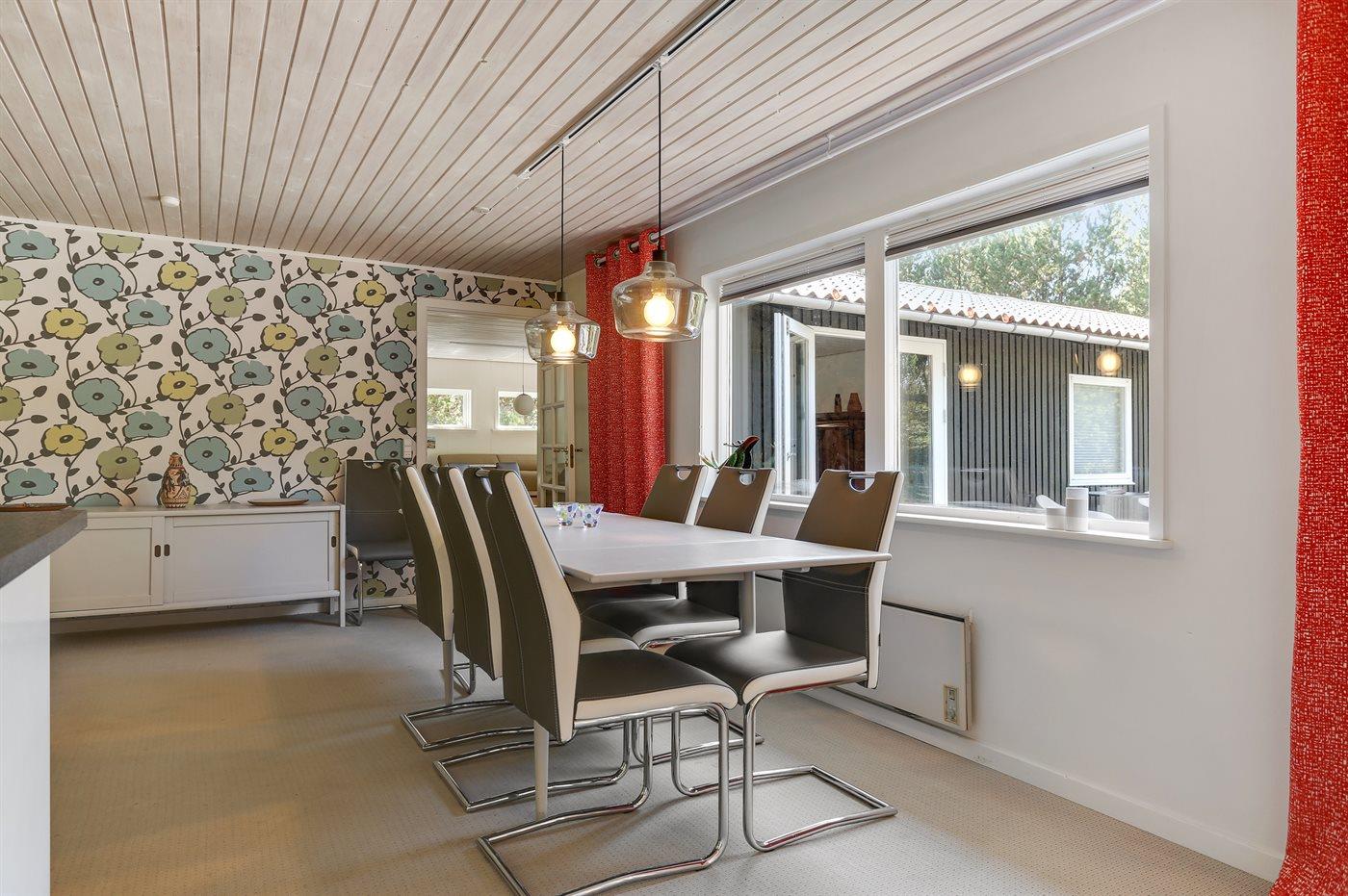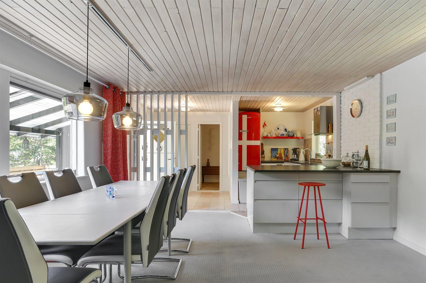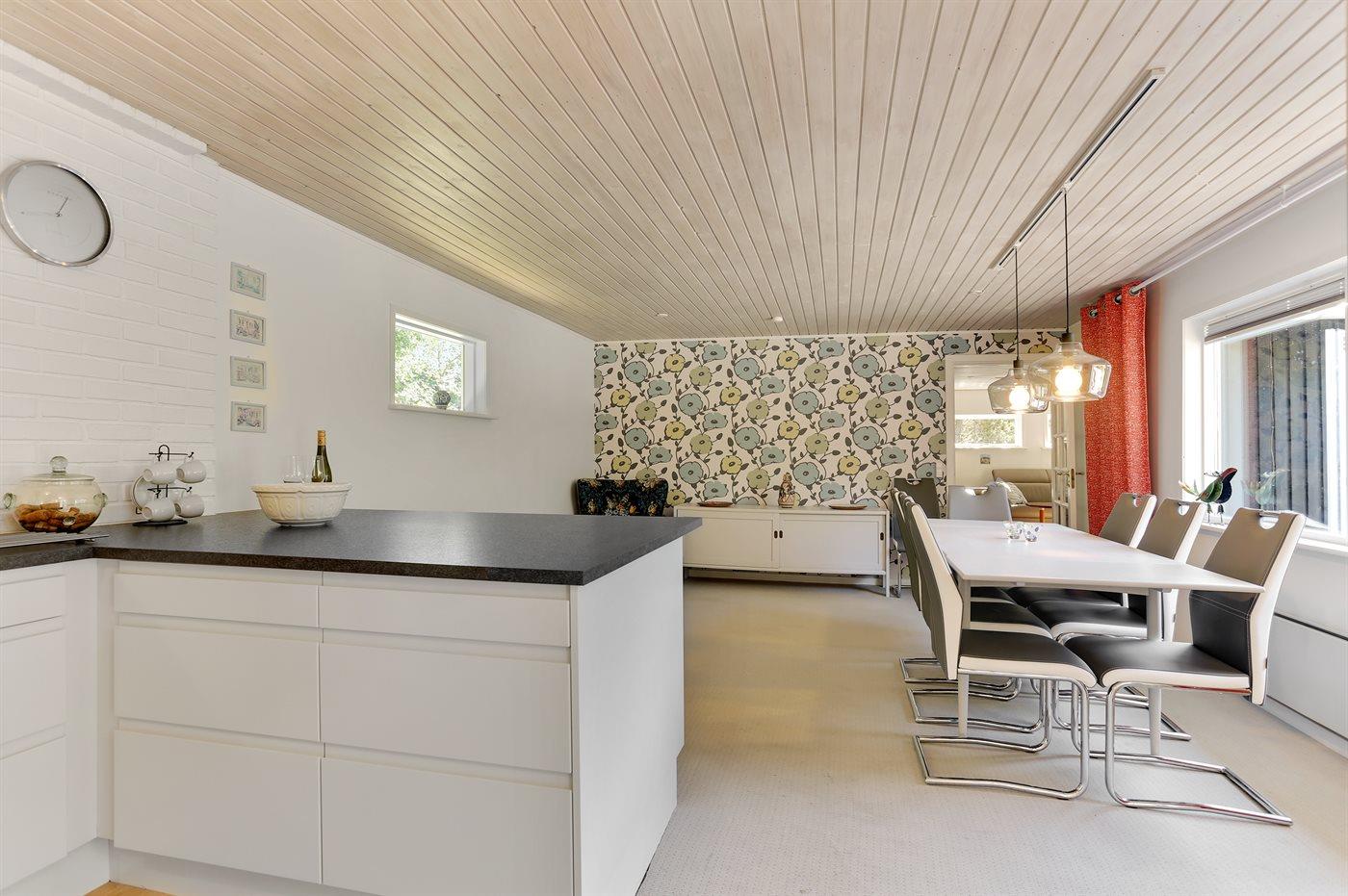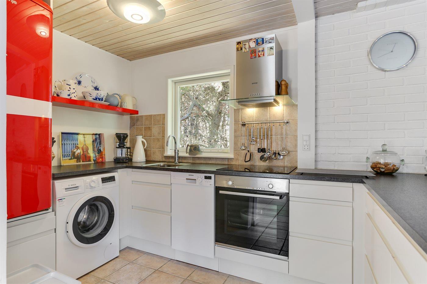 Køkkenet er udstyret med 1 køleskab. Der er 4 keramiske kogeplader, varmluftovn samt opvaskemaskine.