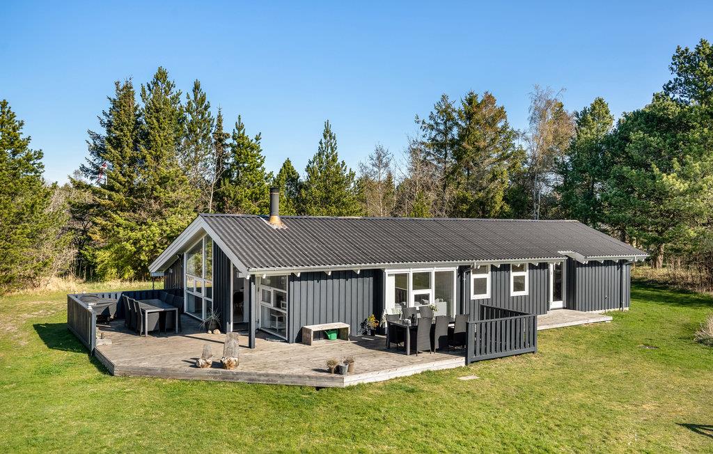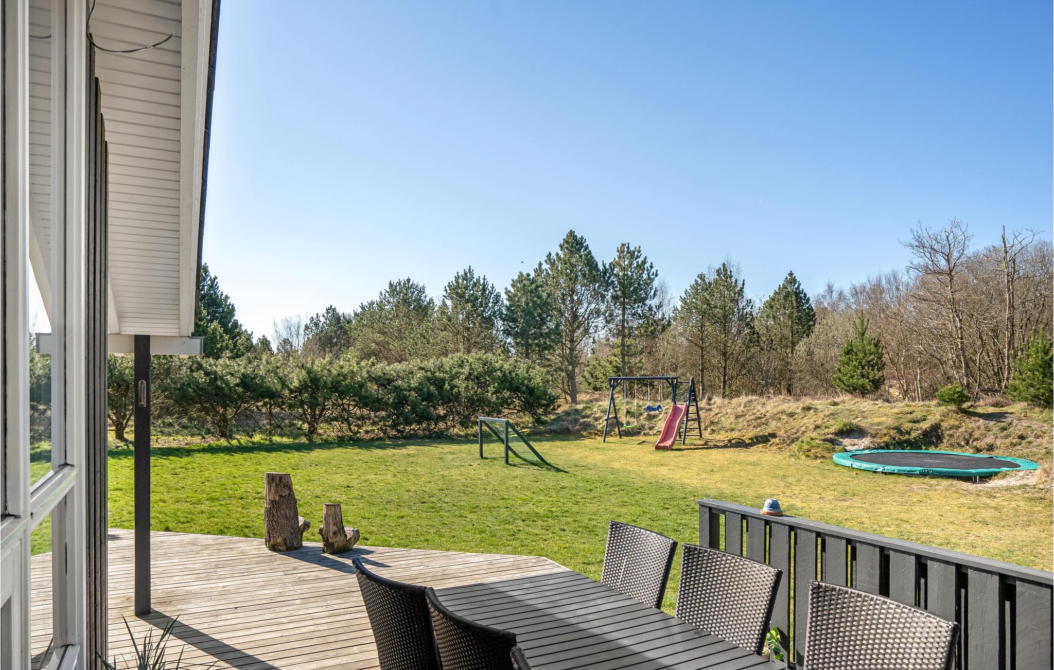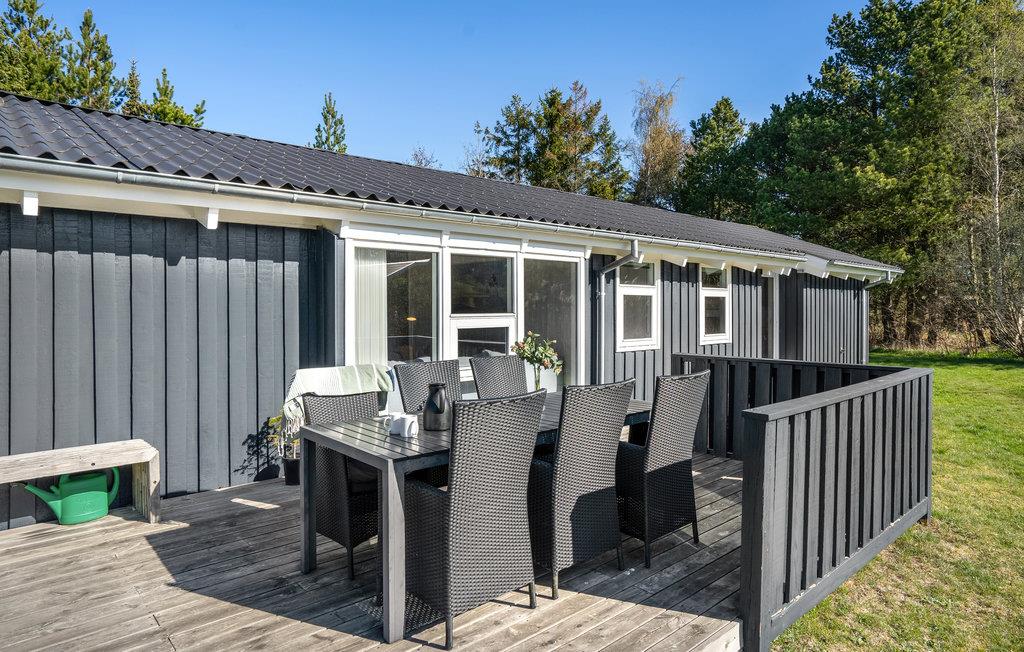 Udenfor er der en stor terrasse, hvorfra I kan træde ud på en grøn grund, der er omkranset af træer. Her har børnene god plads til at løbe og lege, og så er der selvfølgelig også den nærliggende strand, hvor I kan bade, gå lange ture og nyde nogle fantastiske solopgange, hvis I er morgenfriske.