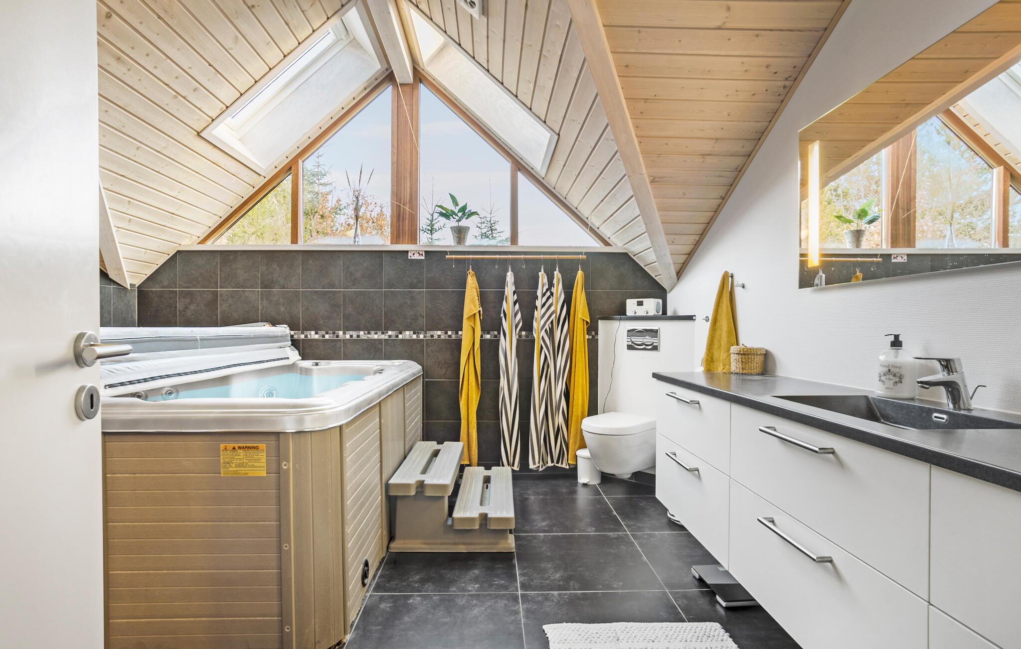 Jeres feriehus ved Bratten Strand er det ideelle sted til afslappende dage ved Ålbæk Bugt. Start morgenen med en rolig morgenmad på terrassen, mens I nyder udsigten over den store naturhave. Her kan børnene lege og tumle sig, så meget de vil. Indendørs inviterer den stilfuldt indrettede opholdsstue med en hyggelig sofakrog og et rummeligt spisebord til fælles stunder. For variation sørger aktivitetsrummet, der byder på bordfodbold og billard, for sjov og underholdning. Et andet højdepunkt i huset er det velgørende spabad. Dyk ned i det boblende vand og glem hverdagen for en stund. Saunaen lover også varme og afslapning.