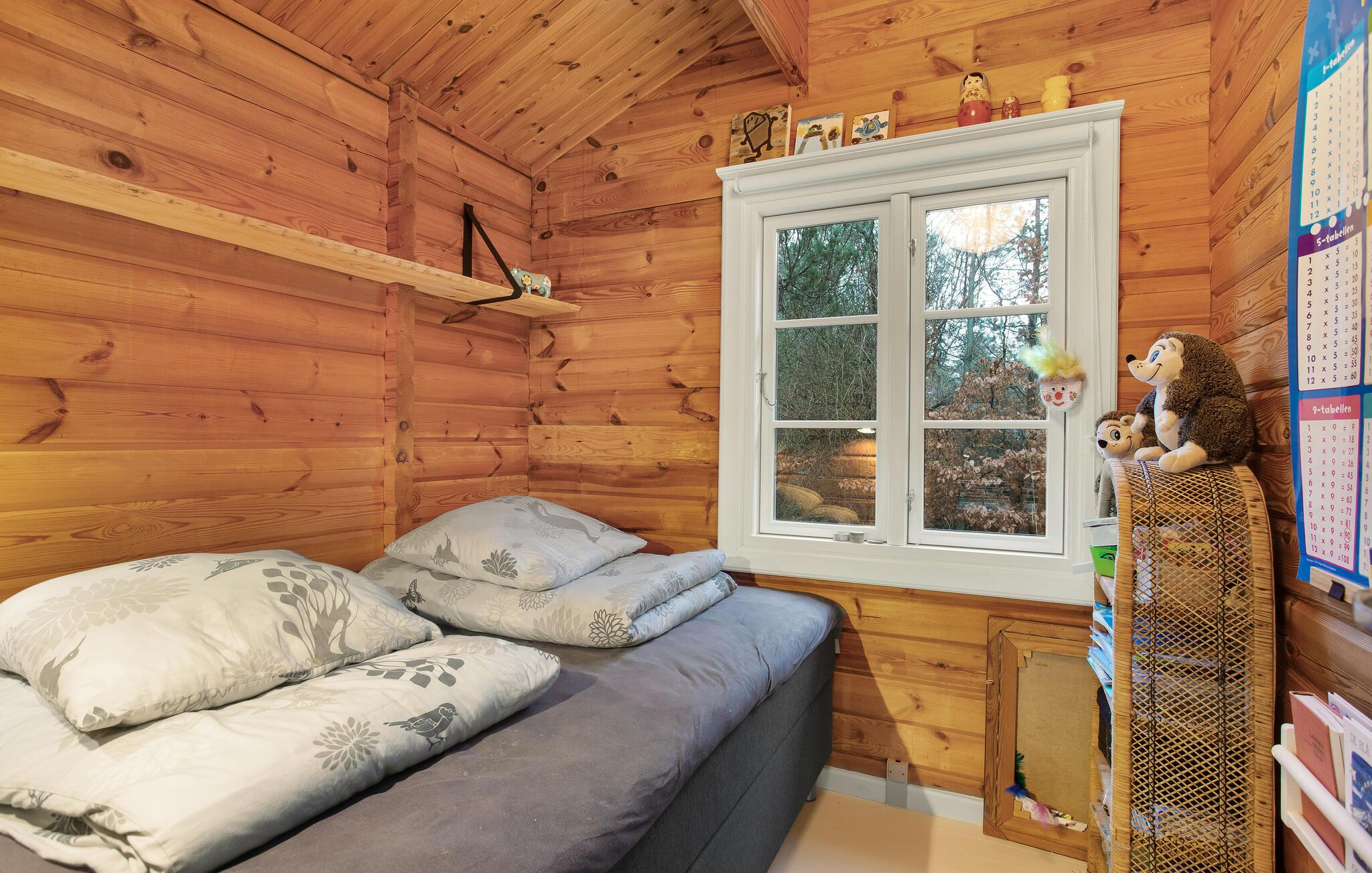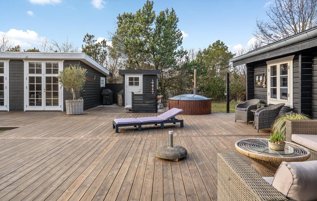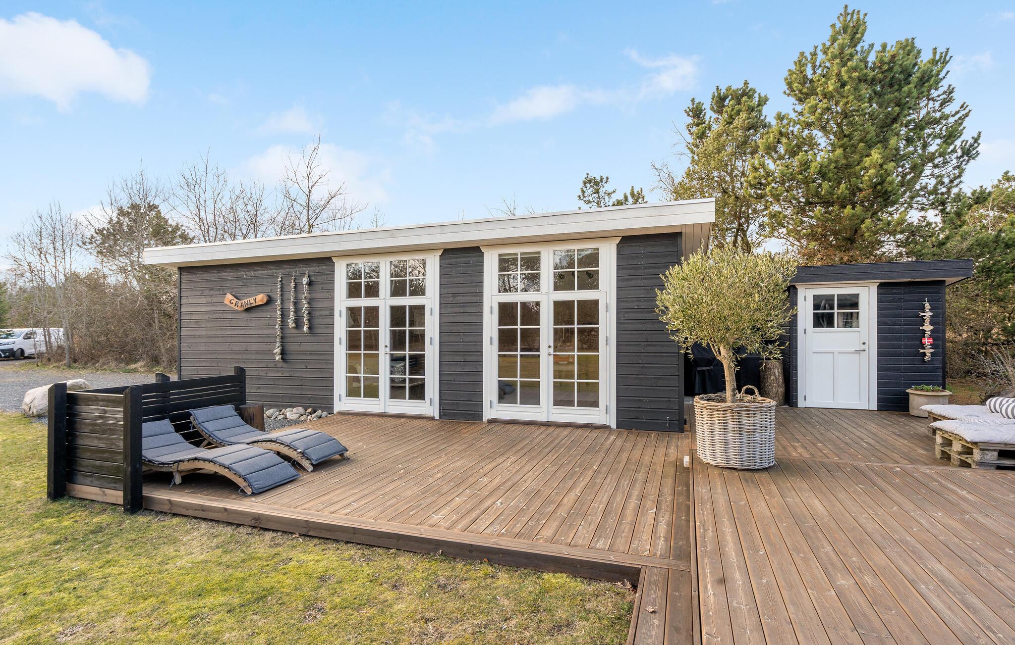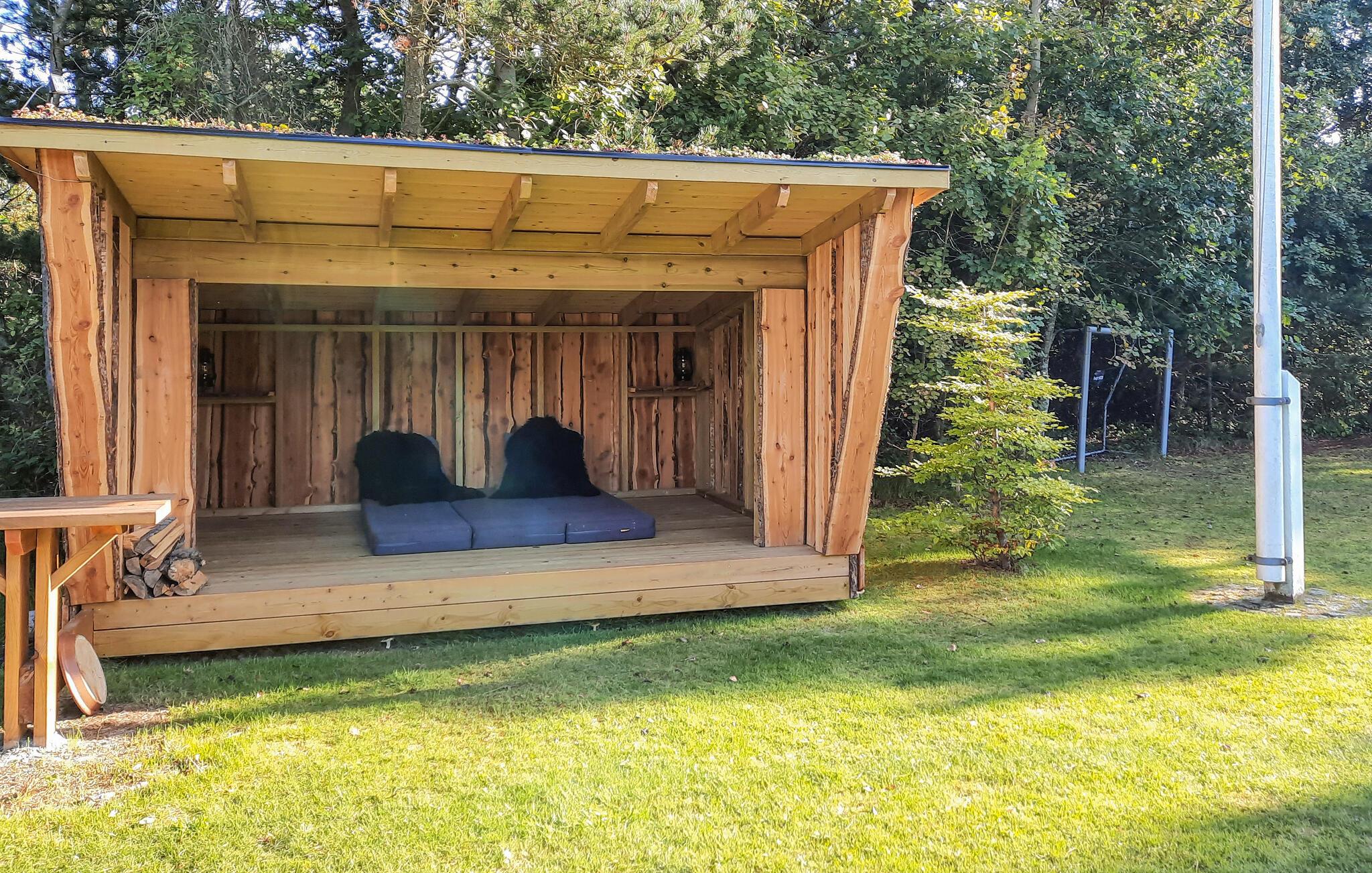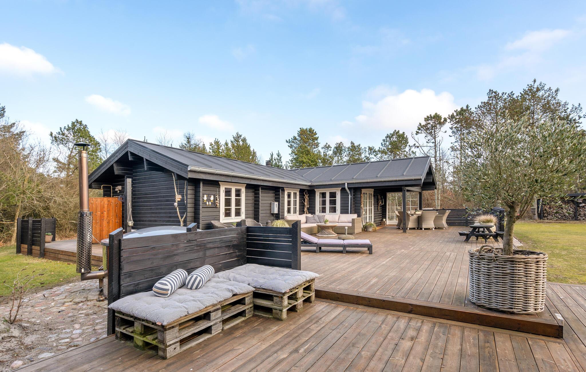 Huset oser af charme, takket være stemningsfulde trævægge- og lofter, synlige loftsbjælker og smagfuld indretning. Det ligger på en stor grund med trampolin, badmintonnet, fodboldmål og god plads til leg og udendørsspil. Fra stuen er der udgang til den store træterrasse, hvor I kan sidde og nyde feriens måltider, solbade og holde hyggelige grillaftener. Til huset hører også to annekser; i det ene er der toilet, i det andet et soveværelse og et aktivitetsrum, hvor I bl.a. finder bordtennisbord, dart og petanque. Skulle alt dette ikke være nok, tilbyder huset også en bålplads, hvor der kan bages snobrød, og en afskærmet udendørsbruser til hurtig afkøling på varme sommerdage og til at skylle sandet af sig efter en strandtur. Sidst men ikke mindst er der det fantastiske vildmarksbad, hvor en skøn feriedag kan afsluttes med en drink i hånden.