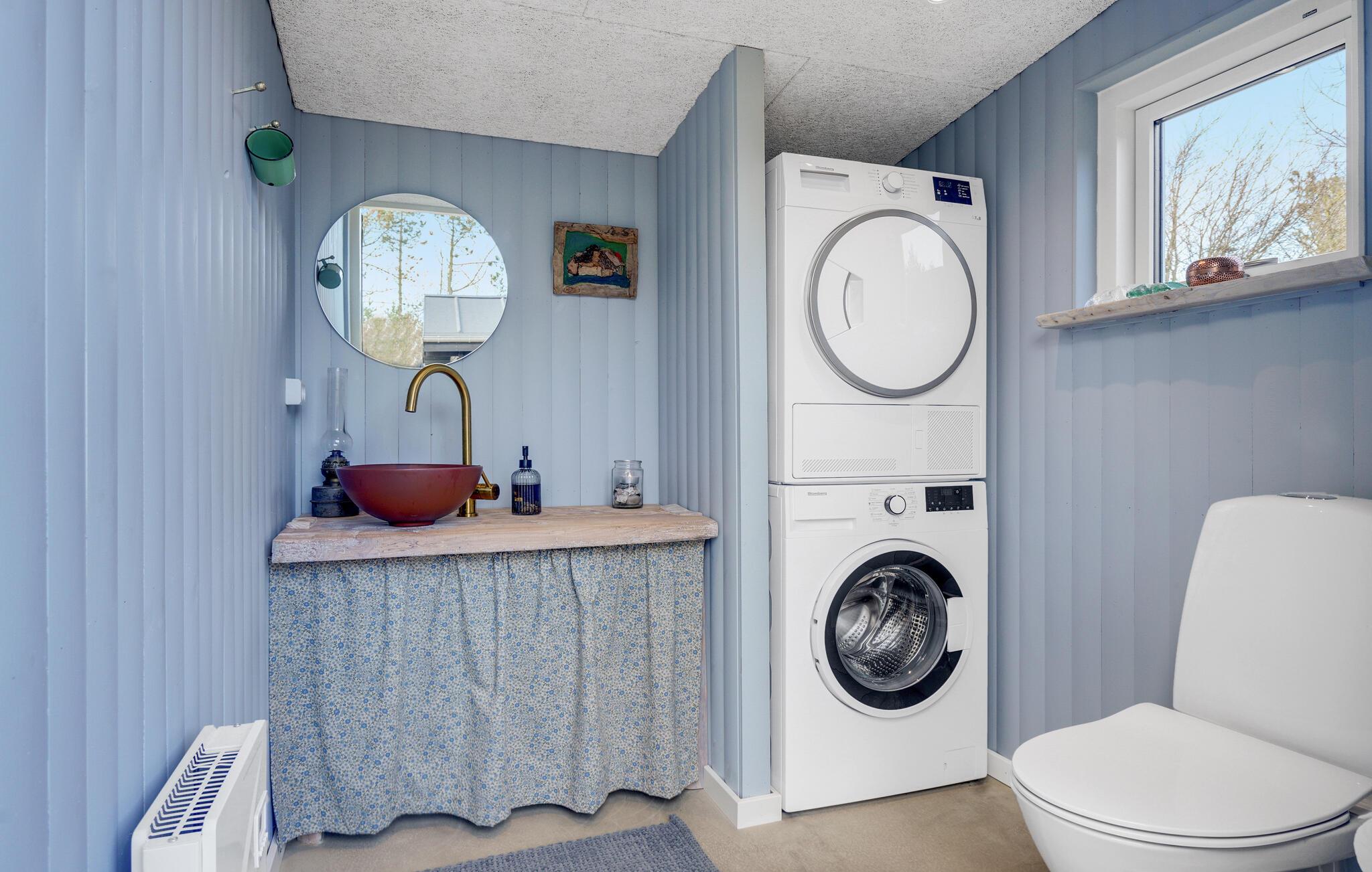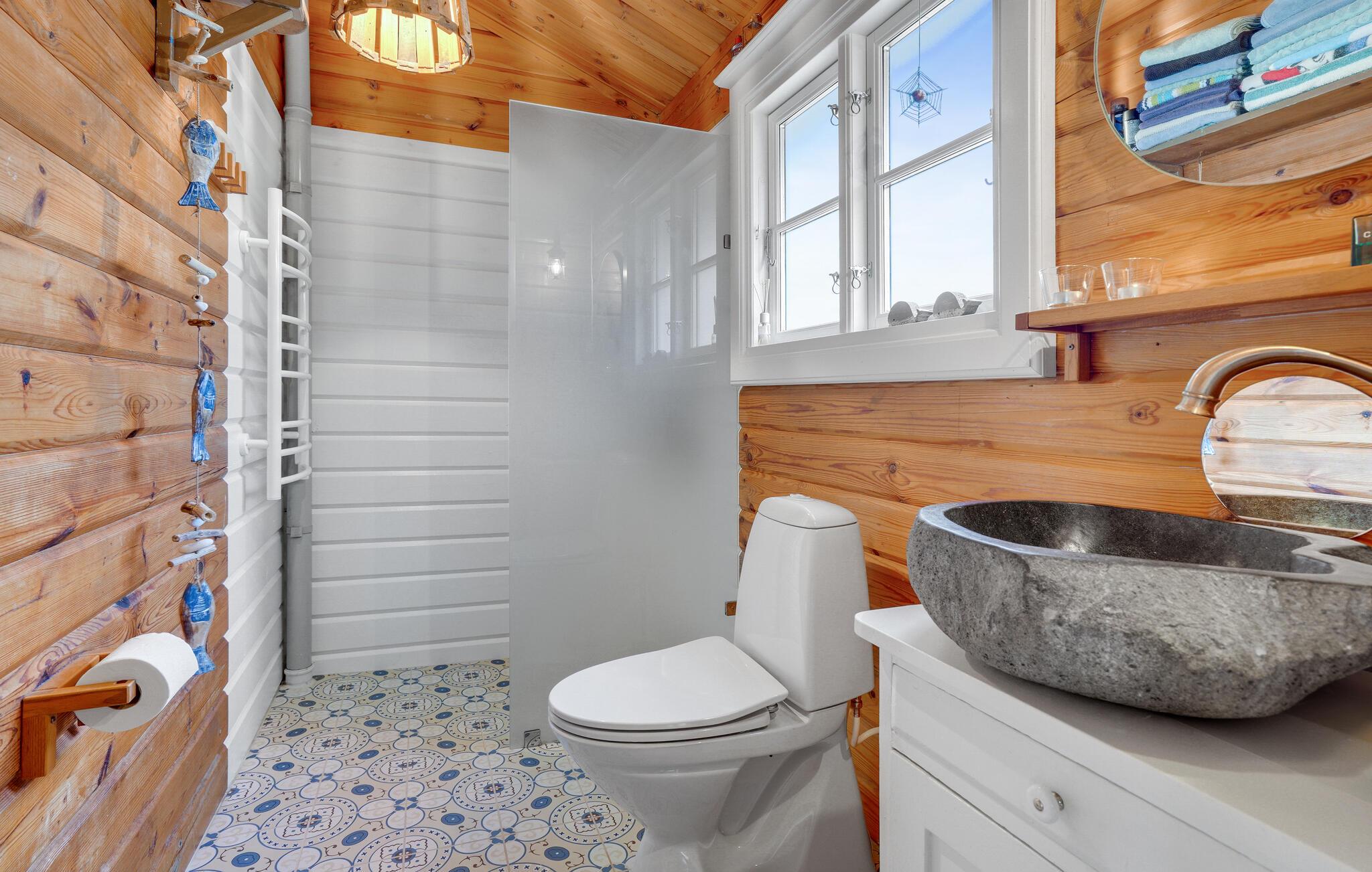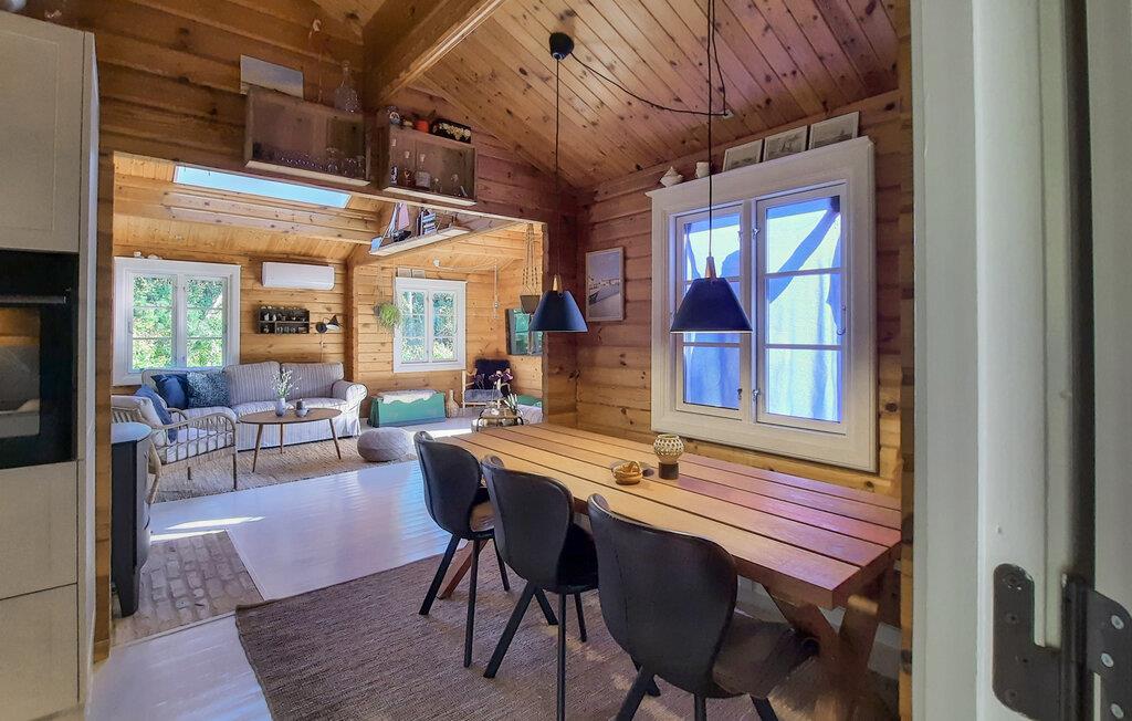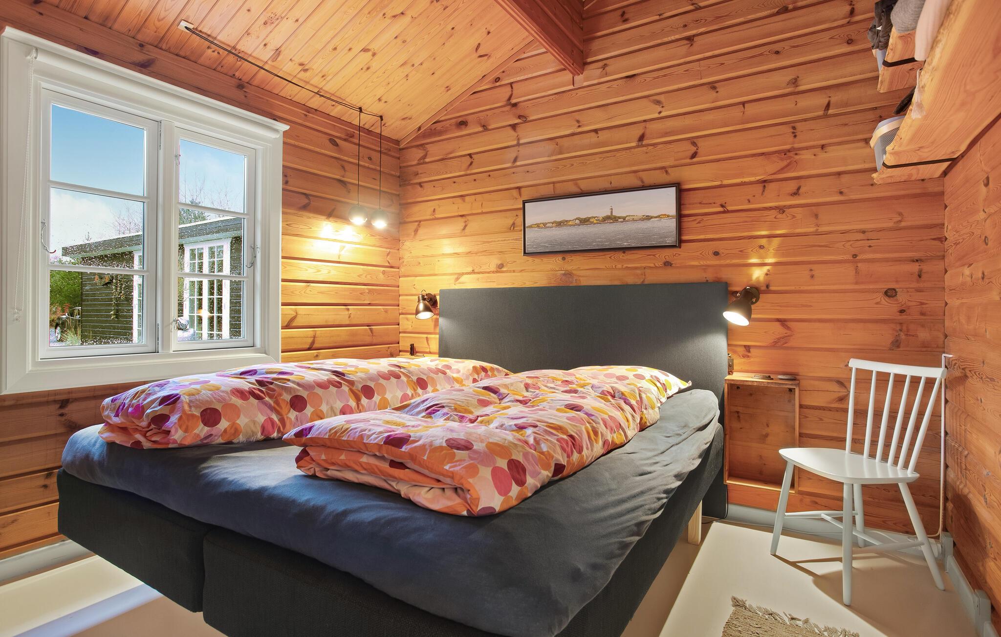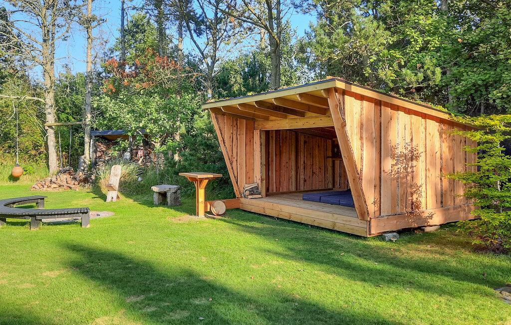 Huset oser af charme, takket være stemningsfulde trævægge- og lofter, synlige loftsbjælker og smagfuld indretning. Det ligger på en stor grund med trampolin, badmintonnet, fodboldmål og god plads til leg og udendørsspil. Fra stuen er der udgang til den store træterrasse, hvor I kan sidde og nyde feriens måltider, solbade og holde hyggelige grillaftener. Til huset hører også to annekser; i det ene er der toilet, i det andet et soveværelse og et aktivitetsrum, hvor I bl.a. finder bordtennisbord, dart og petanque. Skulle alt dette ikke være nok, tilbyder huset også en bålplads, hvor der kan bages snobrød, og en afskærmet udendørsbruser til hurtig afkøling på varme sommerdage og til at skylle sandet af sig efter en strandtur. Sidst men ikke mindst er der det fantastiske vildmarksbad, hvor en skøn feriedag kan afsluttes med en drink i hånden.