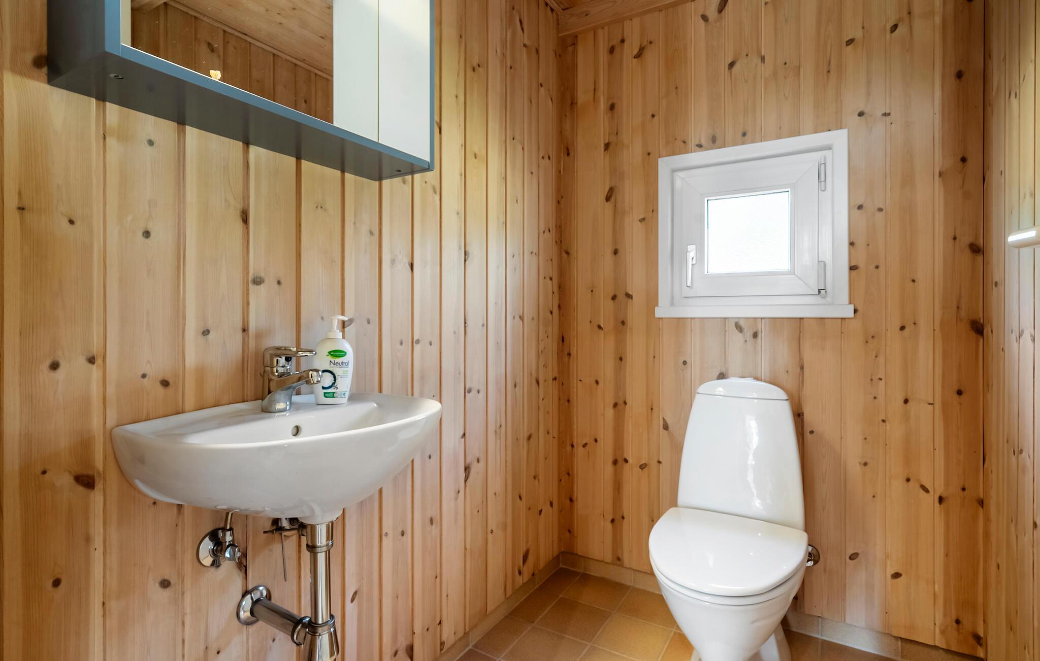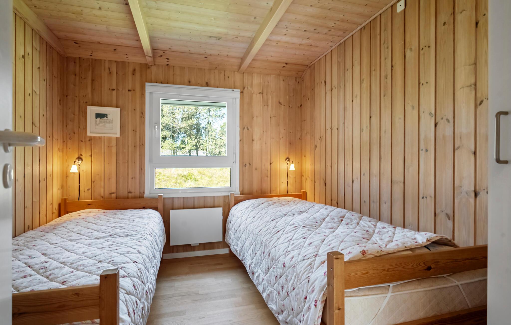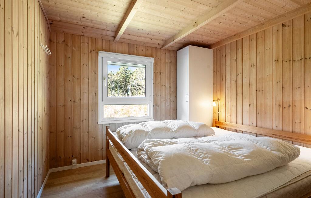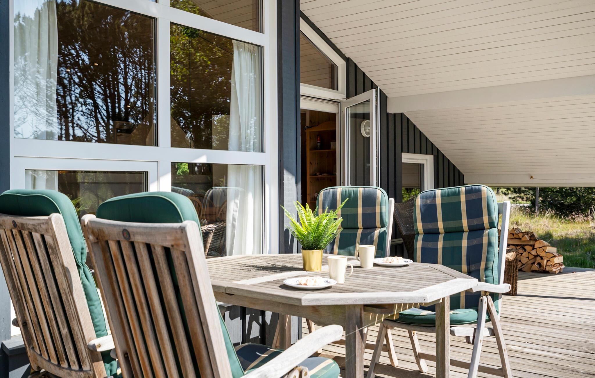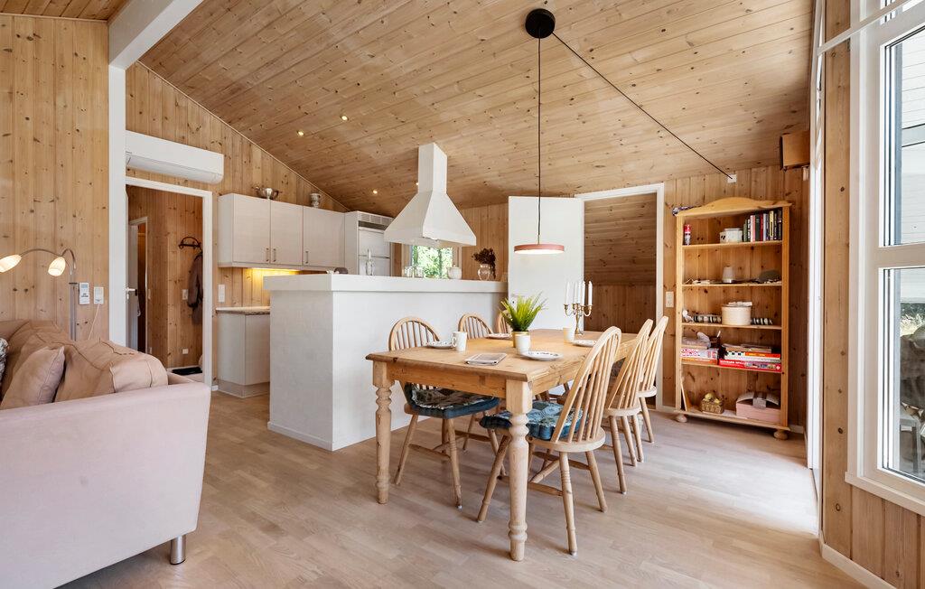 Nyd en afslappende ferie midt i smuk natur, kun nogle få minutters gang fra den dejlige strand. Opholdsstuen har højt til loftet, store panoramavinduer og en stilfuld træstemning. Tilbring tid i den komfortable sofa, brug lænestolen til at læse jeres ferieroman og nyd varmen fra brændeovnen. Den åbne spisestue med et stort træbord lægger op til at nyde måltider sammen. Køkkenet er godt udstyret og smelter smukt ind i rummet.
