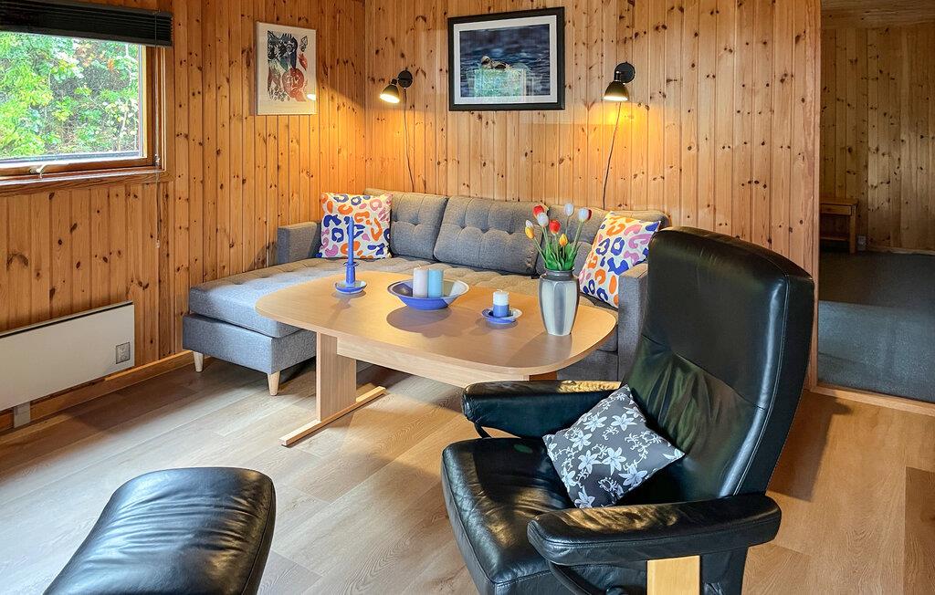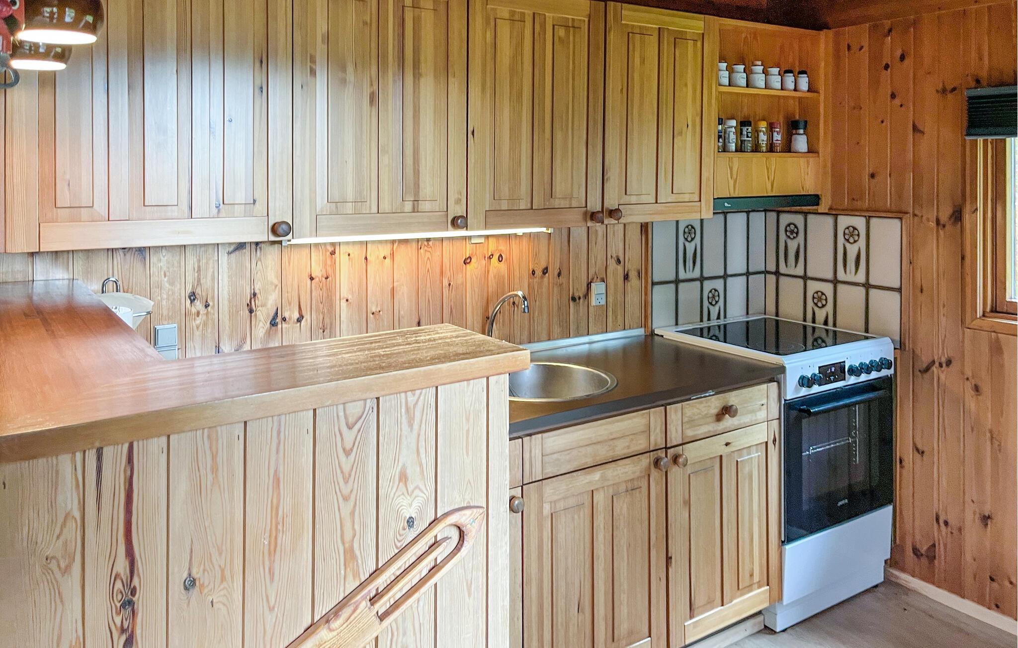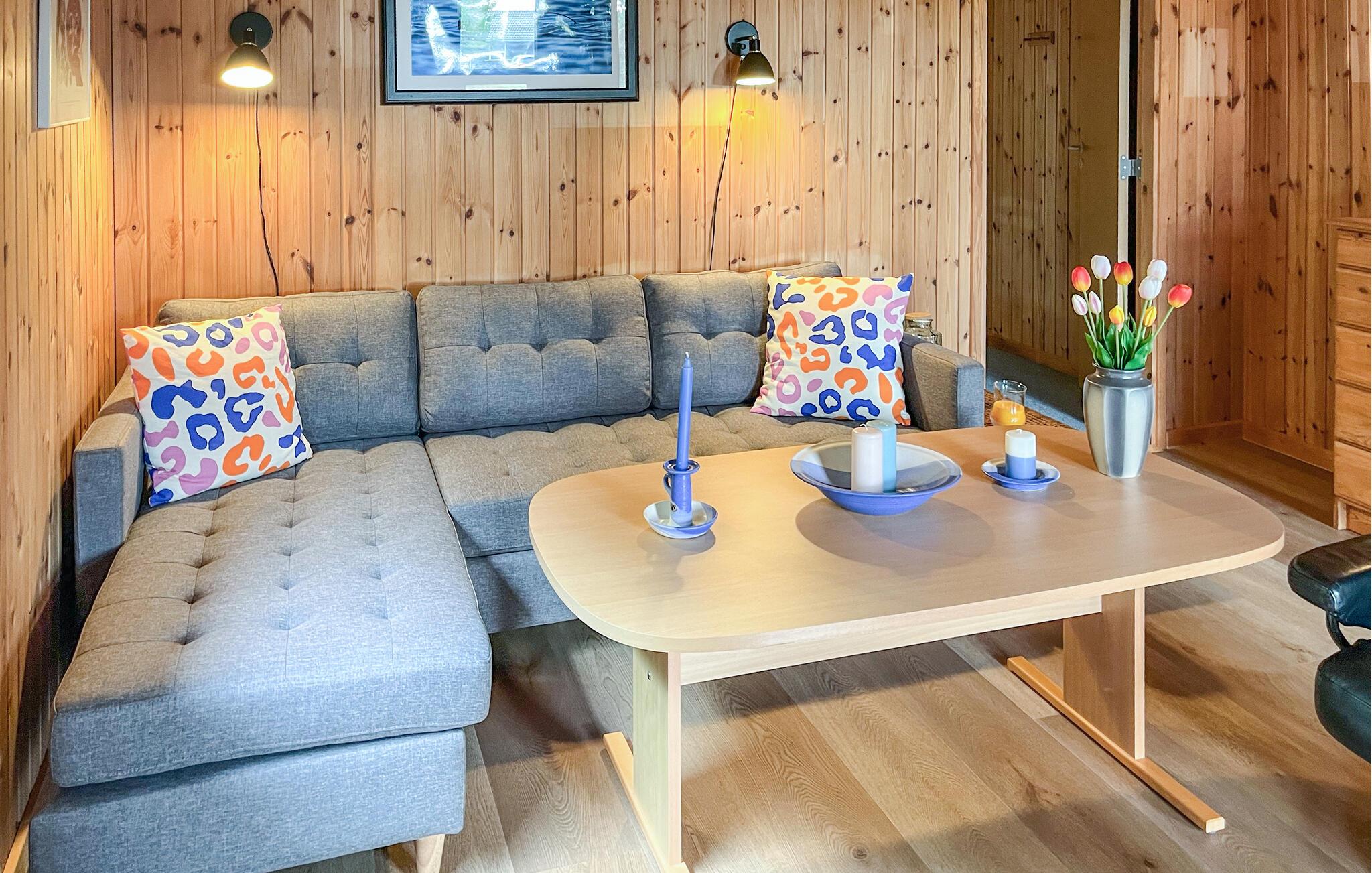Tilbring en afslappende ferie i dette klassiske sommerhus, som med sin naturnære beliggenhed og varme træindretning skaber en særlig hyggelig atmosfære. Indenfor venter jer en indbydende bolig med rustik charme. Sæt jer godt til rette i de behagelige lænestole eller på hjørnesofaen, læs en bog, eller se en film. De træbeklædte vægge giver rummet en varm og venlig stemning. Det åbne køkken er funktionelt indrettet og ligger i forbindelse med spiseområdet med et stort bord, hvor I kan nyde jeres måltider sammen.