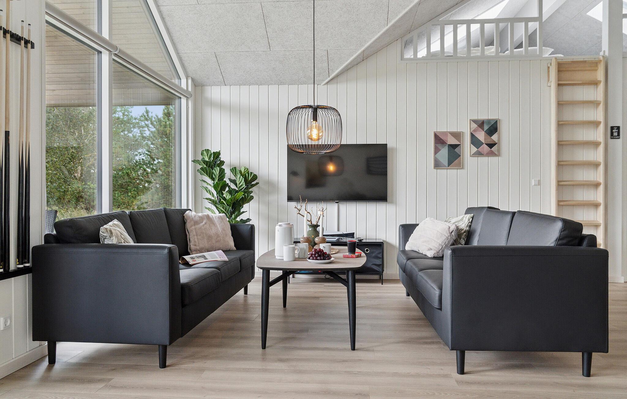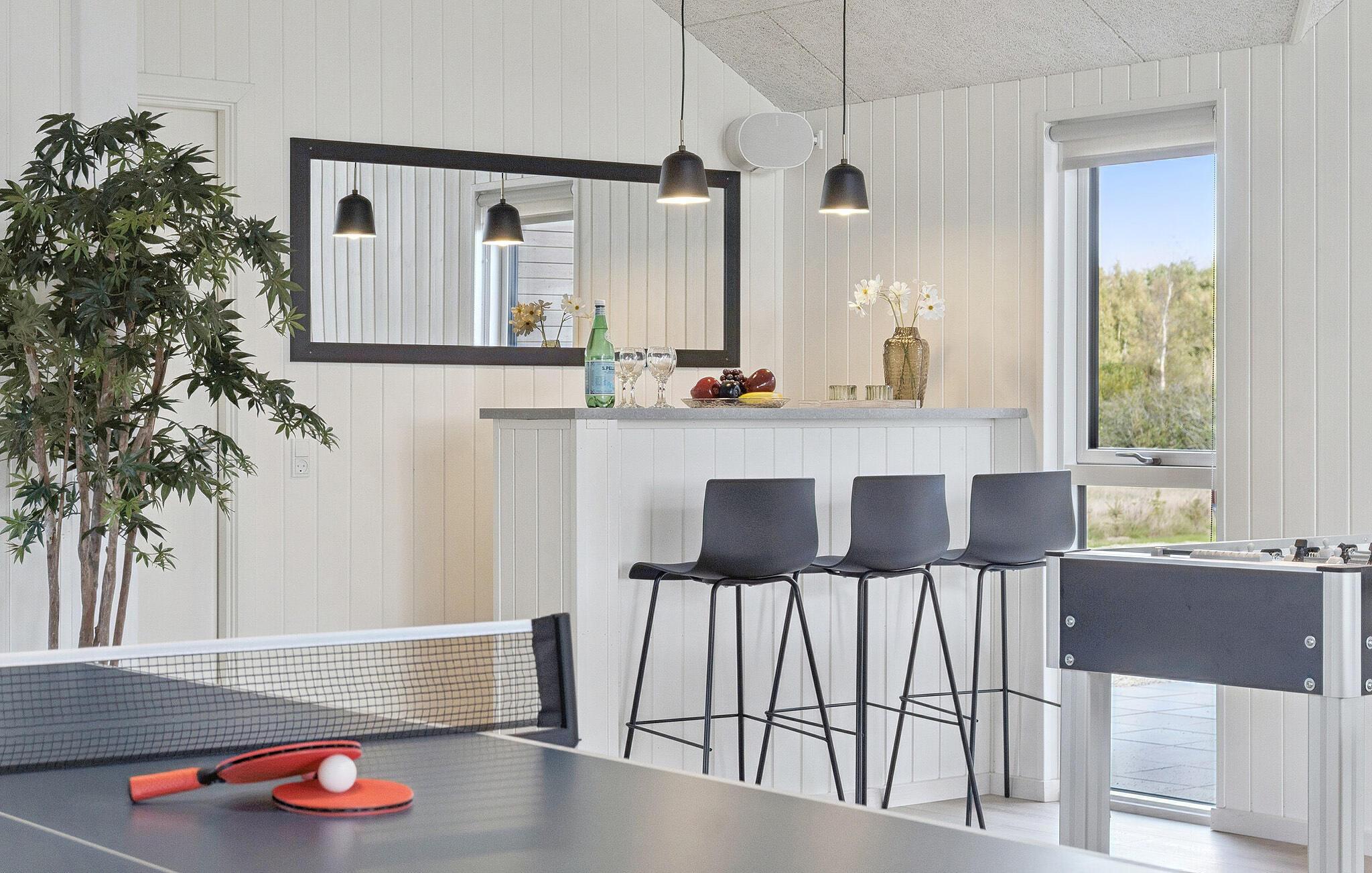 Dette rummelige hus er ideelt til en afslappende ferie for flere familier eller en vennegruppe. Hyg jer sammen i den store sofagruppe, eller tilbring hyggelige timer med mad og hyggesnak ved det store spisebord. For afveksling sørger indendørspoolen, hvor I når som helst kan tage en forfriskende dukkert. De, der har lyst til leg og sjov, kan dyste i billard, bordtennis eller bordfodbold, inden dagen rundes af i saunaens beroligende varme.