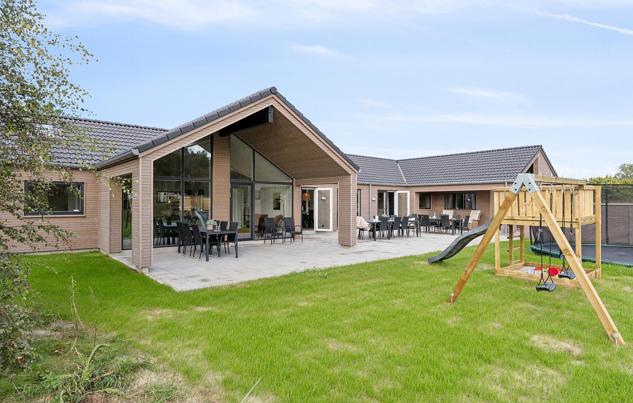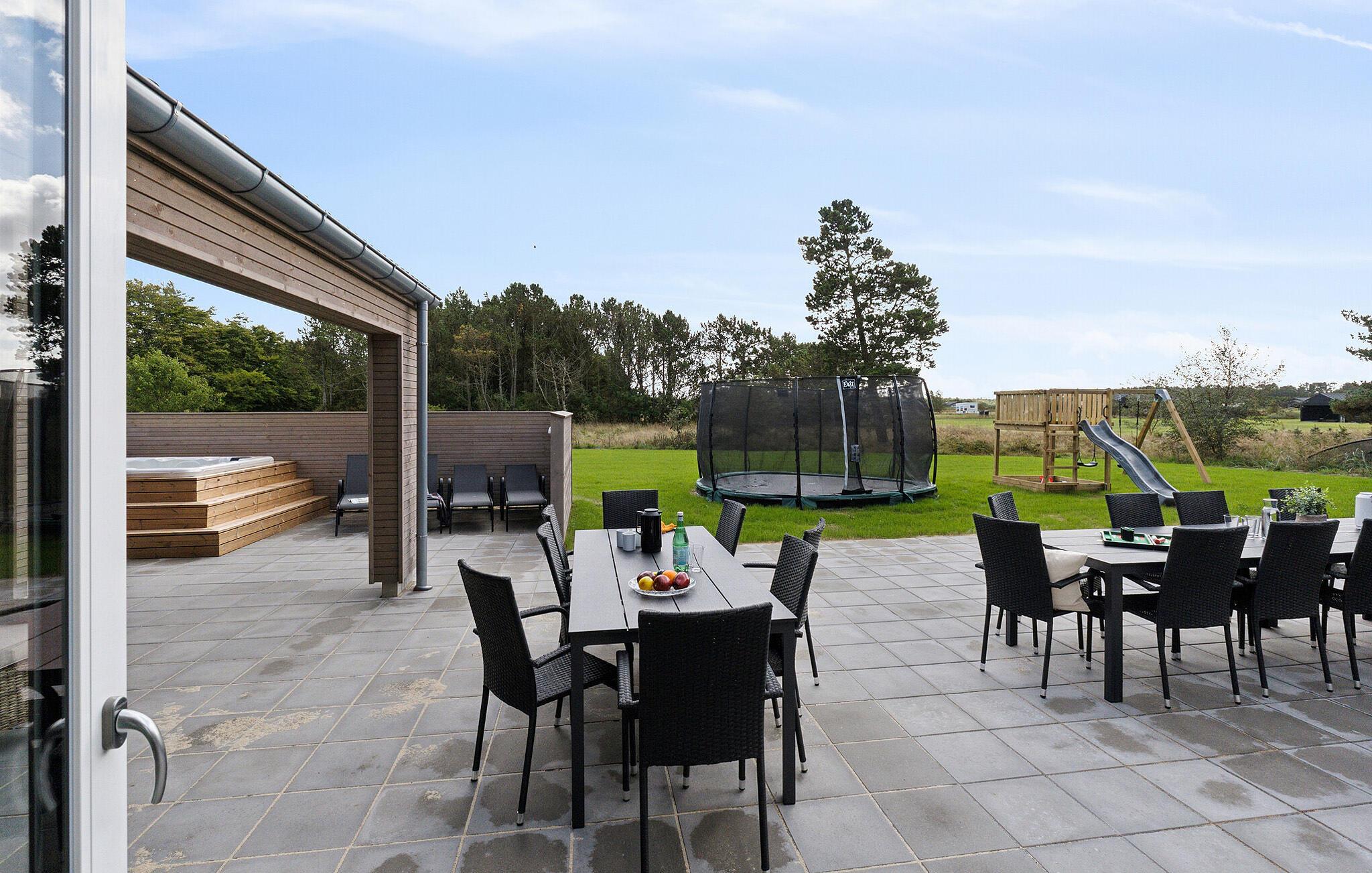 Begynd dagen med en hyggelig morgenmad under åben himmel, og lad morgensolen varme jer. Imens kan blikket vandre over det frodige grønne landskab og de rolige vidder. Mens børnene hopper på trampolinen, gynger eller spiller fodbold, kan I slappe af i spabadet og nyde freden. Om aftenen kan I tænde op i grillen i haven og skåle for dagen med et glas vin.