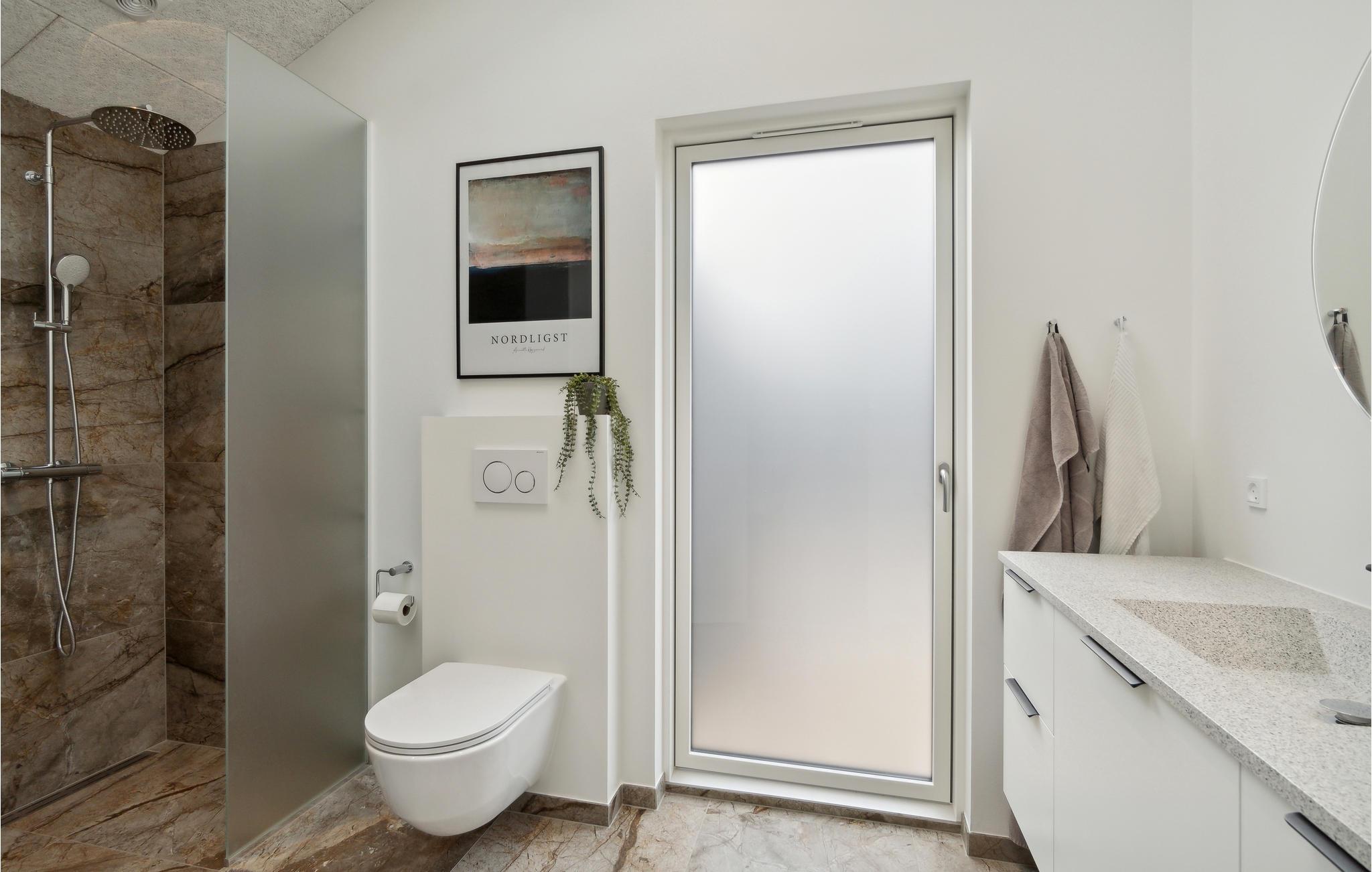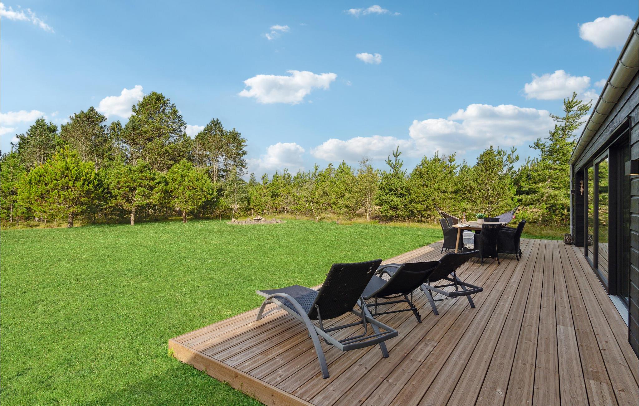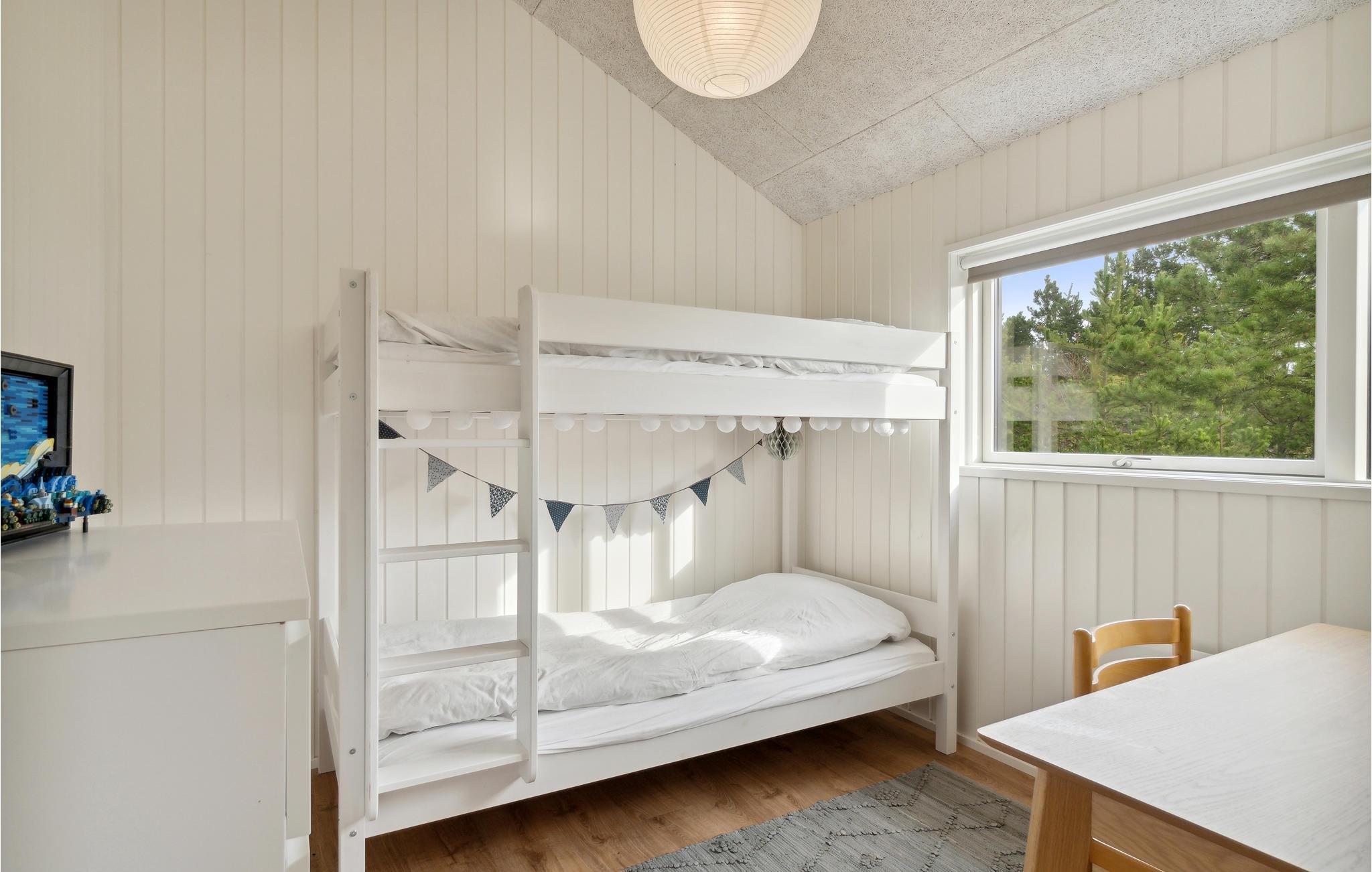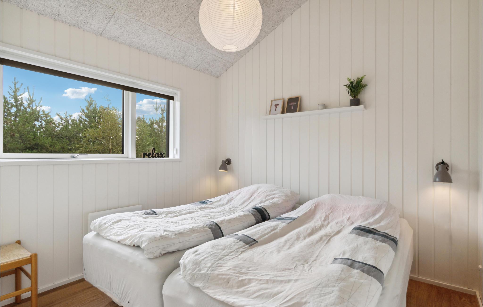 Velkommen til dette arkitektonisk interessante feriehus med en flot beliggenhed nær stranden. Huset er en drøm af lyse farver og fortryller med store panoramavinduer, som inviterer naturen indenfor. Her får I de ideelle rammer for en dejlig tid med hele familien. Selv de små vil føle sig hjemme i dette feriehus. Nyd udsigten over haven, mens I slapper af i den store hjørnesofa, og glæd jer til dejlige aftener med sjov fælles madlavning, lækre måltider og brætspilshygge ved spisebordet. Gå fra opholdsstuen og ud i den skønne have, hvor der er masser af plads til både store og små. Slik sol og slap af med kølige forfriskninger i loungehjørnet på den store træterrasse, mens jeres børn leger på livet løs. Senere kan hobbykokkene servere et lækkert måltid fra grillen, og sammen kan I nyde de lange sommeraftener udenfor. Gå til den smukke, bilfri strand, som I finder lige i nærheden.