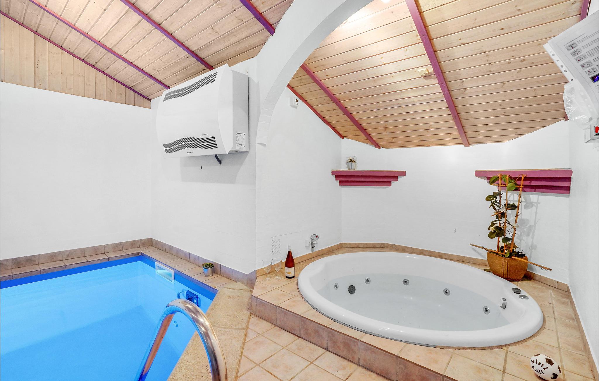 Rummeligt træhus med indendørs pool, spabad og tæt på badestrand i Bratten Strand, Nordjylland.