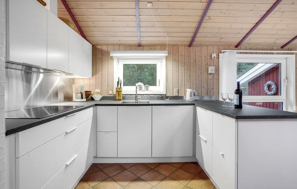 I dette hyggeligt indrettede feriehus er der god plads til to familier. Huset er indrettet med en hyggelig opholdsstue med brændeovn og gode møbler. Stuen ligger i åben forbindelse med køkkenet, og opholdsrummet fremstår særdeles luftigt takket være den flotte loft-til-kip-løsning.