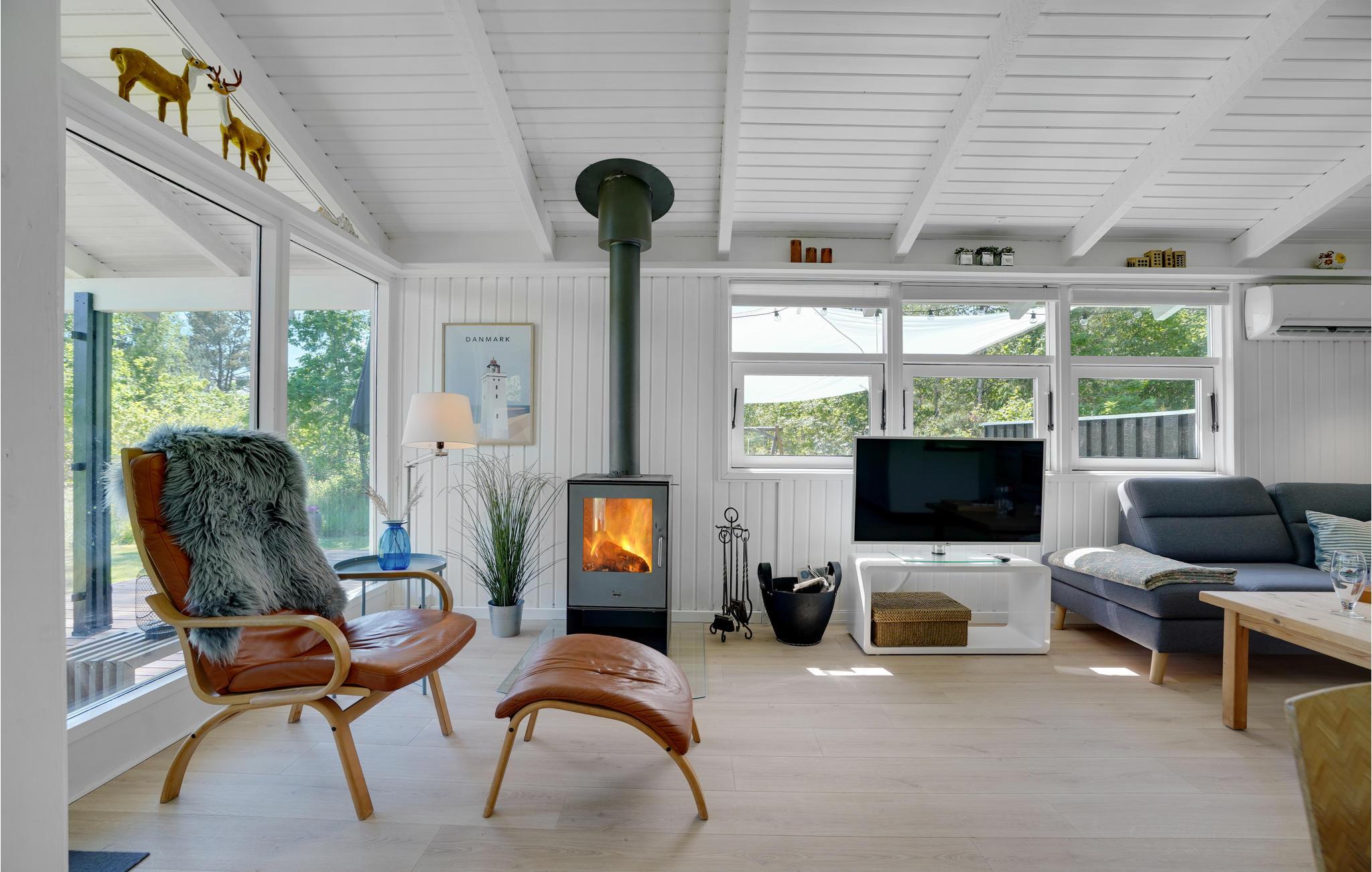 Køkken/alrummet har et lyst og luftigt udtryk takket være sit loft-til-kip og de store vinduespartier, der lyser lokalet dejligt op udefra. Ved brændeovnen finder I det perfekte sted at hygge sig med en god bog på en af de køligere aftener.