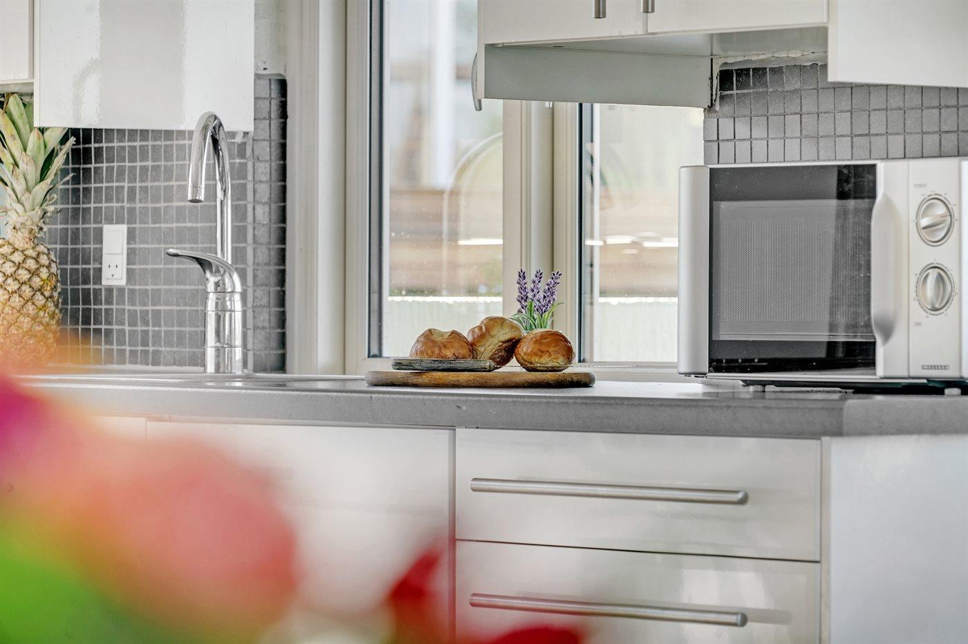 Køkkenet er udstyret med 1 køleskab. Der er 4 keramiske kogeplader, varmluftovn, mikrobølgeovn samt opvaskemaskine.