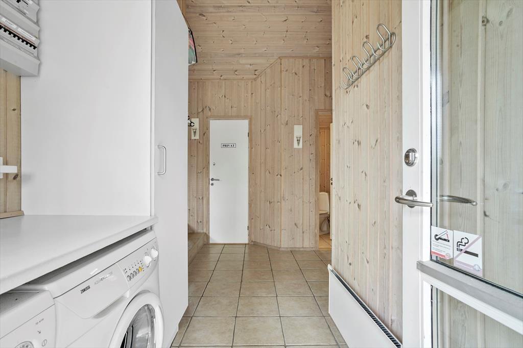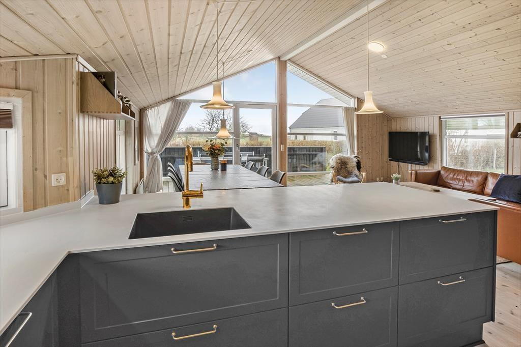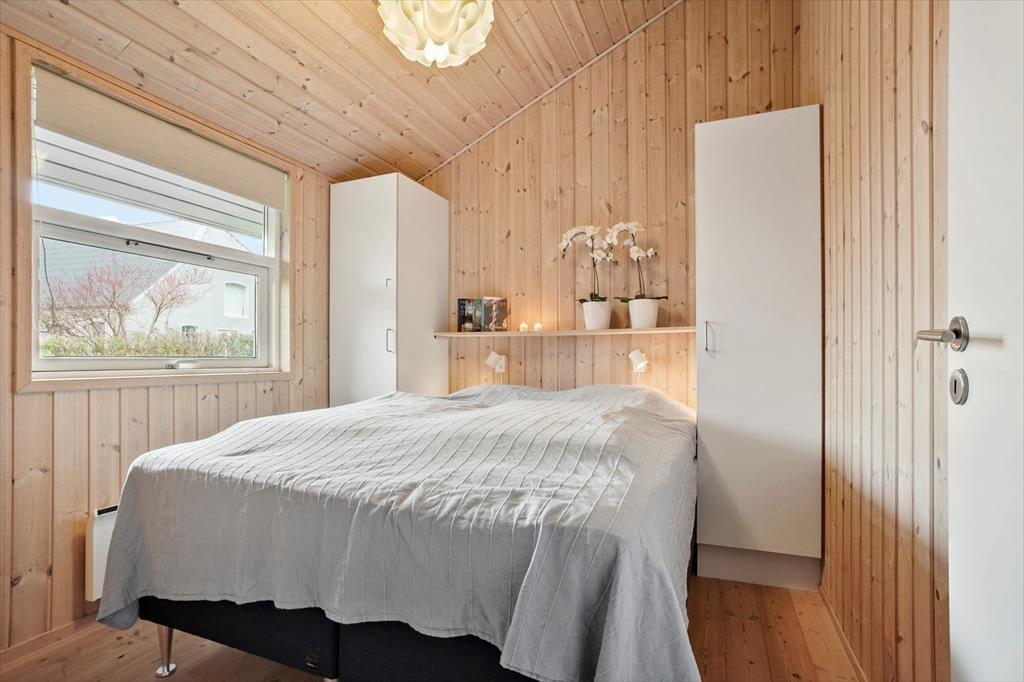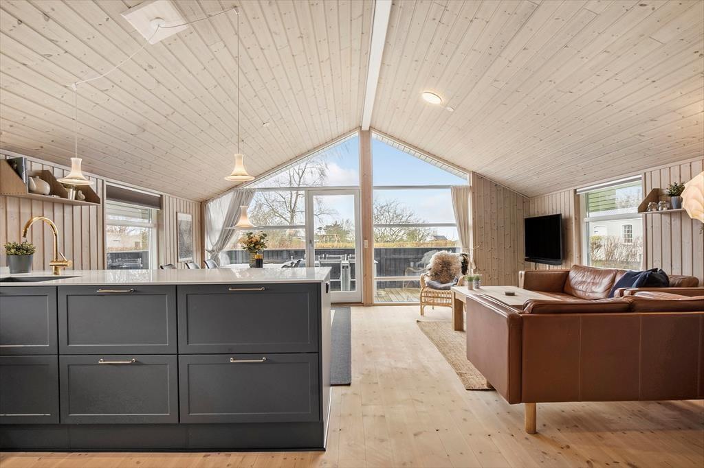 Moderne sommerhus med kig til havet. Huset er indrettet med 3 gode soveværelser samt en stor hems med madrasser. Derudover er der et veludstyret køkken i åben forbindelse med stuen med spiseplads, brændeovn, energibesparende varmepumpe og udgang til terrassen. Der er desuden et stort badeværelse med spabad og sauna, et lille gæstetoilet samt entré med vaskemaskine og tørretumbler.