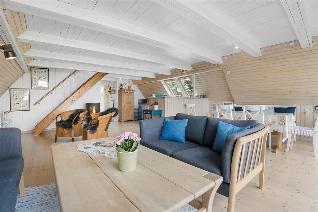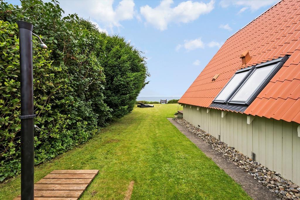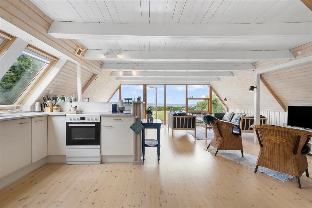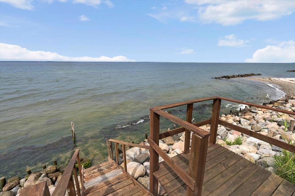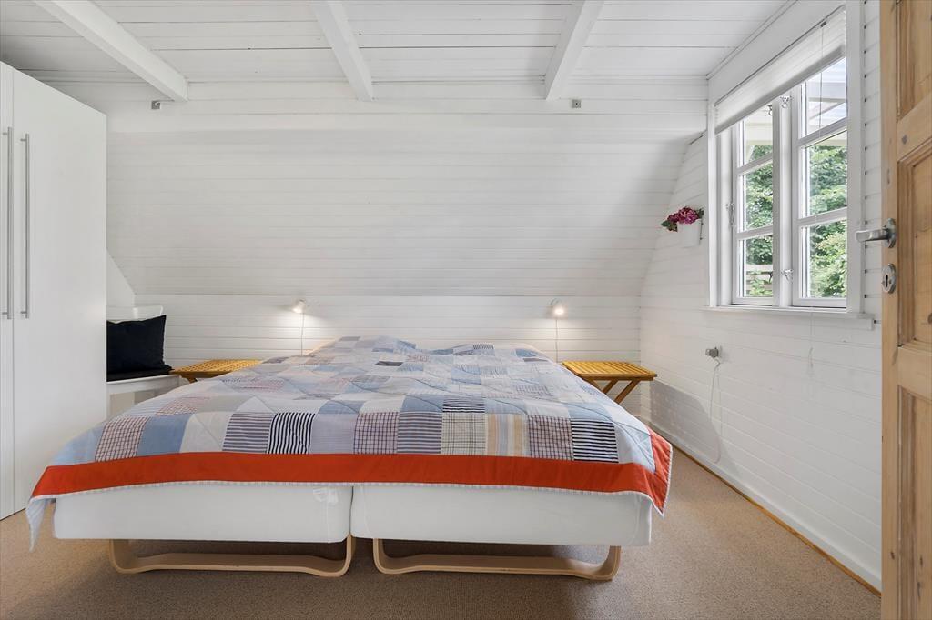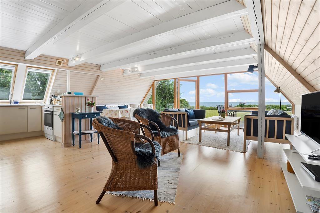 Renoveret sommerhus i 2 plan med områdets vel nok bedste beliggenhed. Fra haven er der trappe direkte ned til stranden. Midtvejs på trappen er der en fin repos, hvor man kan nyde solnedgangen. Huset ligger for enden af et lukket vænge og indeholder i stueetagen en stor kombineret spise- og opholdsstue med trappe til 1. salen samt et lyst køkken. Derudover er der i stueetagen et soveværelse med 2 senge, en entré samt et badeværelse med vaskemaskine. På 1. salen er der en lille repos samt 2 soveværelser, med 2 sovepladser i hver. Det ene værelse har panoramaudsigt til vandet. Området indbyder til afslapning, lange gåture eller måske en tur med fiskestangen.