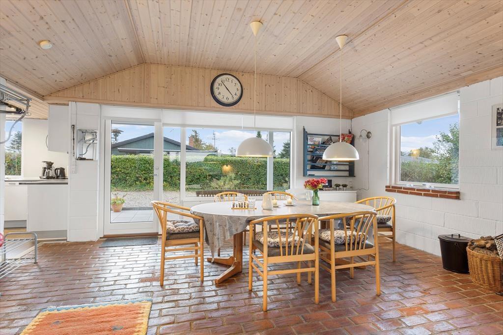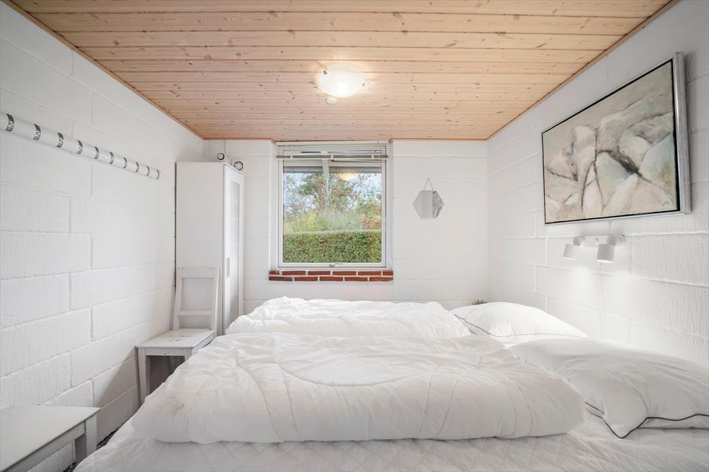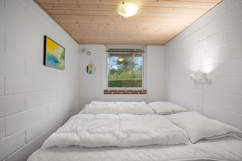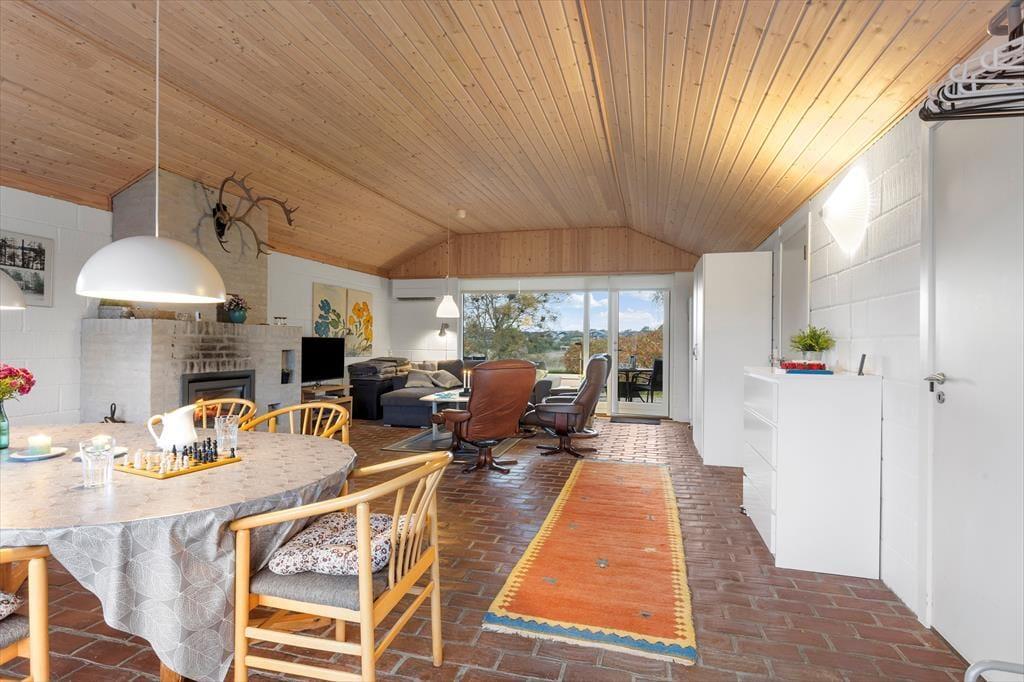 Sommerhuset har en lys og rummelig stue og spisestue, hvor de store vinduer lader naturen komme helt ind. Det karakteristiske murstensgulv giver rummet et rustikt og unikt udtryk, der sammen med brændeovnen og geviret på væggen skaber en hyggelig atmosfære året rundt. I stuen findes forskellige spil, som lægger op til hyggeligt samvær. Badeværelset er nyrenoveret i 2024 og har gulvvarme. Køkkenet er praktisk indrettet og har alt, hvad du behøver til madlavning i ferien, mens de to soveværelser – begge med komfortable senge fra 2024 – giver god plads til fire personer. Huset er derfor ideelt til den lille familie, to par eller måske lystfiskeren eller golfspilleren, der søger fred og komfort efter en aktiv dag.