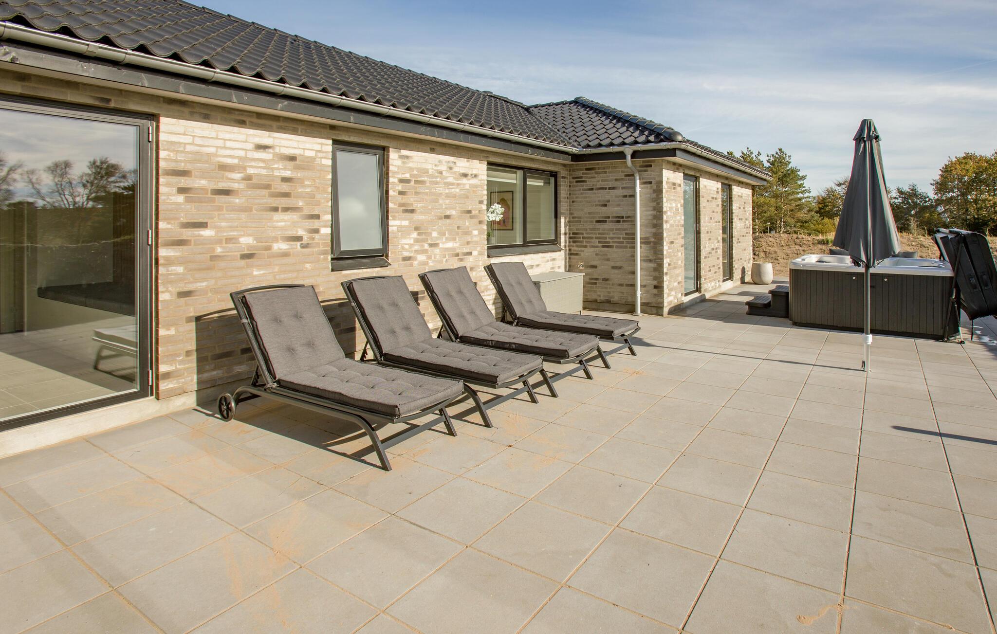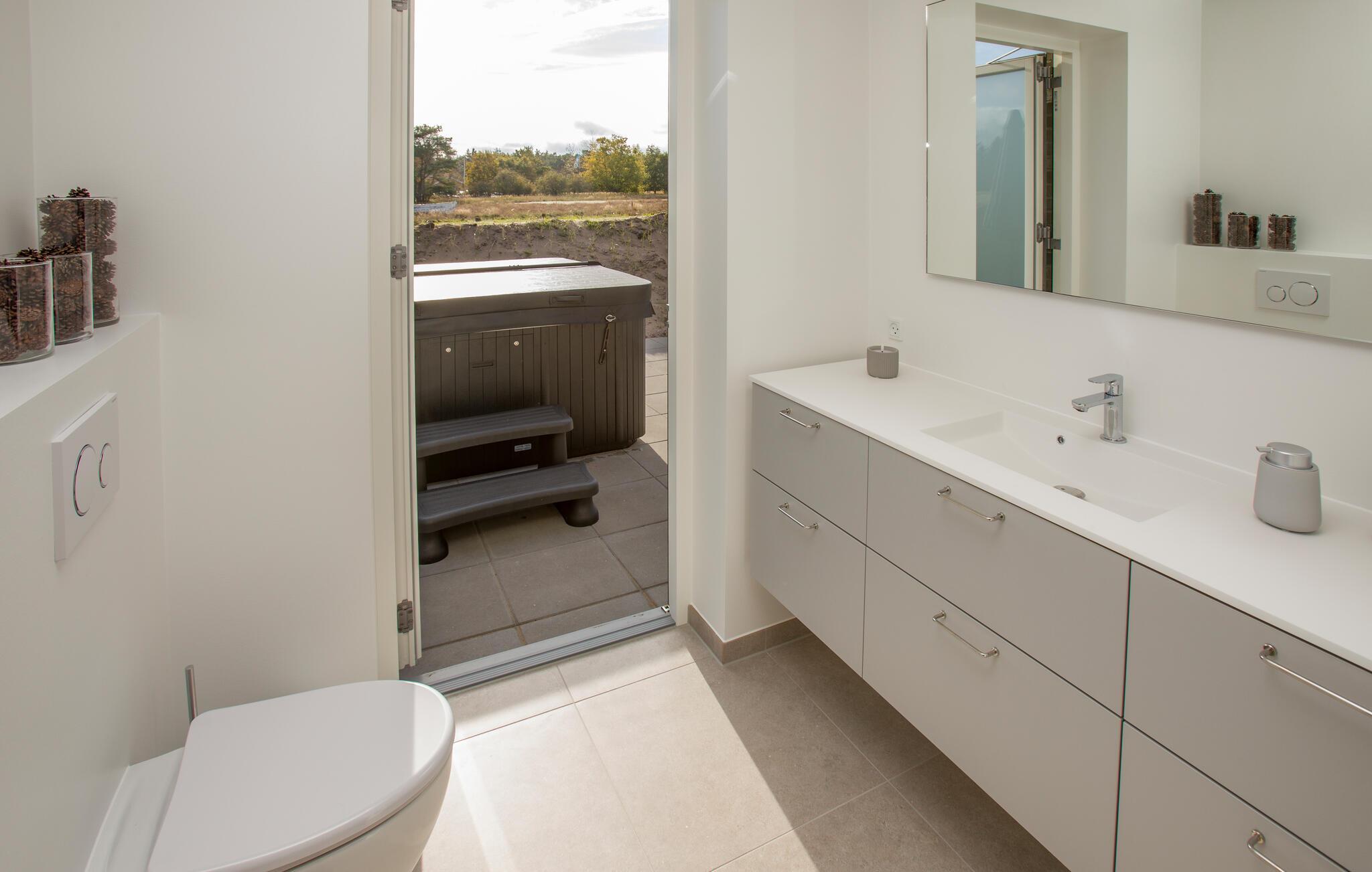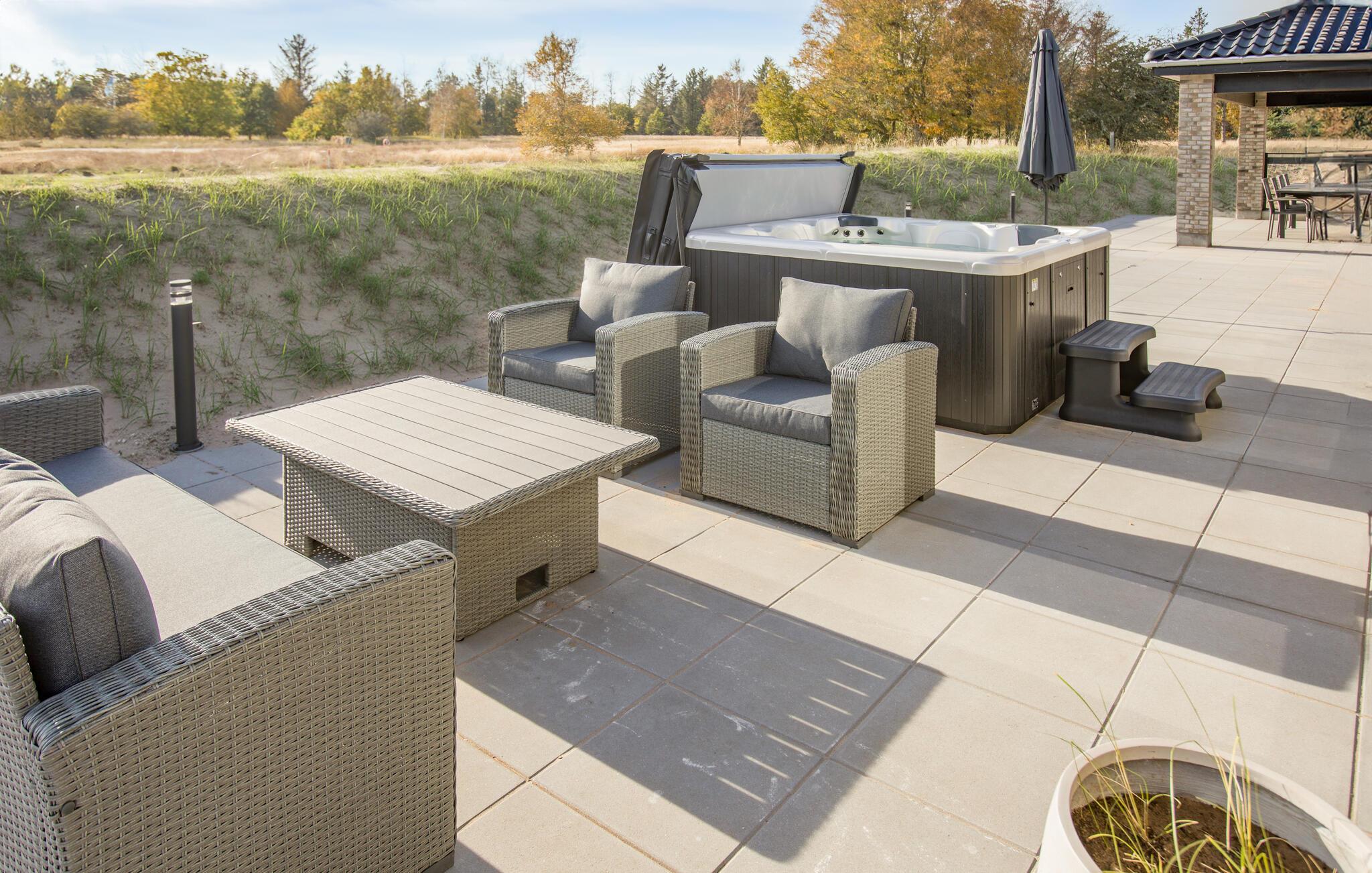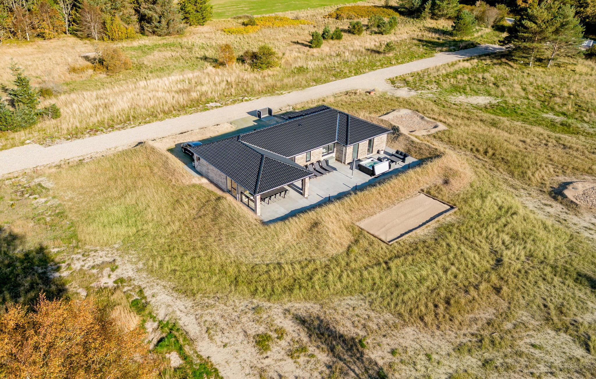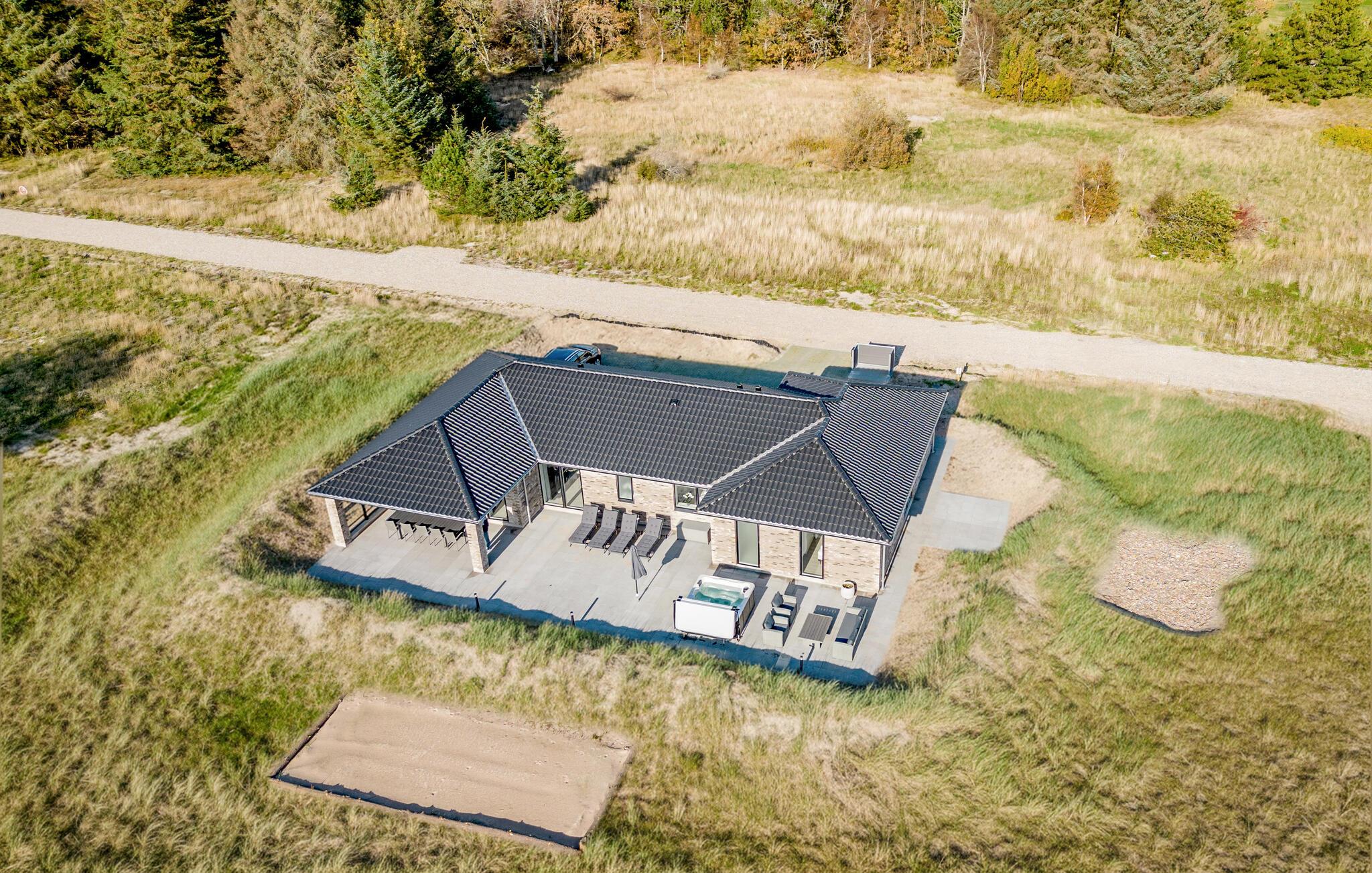 Moderne feriehus ved Hvide Klit golfbane med spabad og aktivitetsrum nær strand og natur.