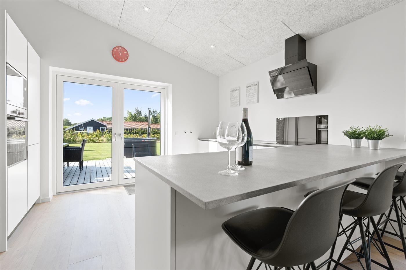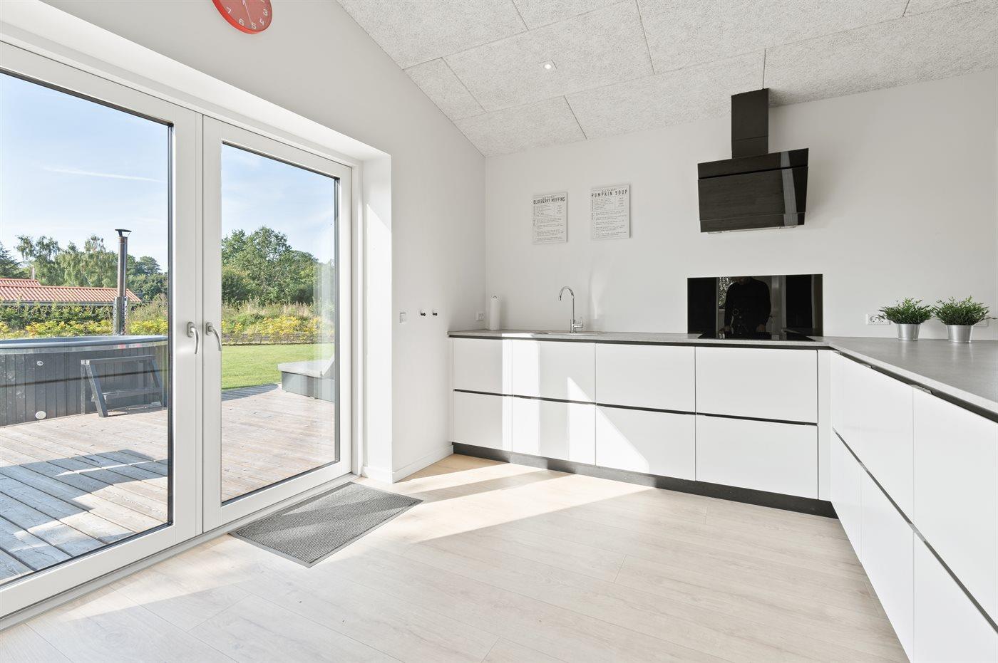 Køkkenet er udstyret med 1 køleskab. Der er 4 induktionskogeplader, varmluftovn, mikrobølgeovn samt opvaskemaskine.