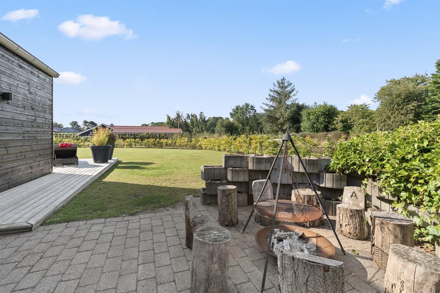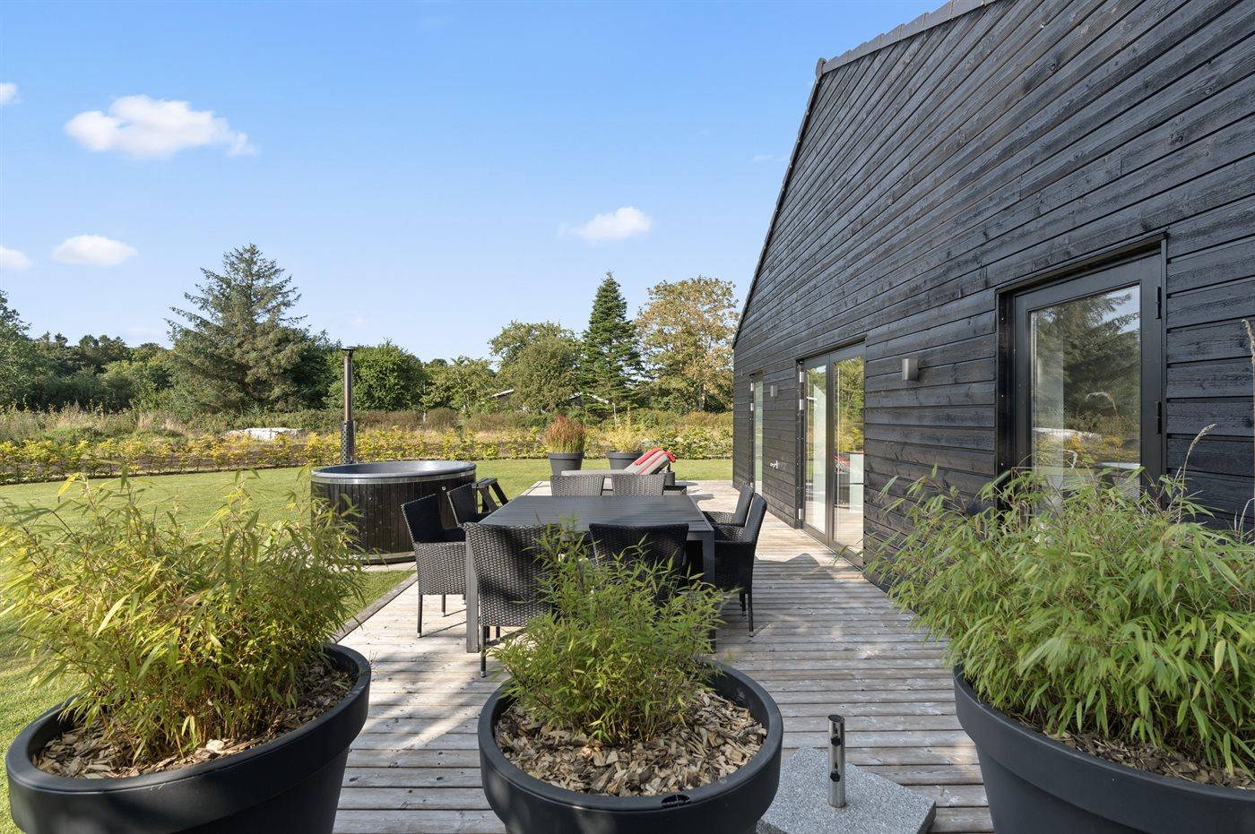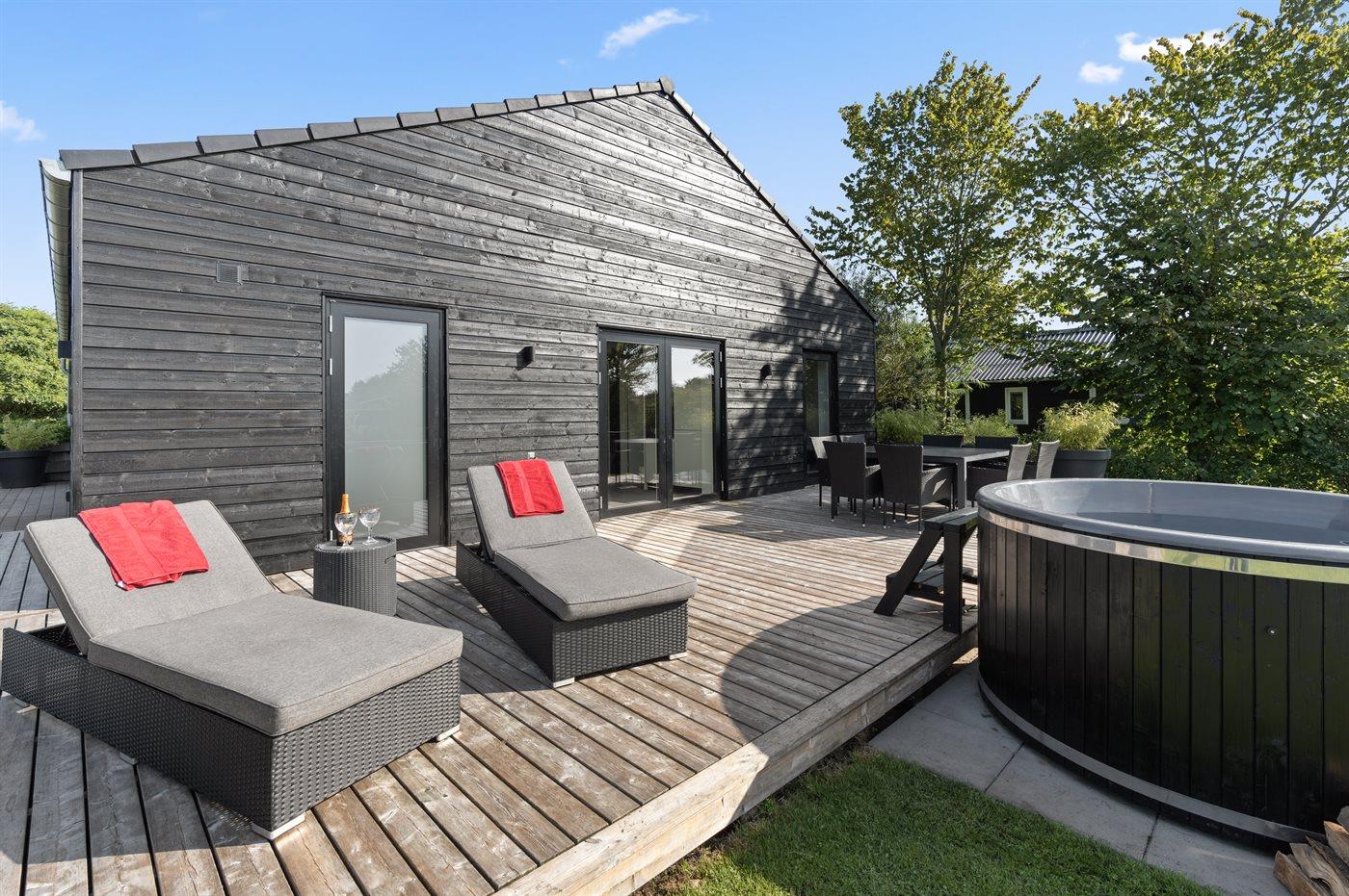 Udelivet er en oplevelse i sig selv, da der findes en dejlig overdækket terrasse og et stort, åbent og sydvestvendt terrasseområde. Her kan du nyde solen hele dagen igennem og se den gå ned i horisonten, mens du slapper af i husets vildmarkskar. En helt særlig oplevelse især når natten falder på og du kan betragte stjernerne på himlen.