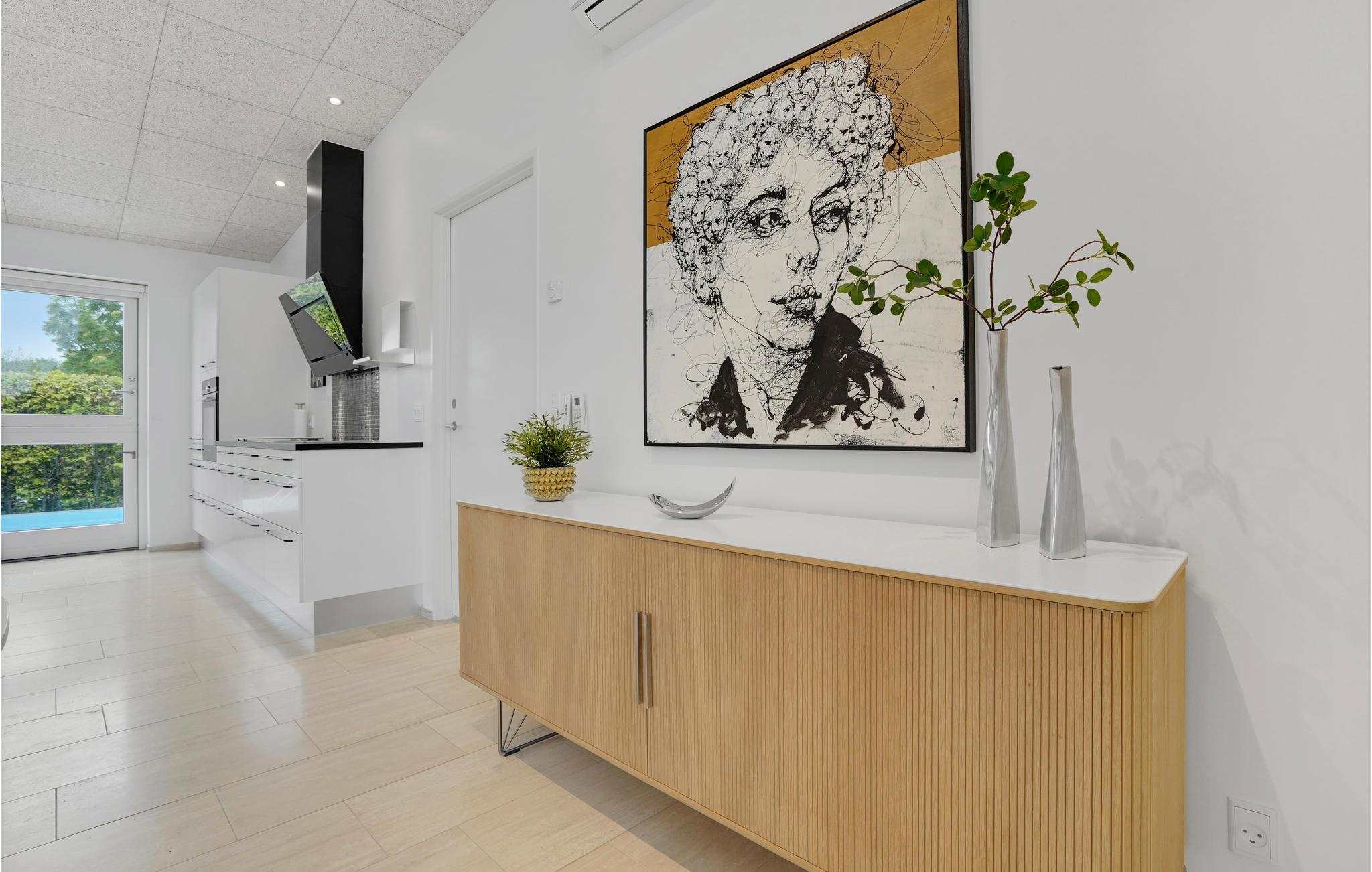 Ved den skønne Diernæs Strand ligger dette dejlige sommerhus med panoramudsigt ud over Lillebælt, og adgang til den fredelige sandstrand. Huset er indrettet til gangbesværede, og har været brugt af kørestolsbruger. Den udendørs swimmingpool er åben fra medio maj til ultimo september, og er opvarmet med varmepumpe (afhængig af vejret og udetemperaturer). Huset har terrasser hele vejen rundt om huset, heraf en overdækket med udsigt ud over vandet. Indendørs emmer sommerhuset af kvalitet, og har mange finesser som elektriske gardiner, amerikansk køleskab og alle faciliteter, der er med til at give en god ferie. Nyd den fantastiske udsigt ud over vandet, eller slap af med sol og badning i poolen bag huset.